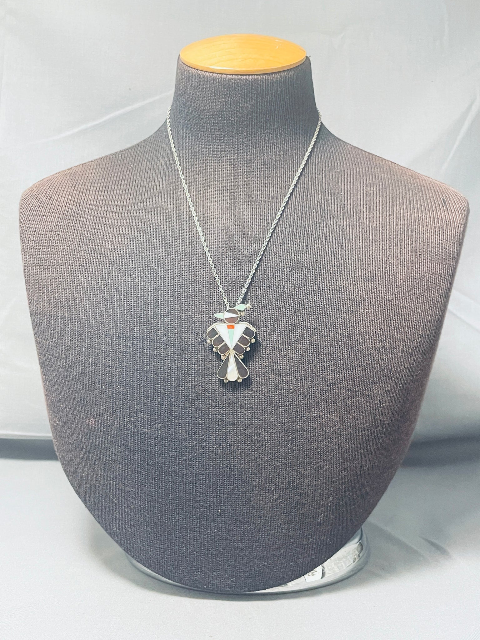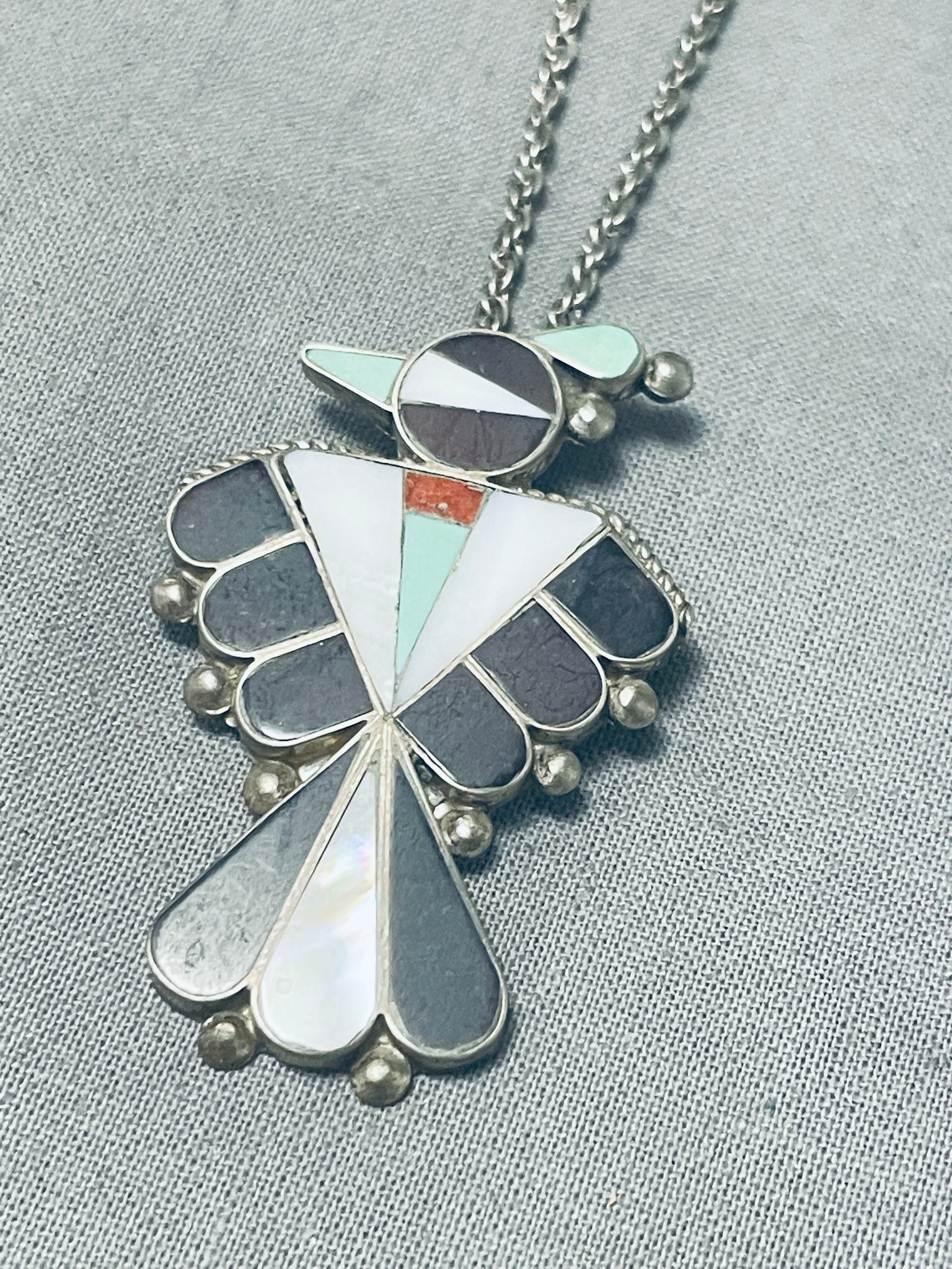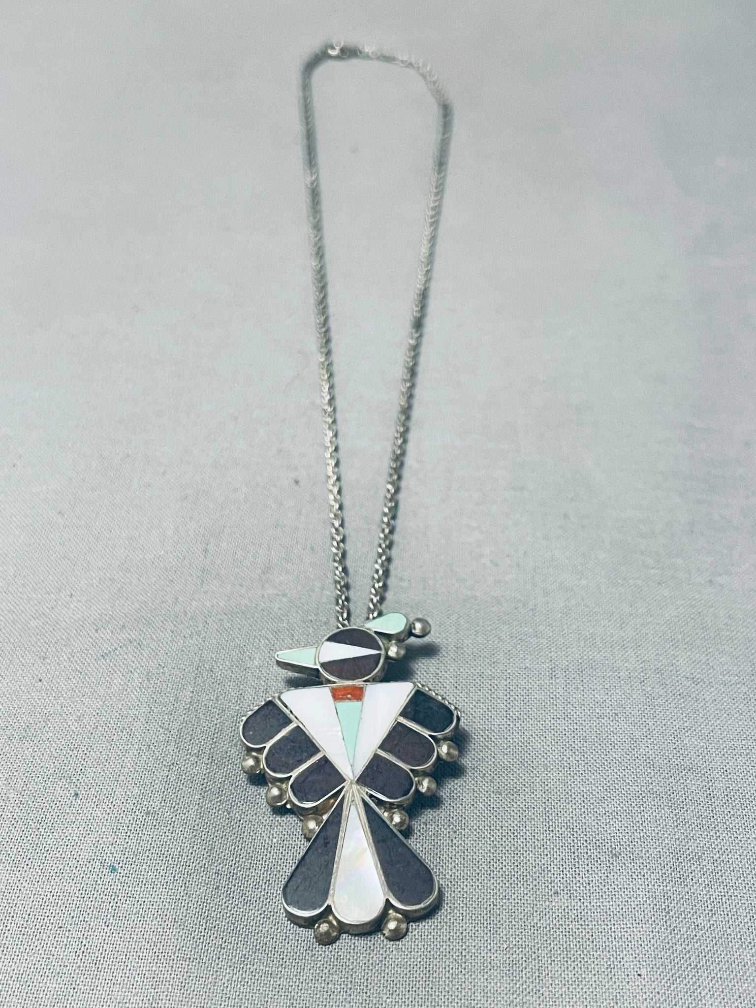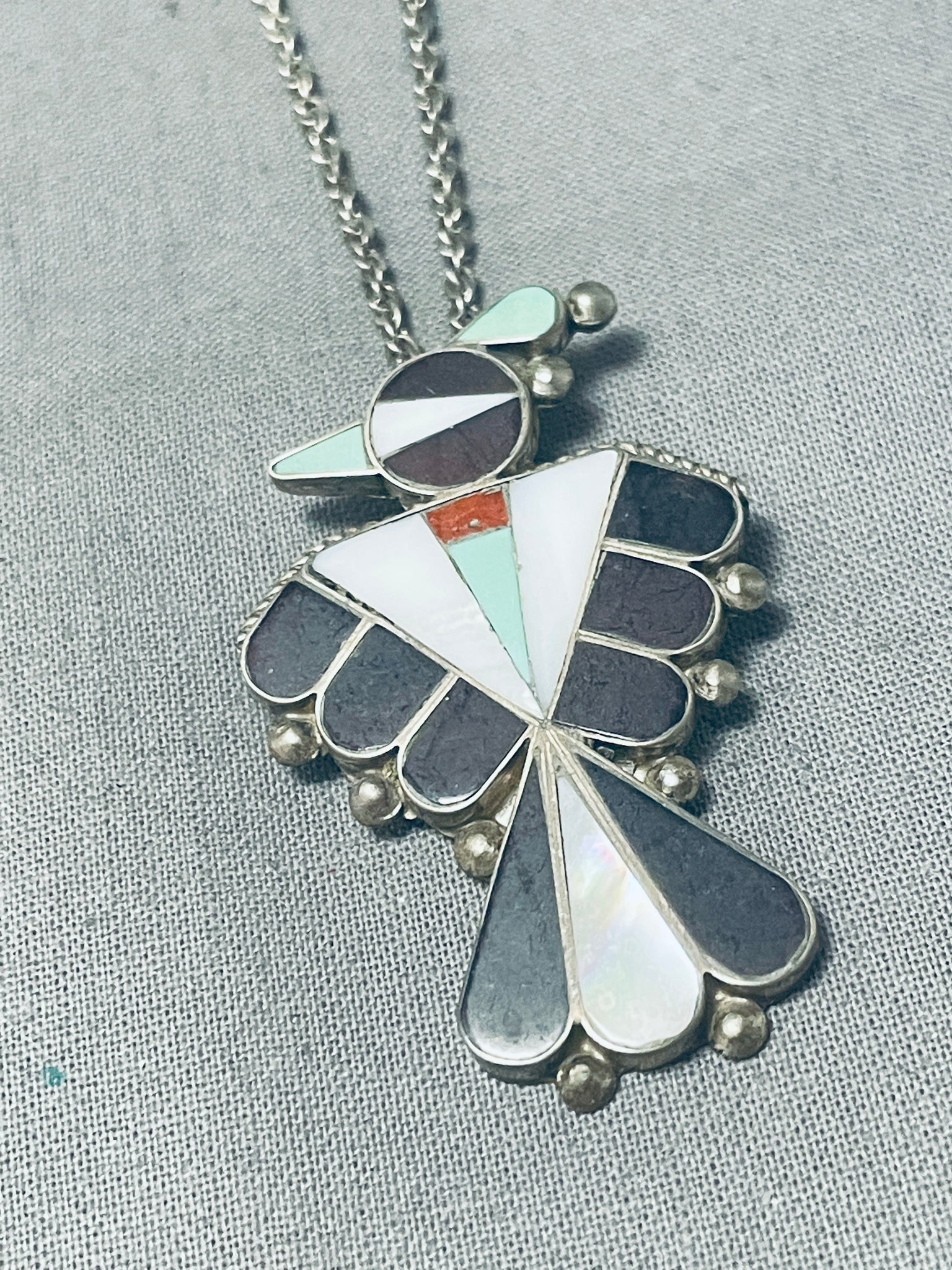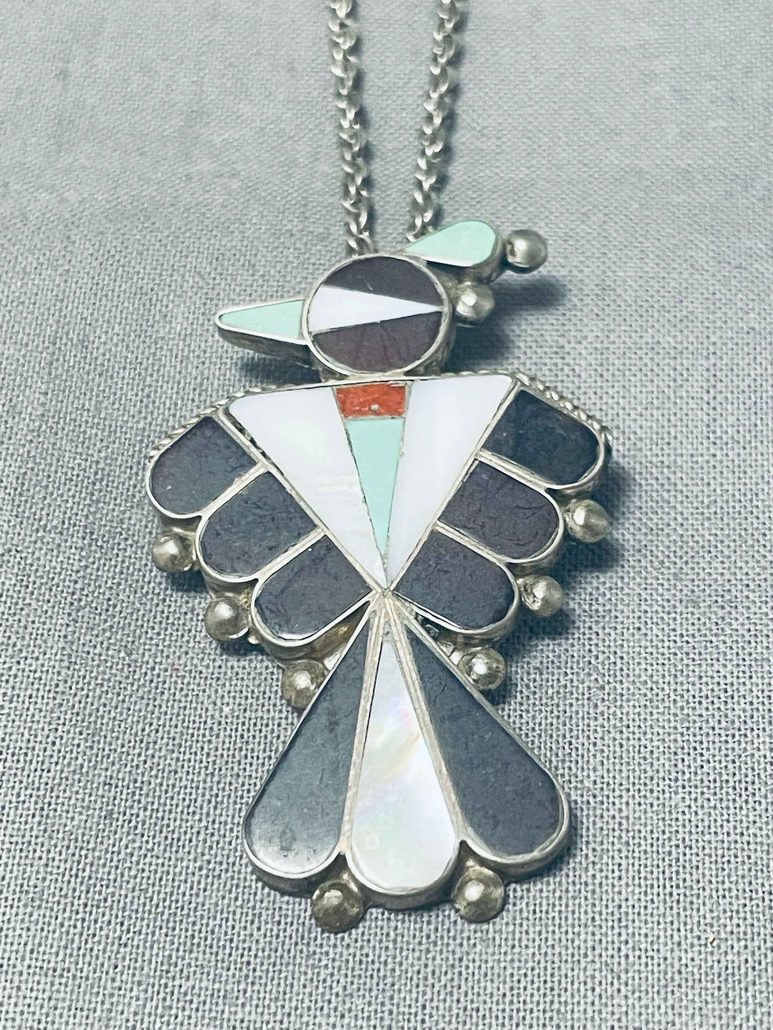 Impressive Vintage Native American Zuni Turquoise Jet Sterling Silver Thunderbird Necklace