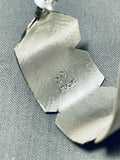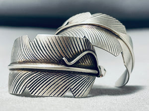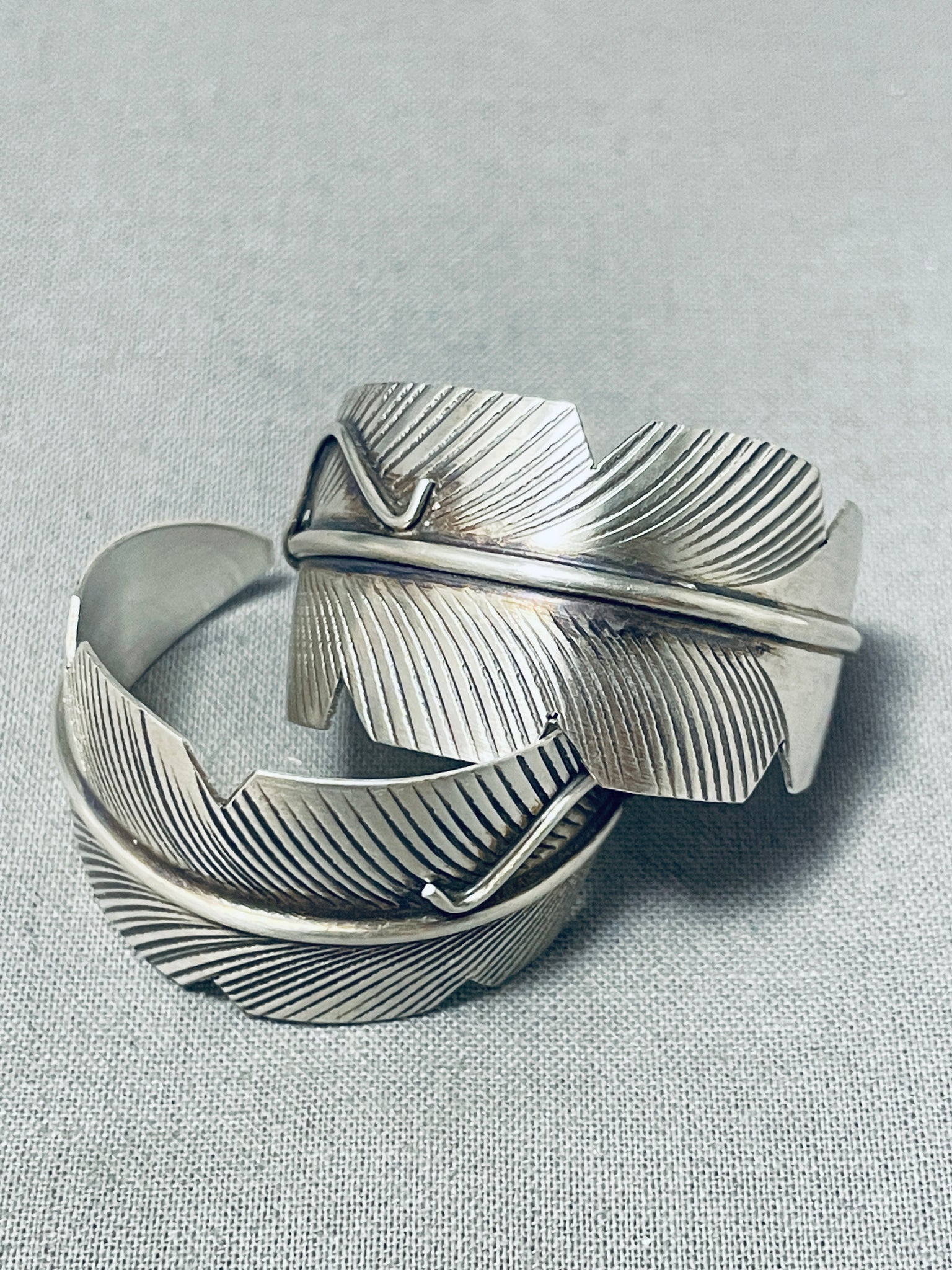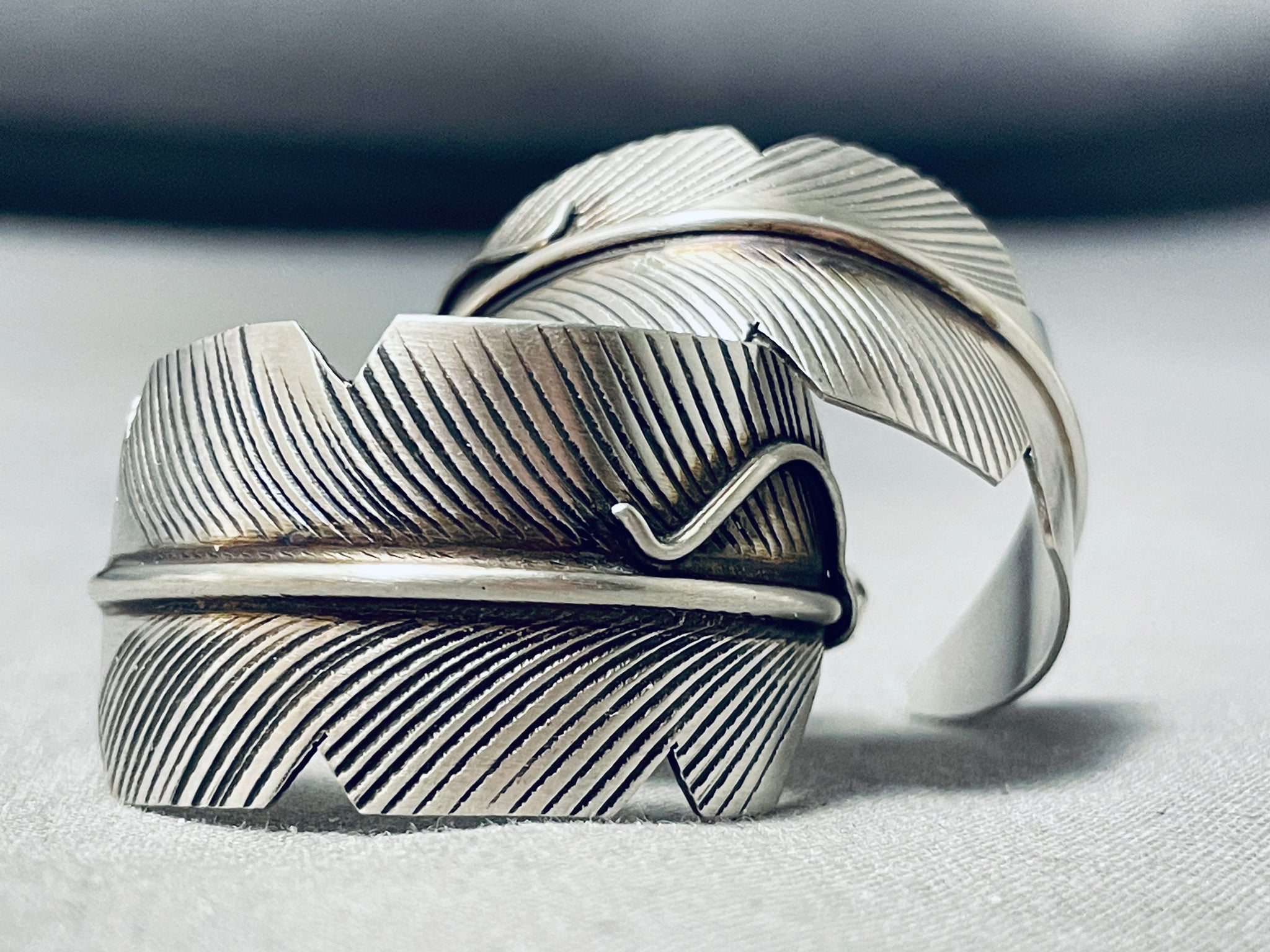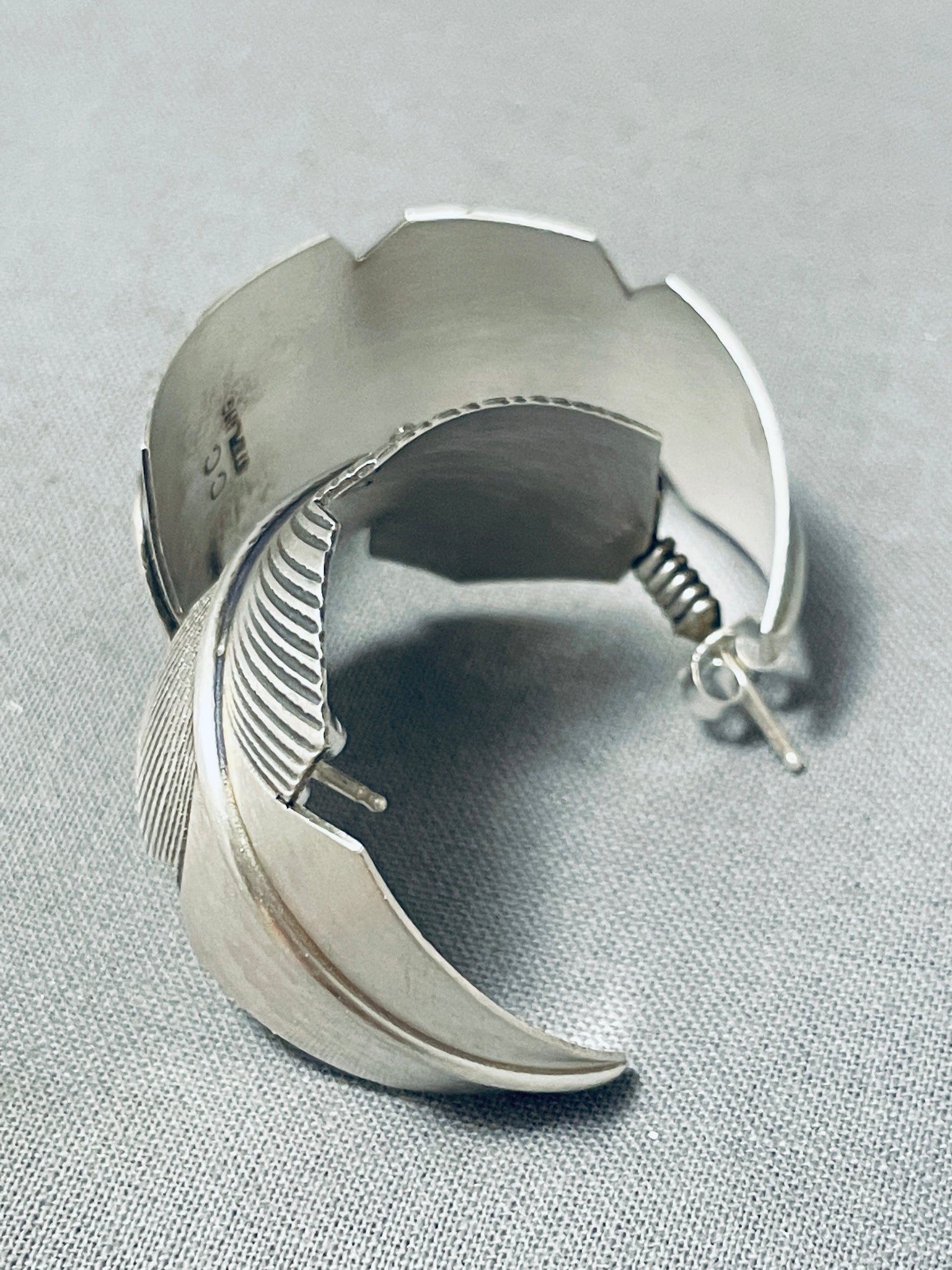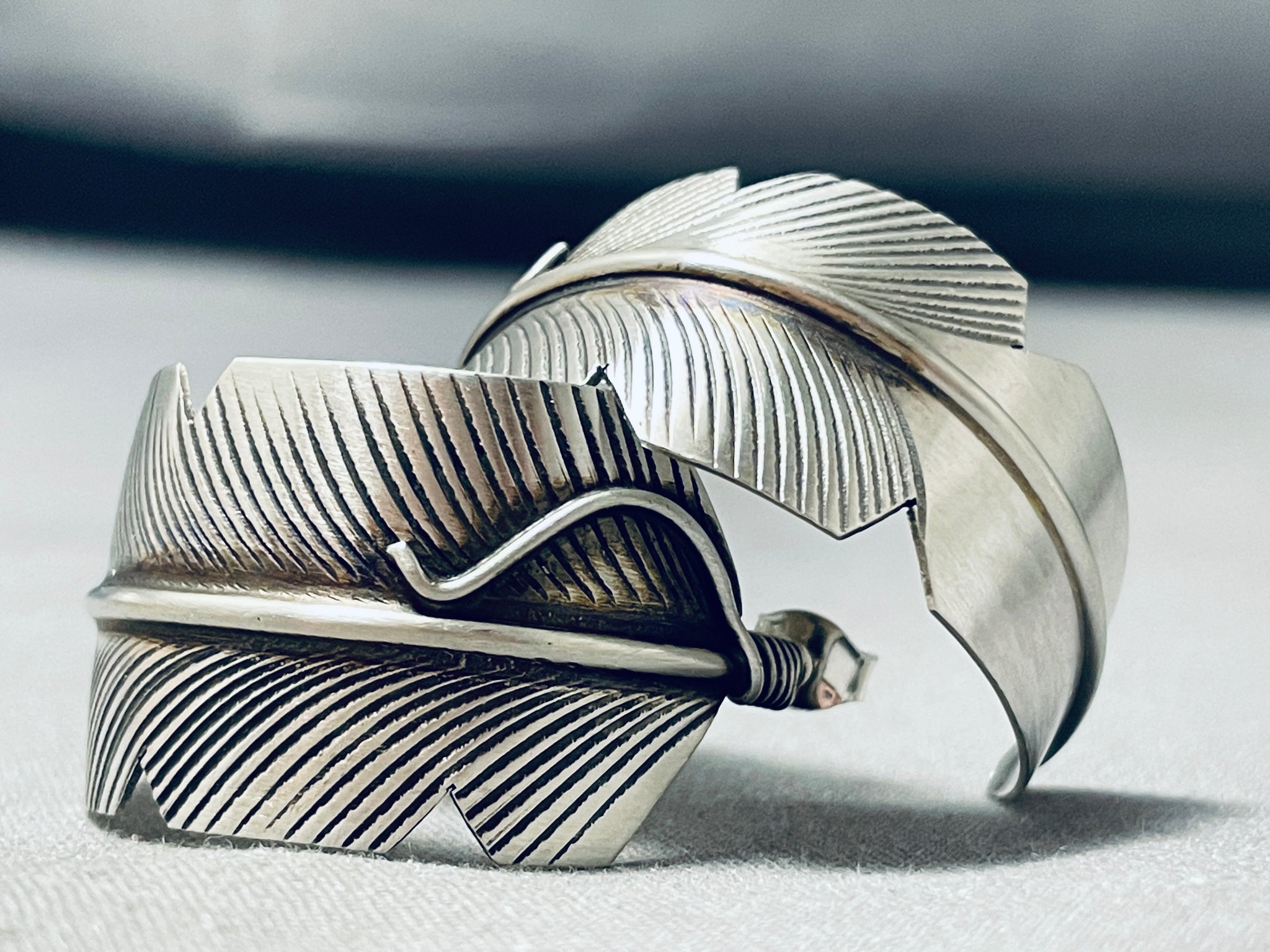 Incredible Native American Navajo Handcarved Sterling Silver Feather Hoop Earrings