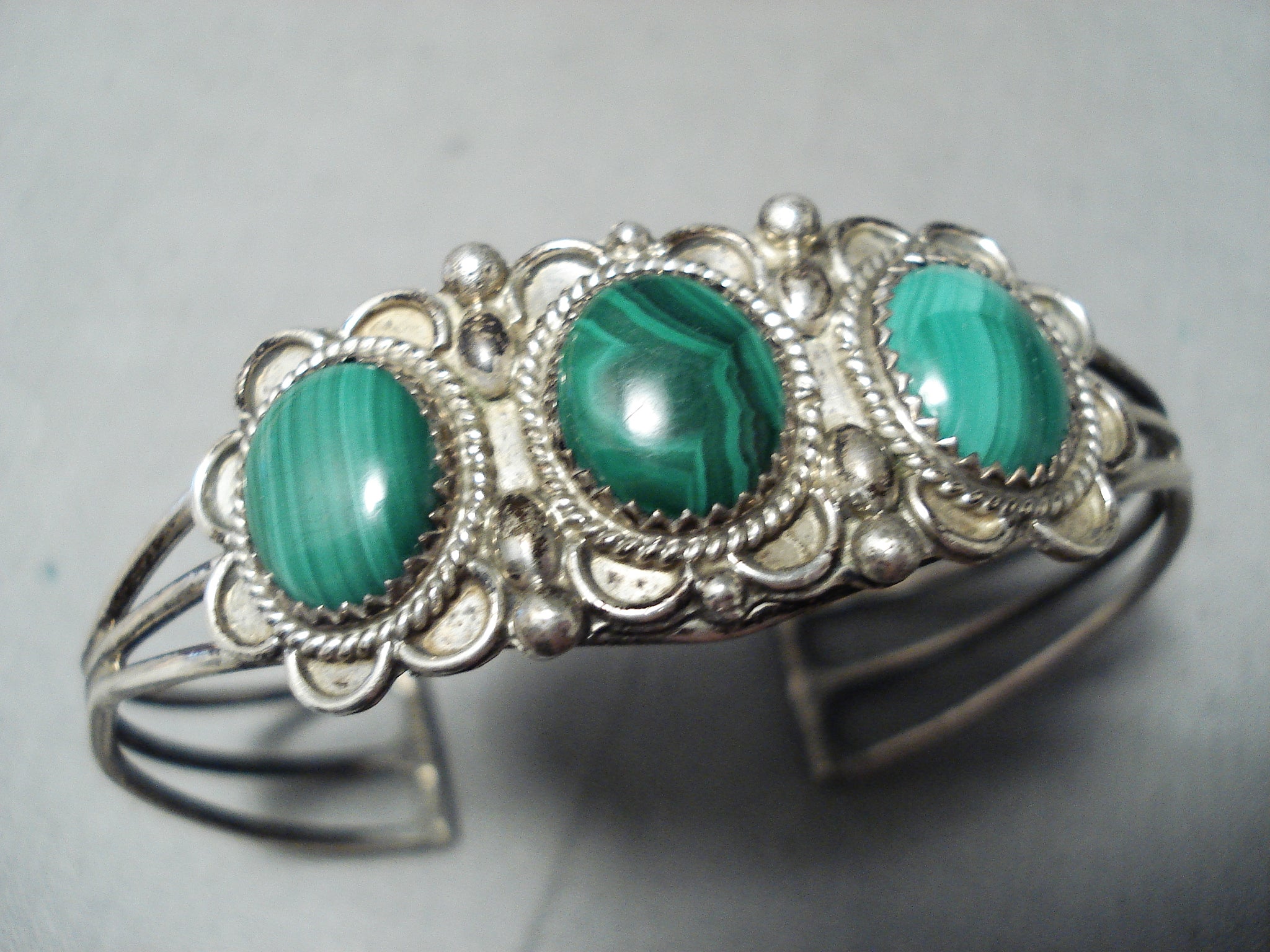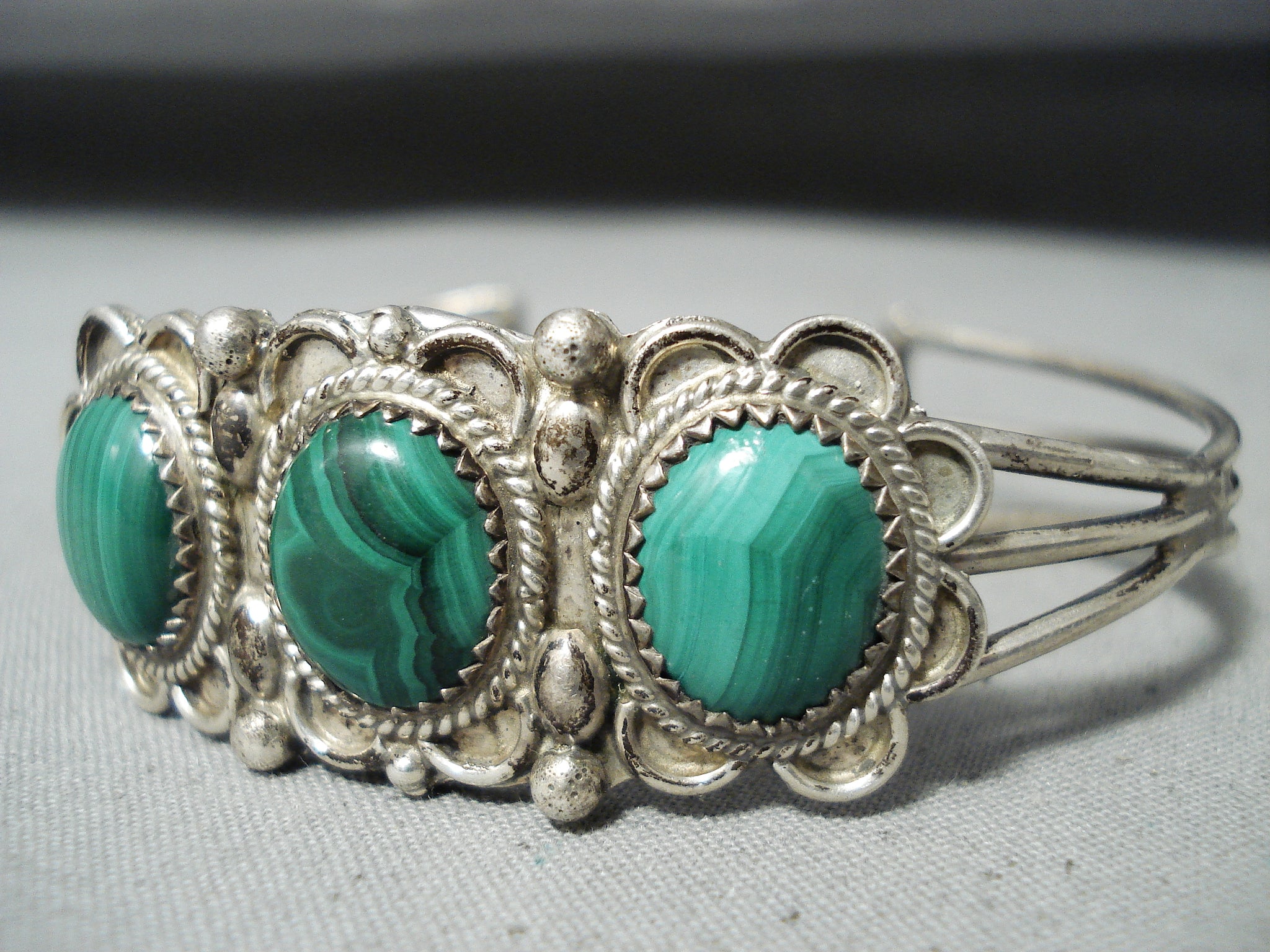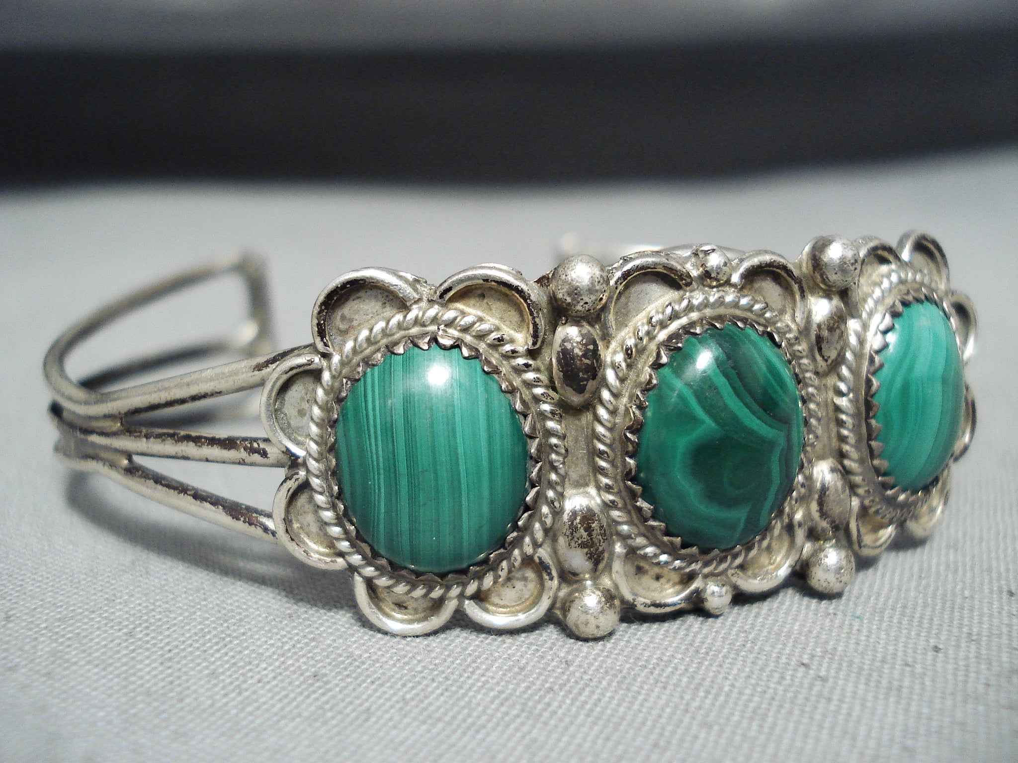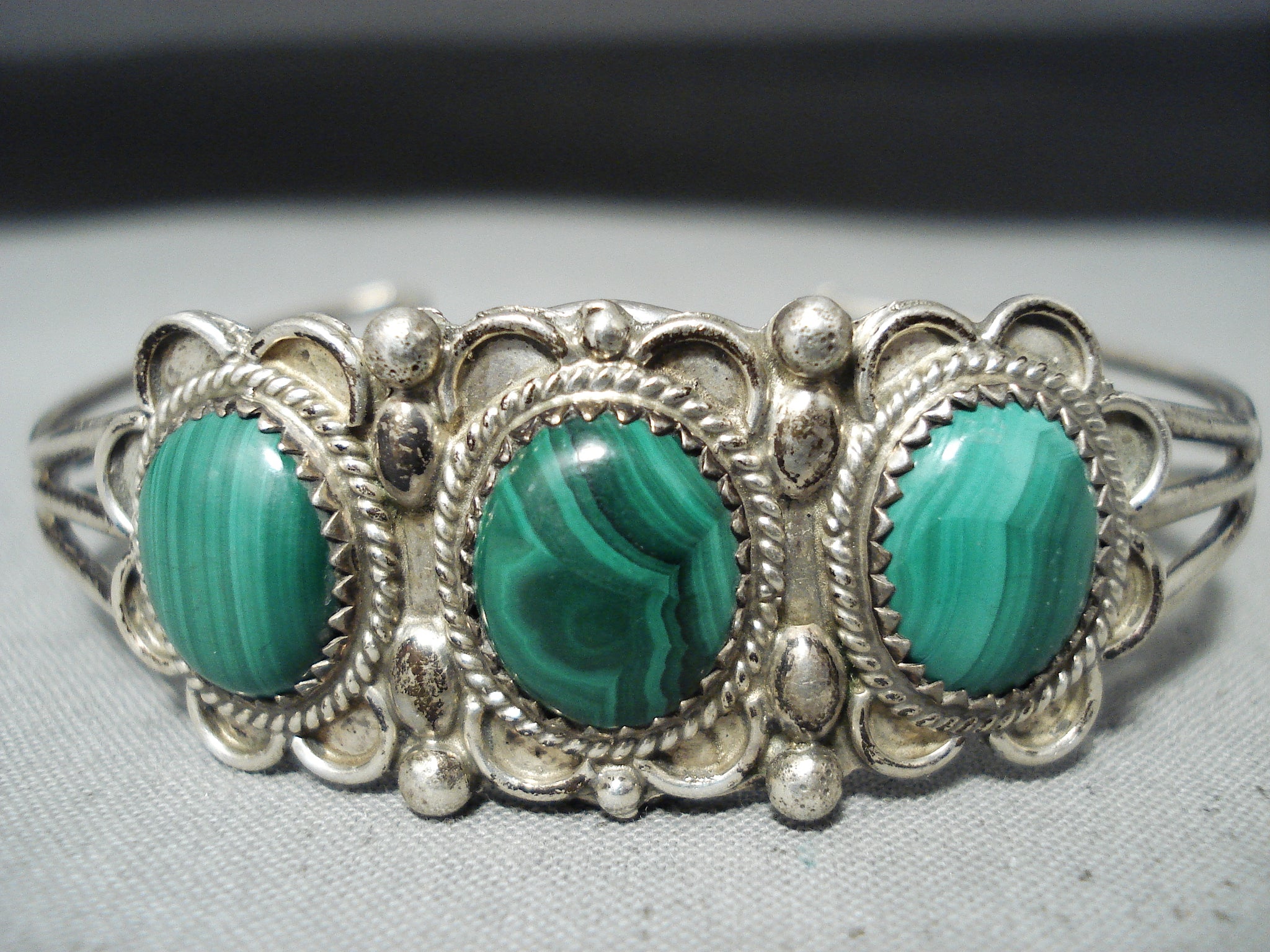 Incredible Vintage Native American Navajo 3 Malachite Sterling Silver Bracelet