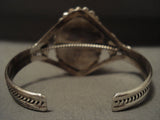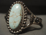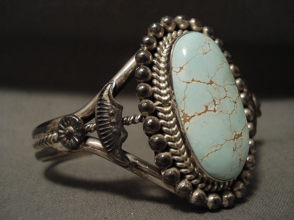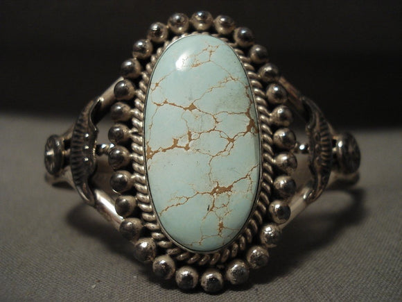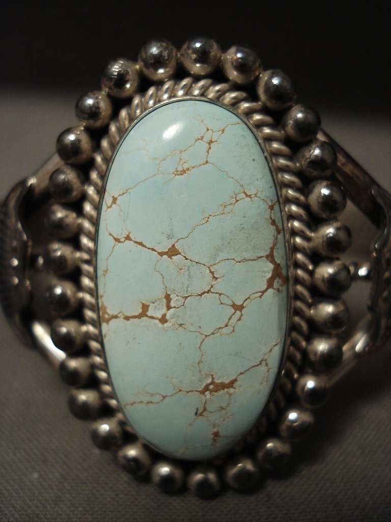 This is an exquisite Navajo Native American jewelry Native American jewelry museum quality silver bracelet. This absolutely incredible piece contains a huge center dome shaped, natural, Number 8 turquoise stone. This stone is natural and untreated unlike others you may see. Surrounding the stone are wonderful silver works that include large silver raindrops with accenting silver ropes. Flanking the sides of the stone are stunning silver fan flanks with accenting silver shells. This bracelet includes a wonderful triple silver shank cuff with the center being hand twisted. The center stone measures around 1-1/8" x 5/8". The width of the bracelet measures around 1-1/2". Signed by Navajo Native American jewelry Native American jewelry artist, Spencer Family . Sterling silver, marked. The inside end to end measures around 5-1/4" with an additional 3/4" gap. Sturdy 33 grams.