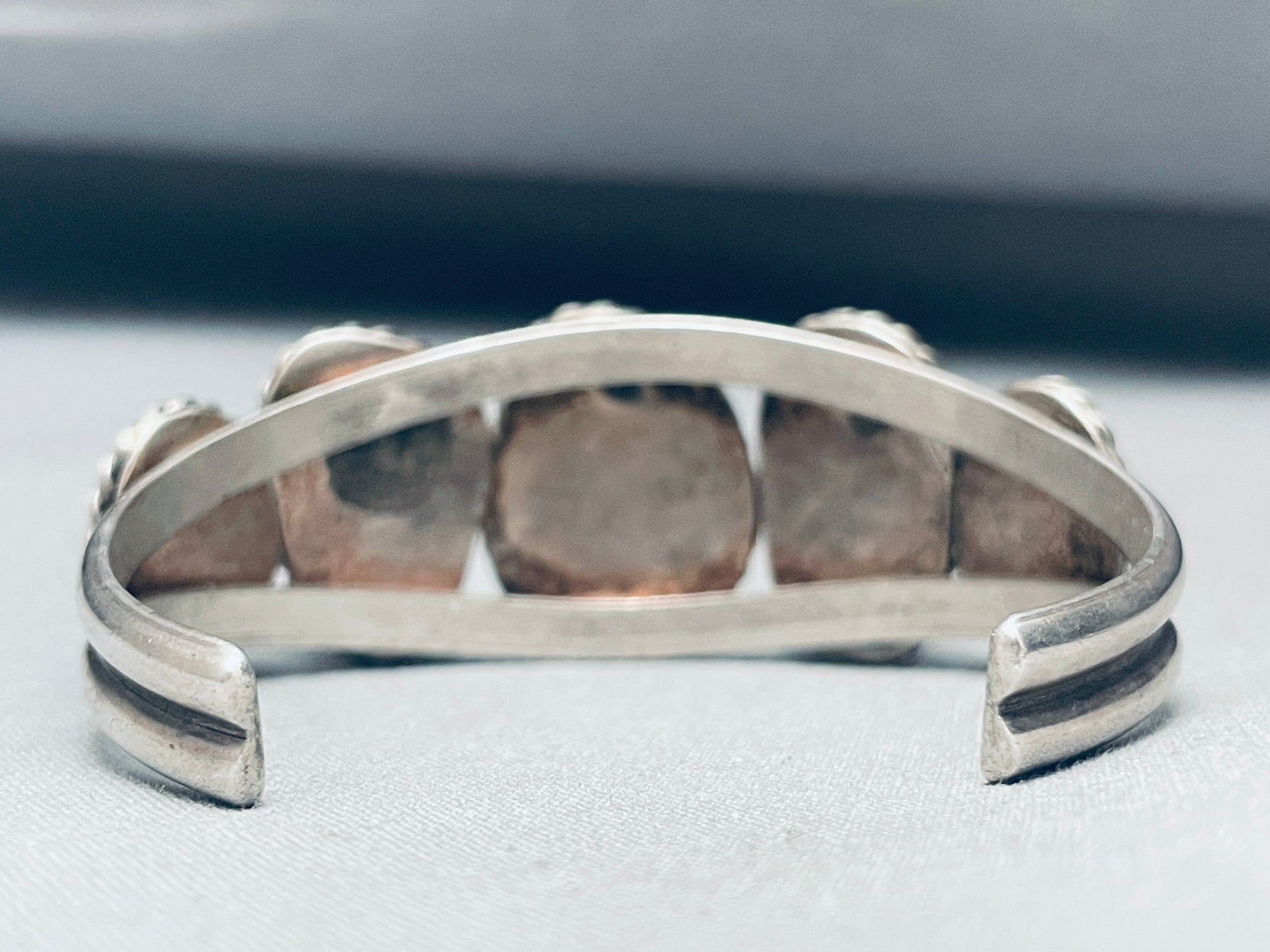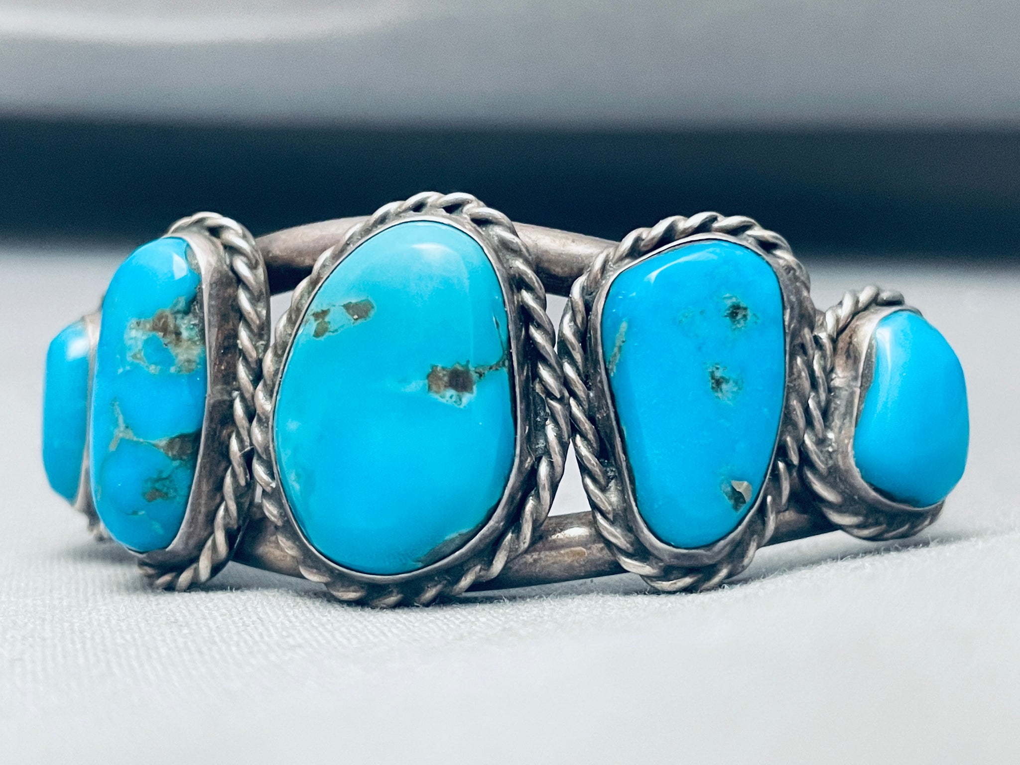 This is an exquisite vintage Navajo five stone silver bracelet. This incredible bracelet contains five large chunky Sleeping Beauty turquoise stones. The stones beautifully graduate in size towards the center. Surrounding the stones are phenomenal thick silver ropes. This bracelet contains a sturdy double silver shank cuff that graduates in width towards the center. The center stone measures around 7/8" x 5/8". The width of the bracelet measures around 1". Sterling silver. Cir. Mid Century +. The inside end to end measures around 5" with an additional 1-1/4" gap. Sturdy 39 grams.