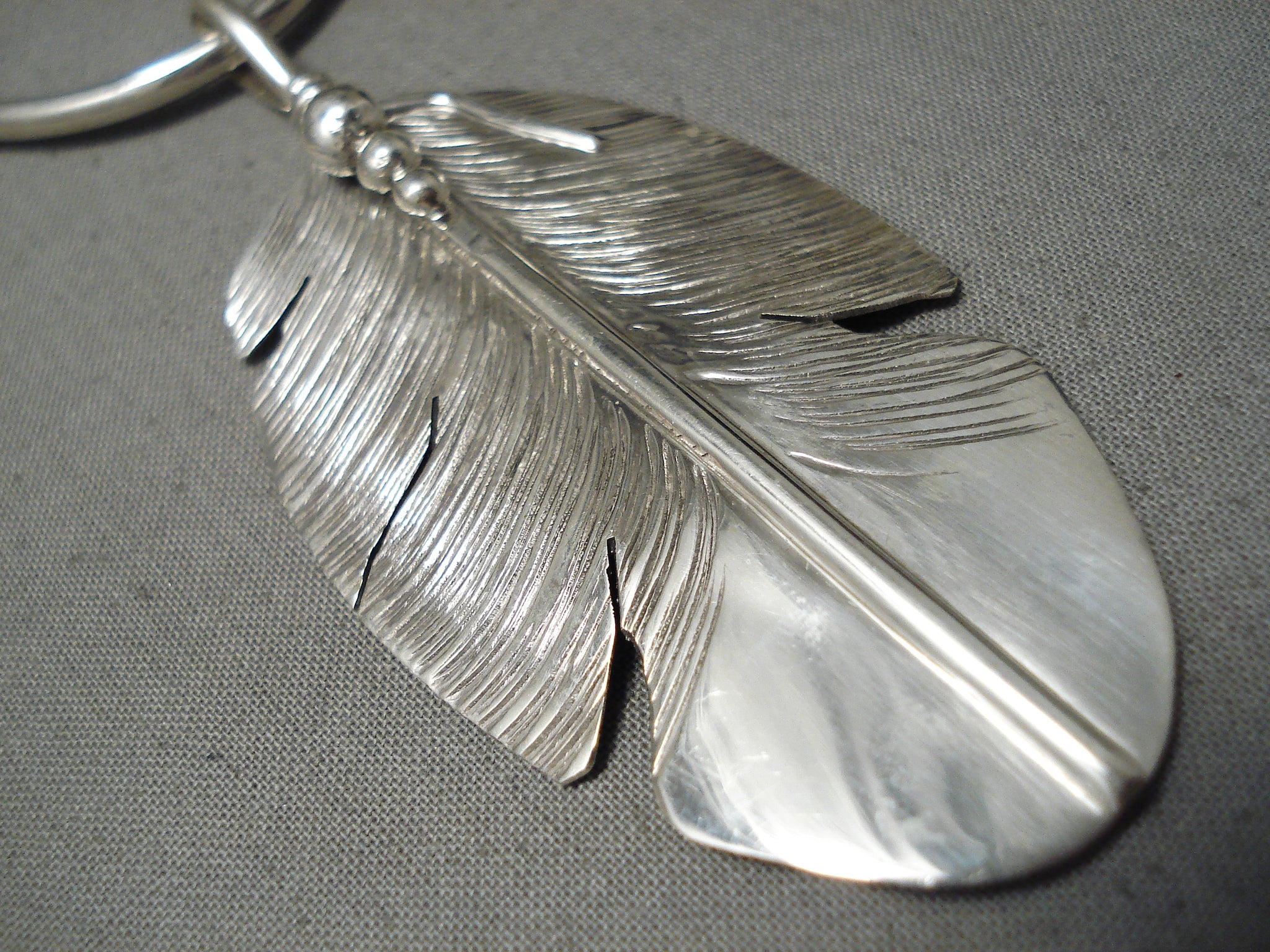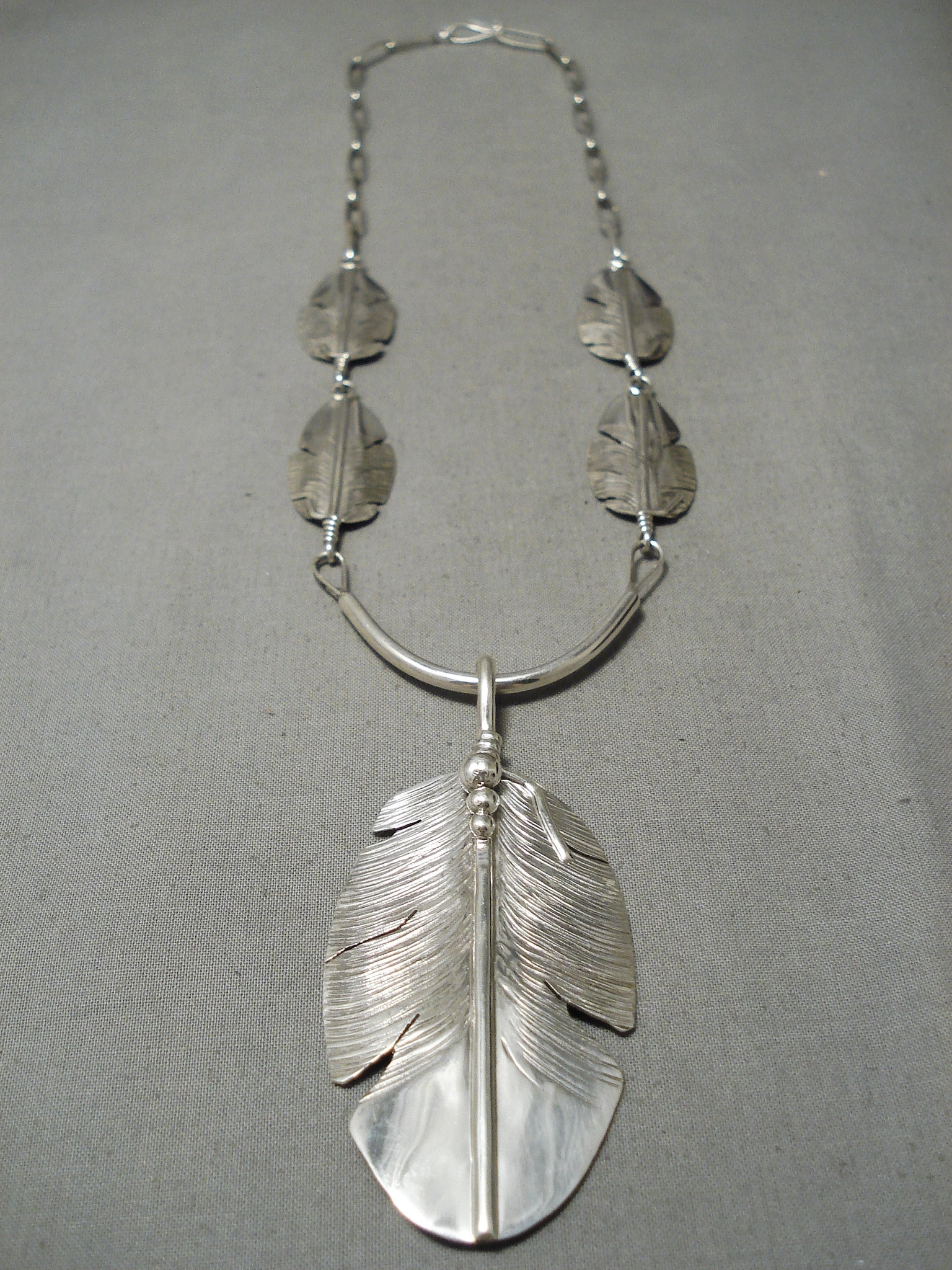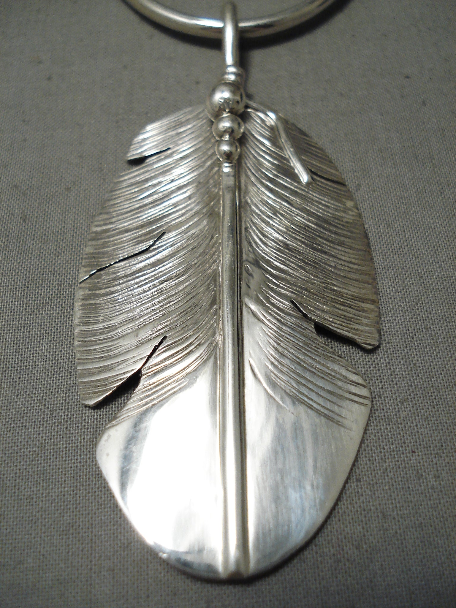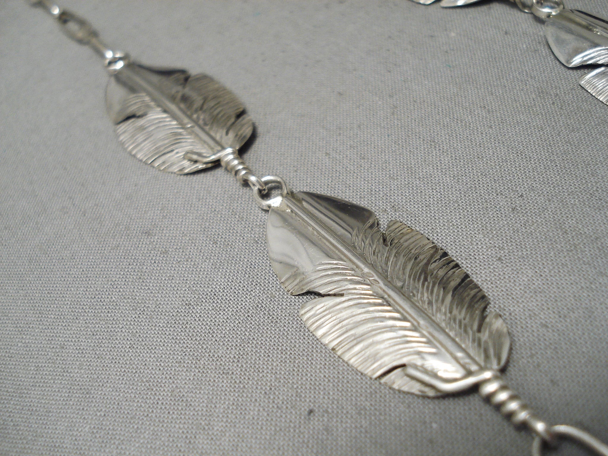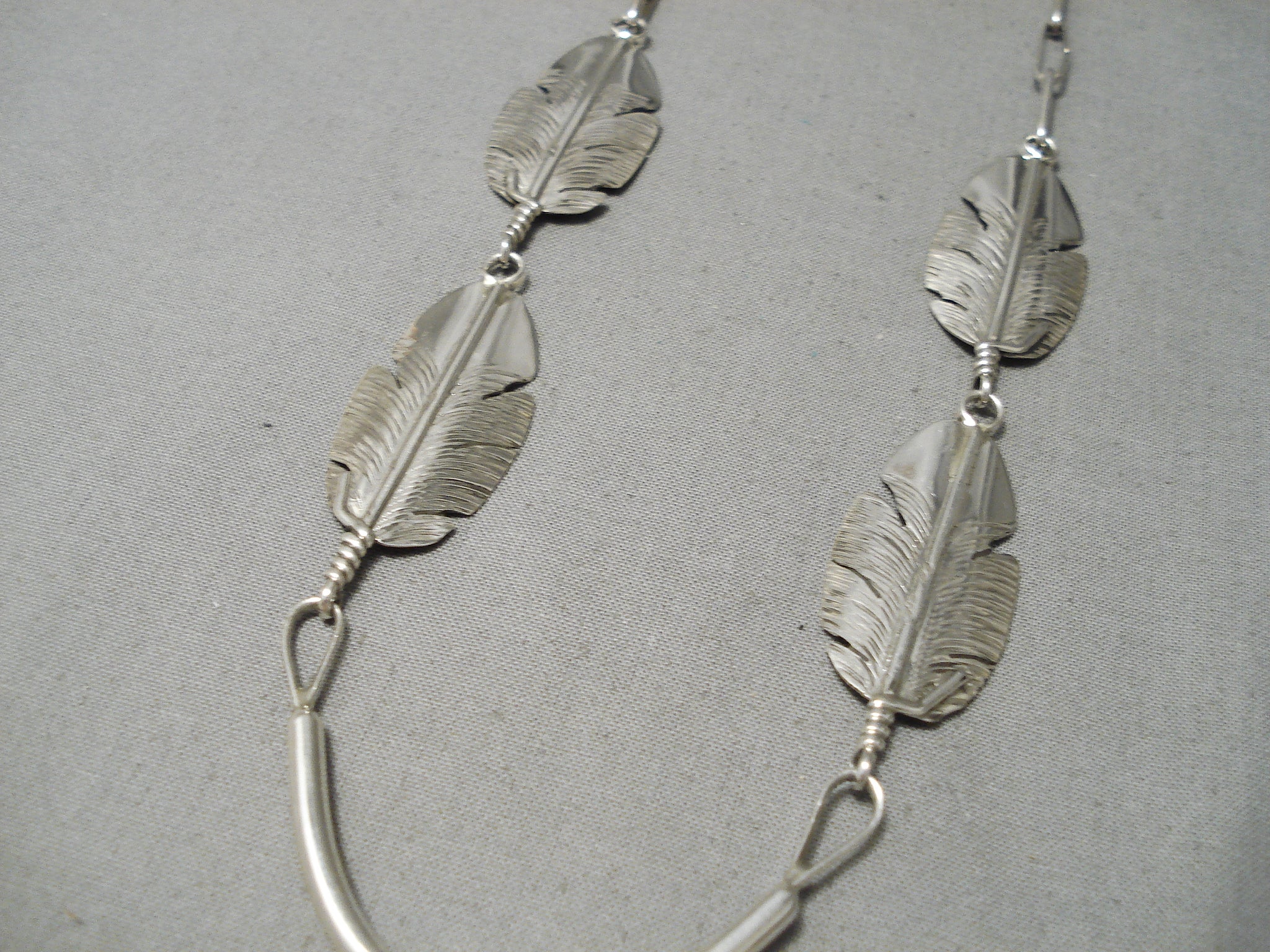 Intricate!! Hand Carved Native American Navajo Sterling Silver Feather Necklace