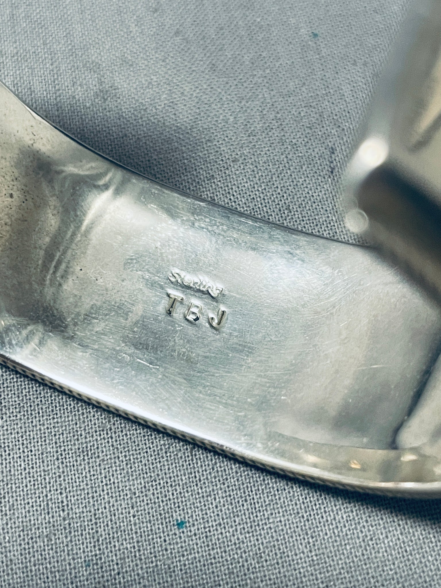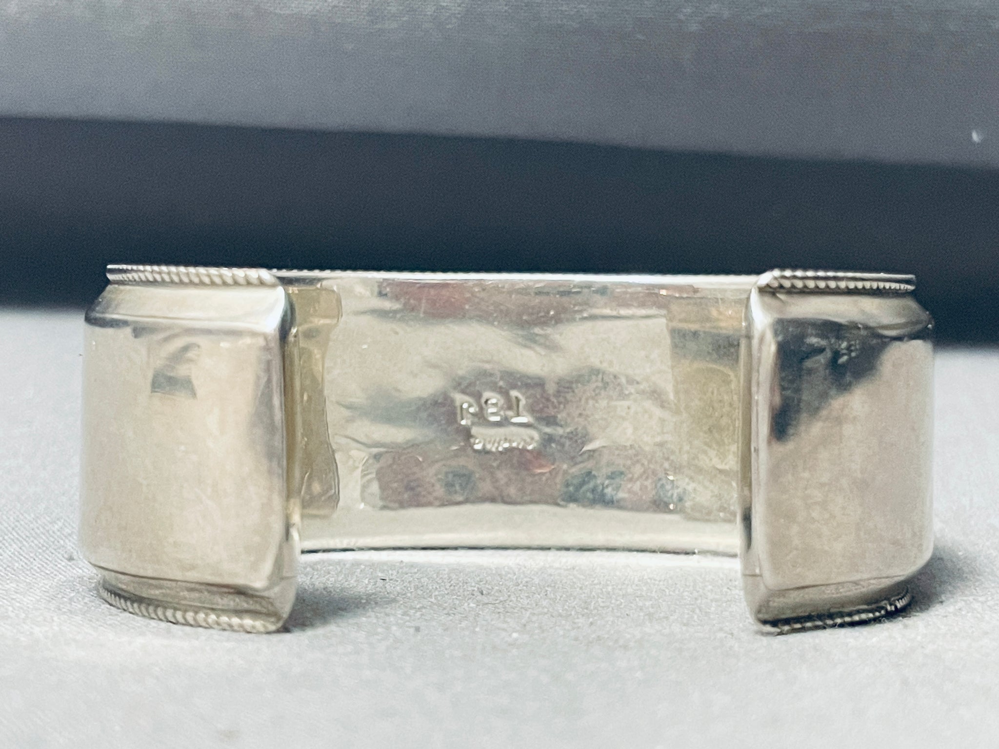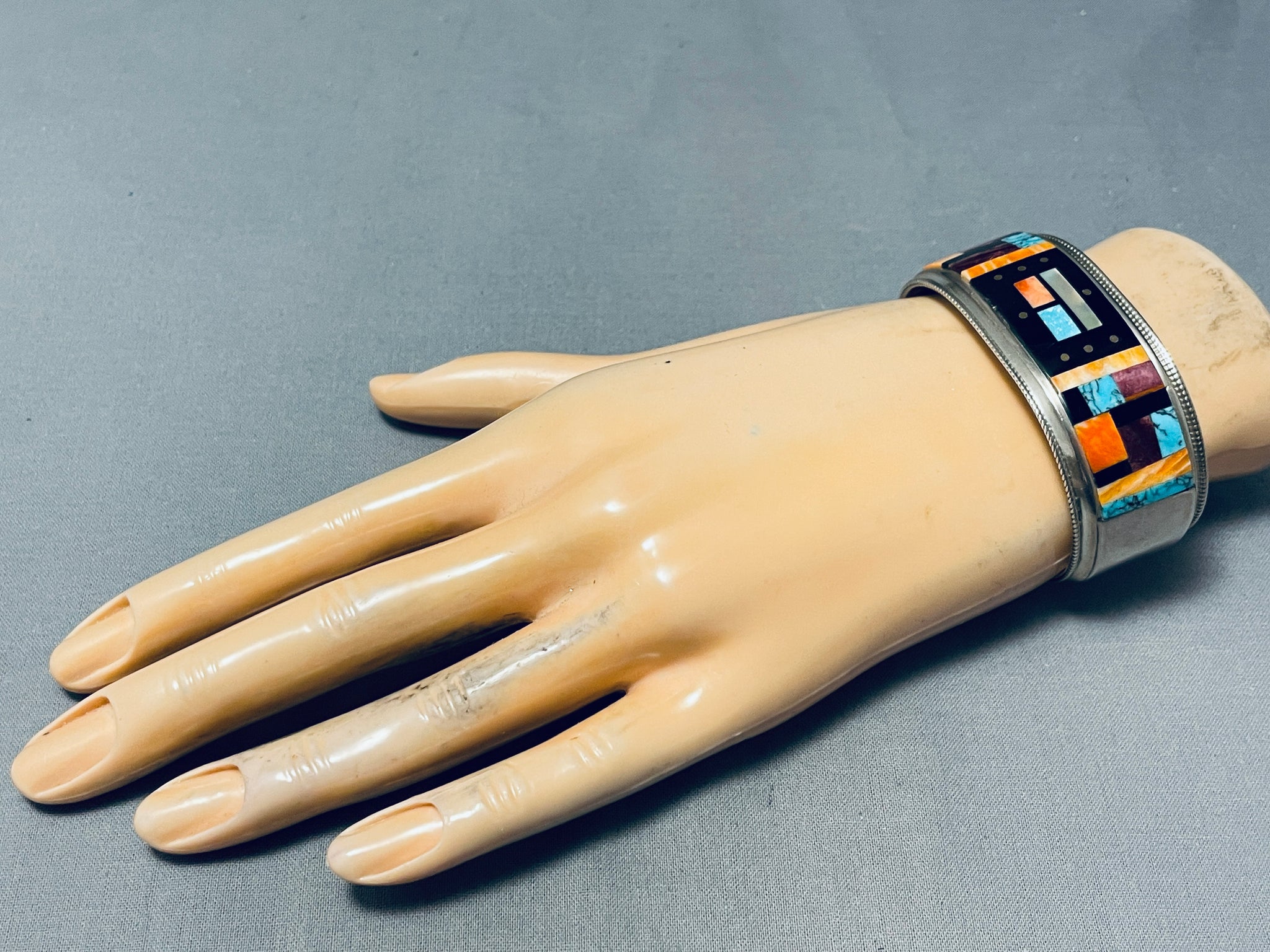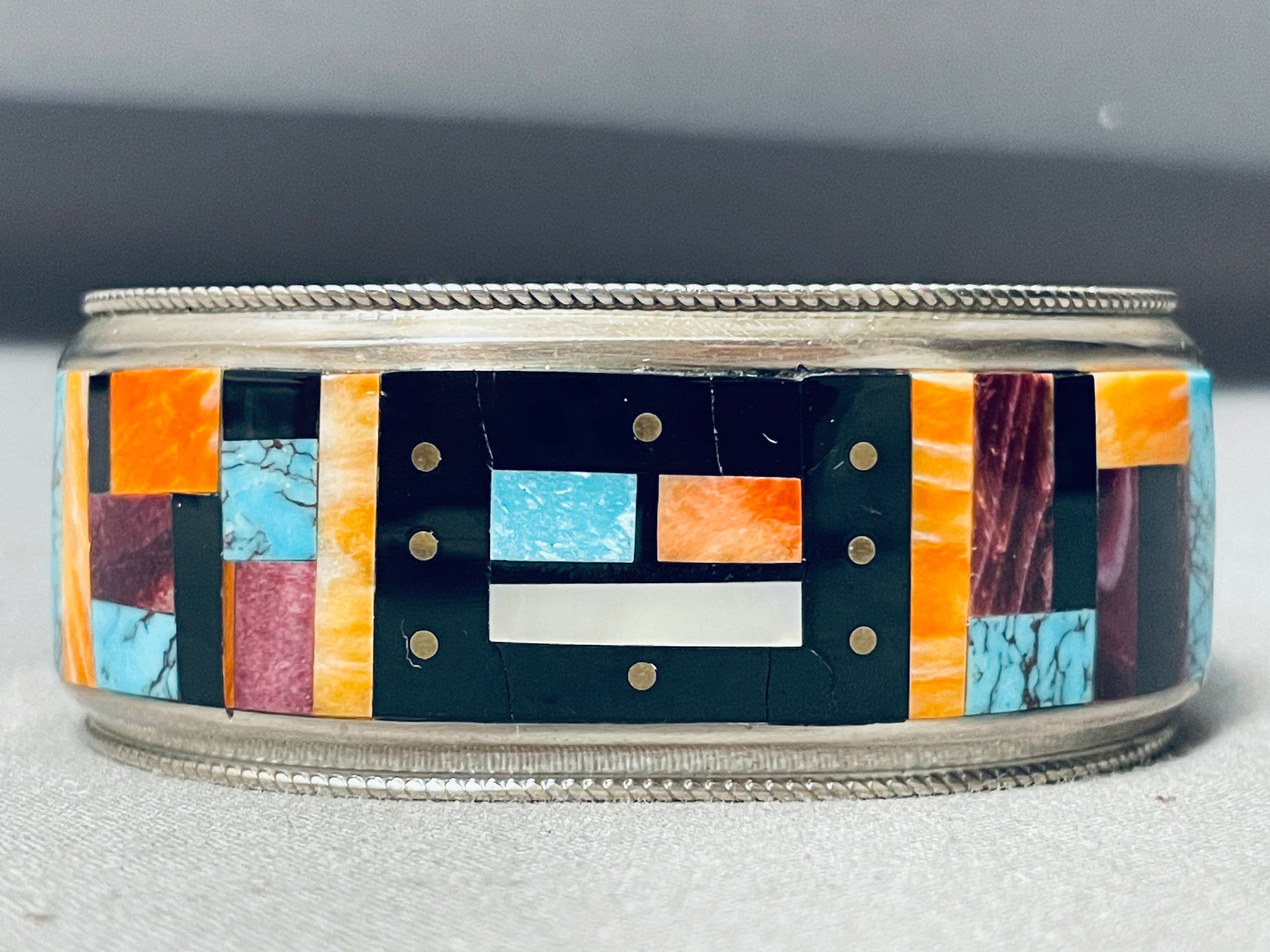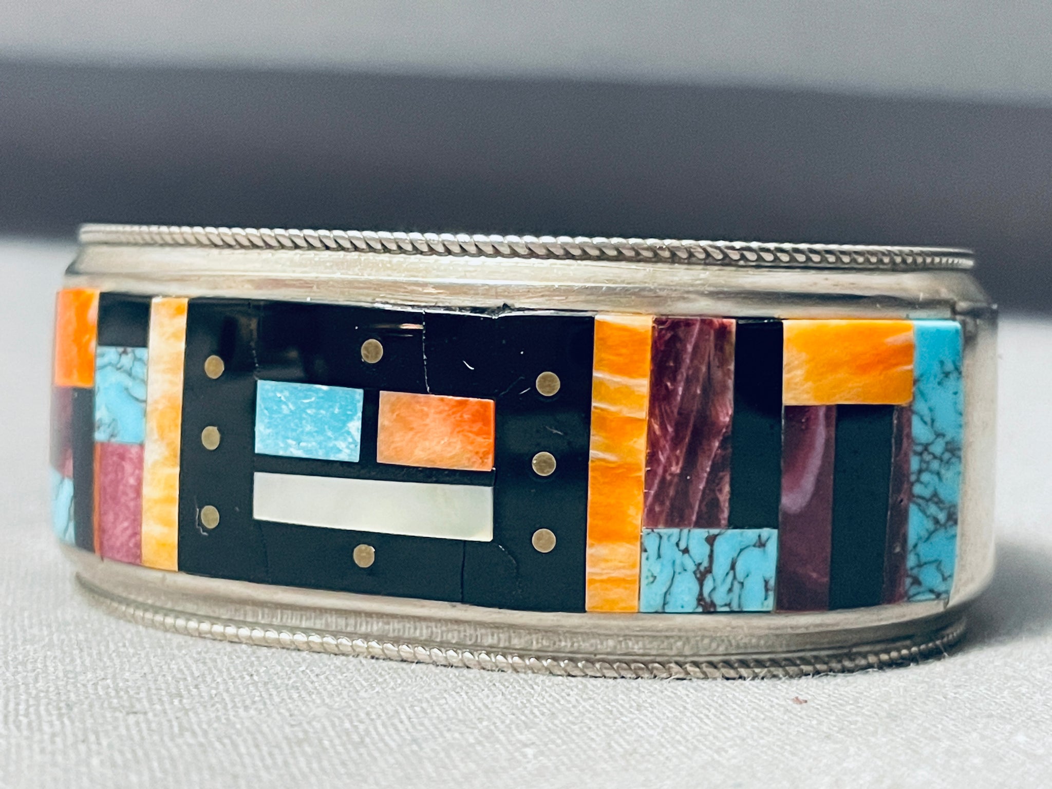 Intricate Native American Navajo Turquoise Shell Sterling Silver Inlay Bracelet Cuff