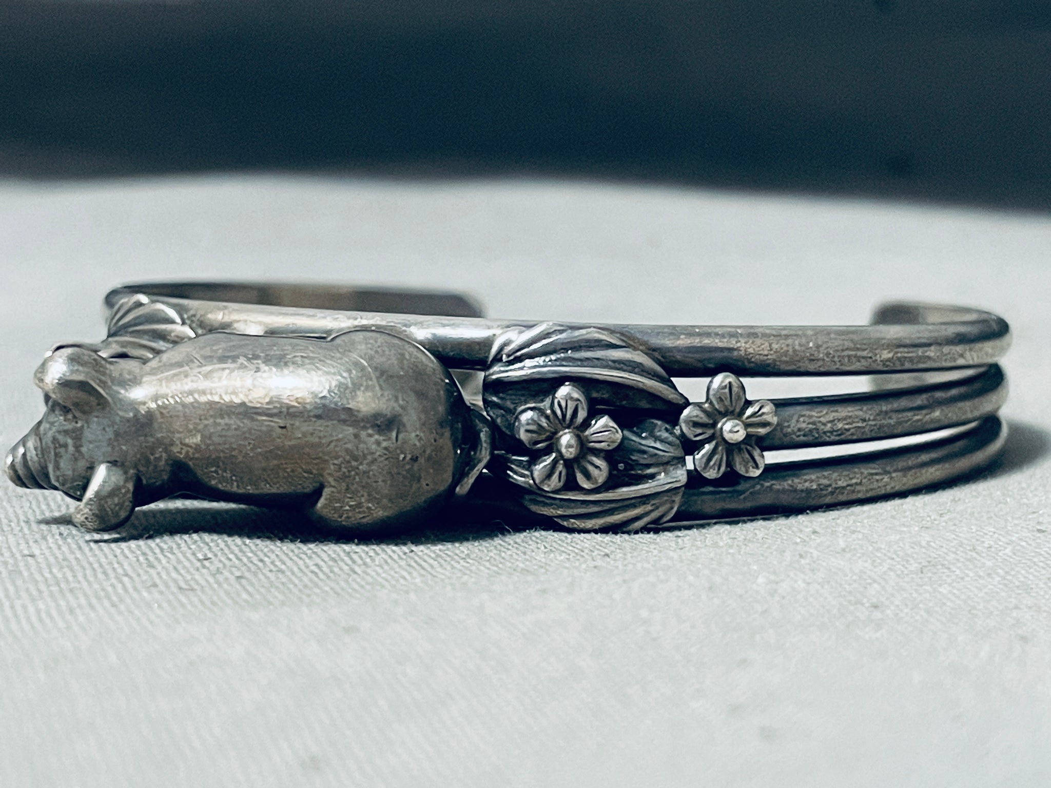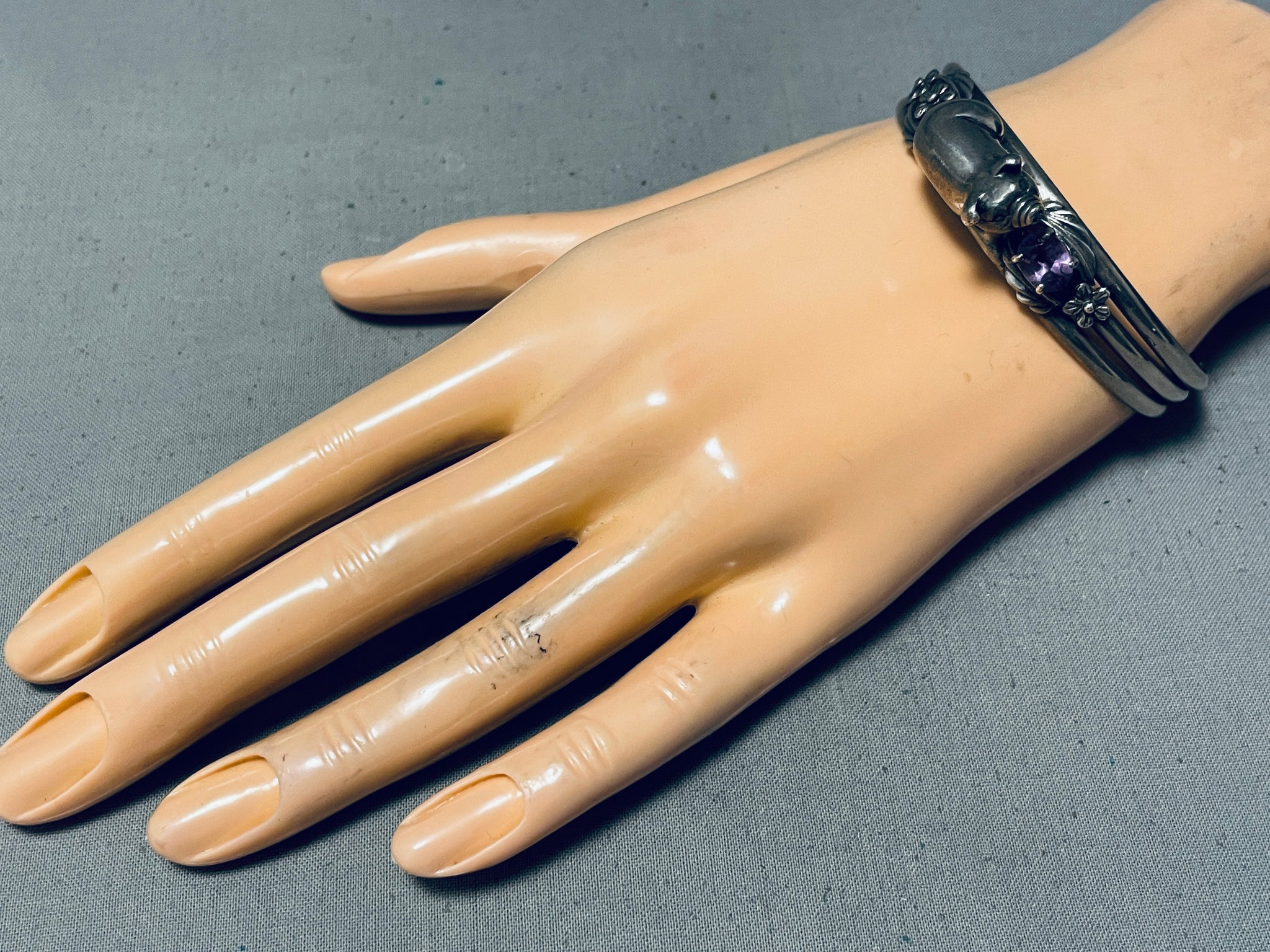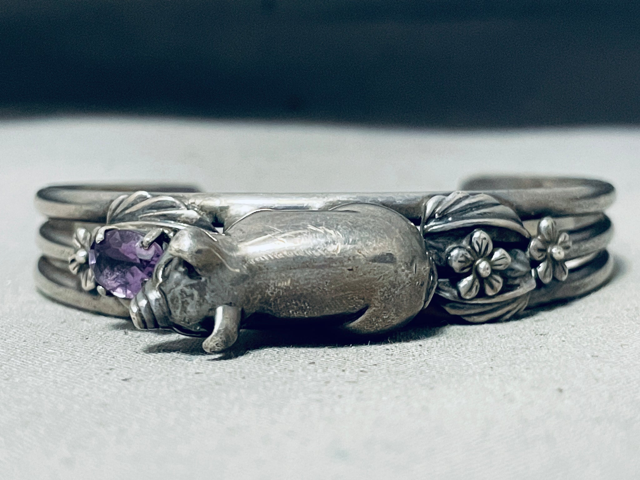 Intricate Pig Vintage Native American Navajo Amethyst Sterling Silver Bracelet Cuff