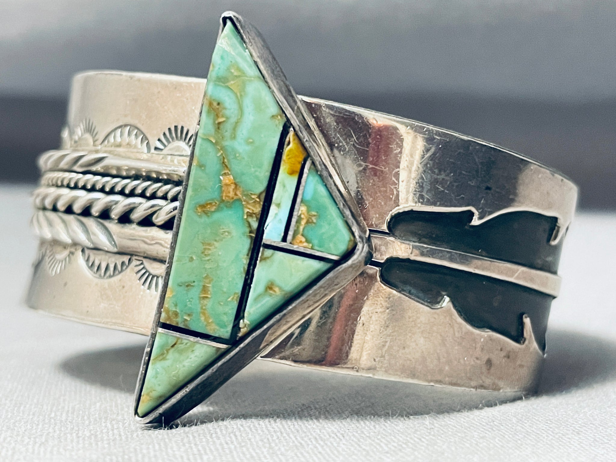Jaw Dropping Vintage Native American Navajo Green Turquoise Sterling Silver Inlay Bracelet
