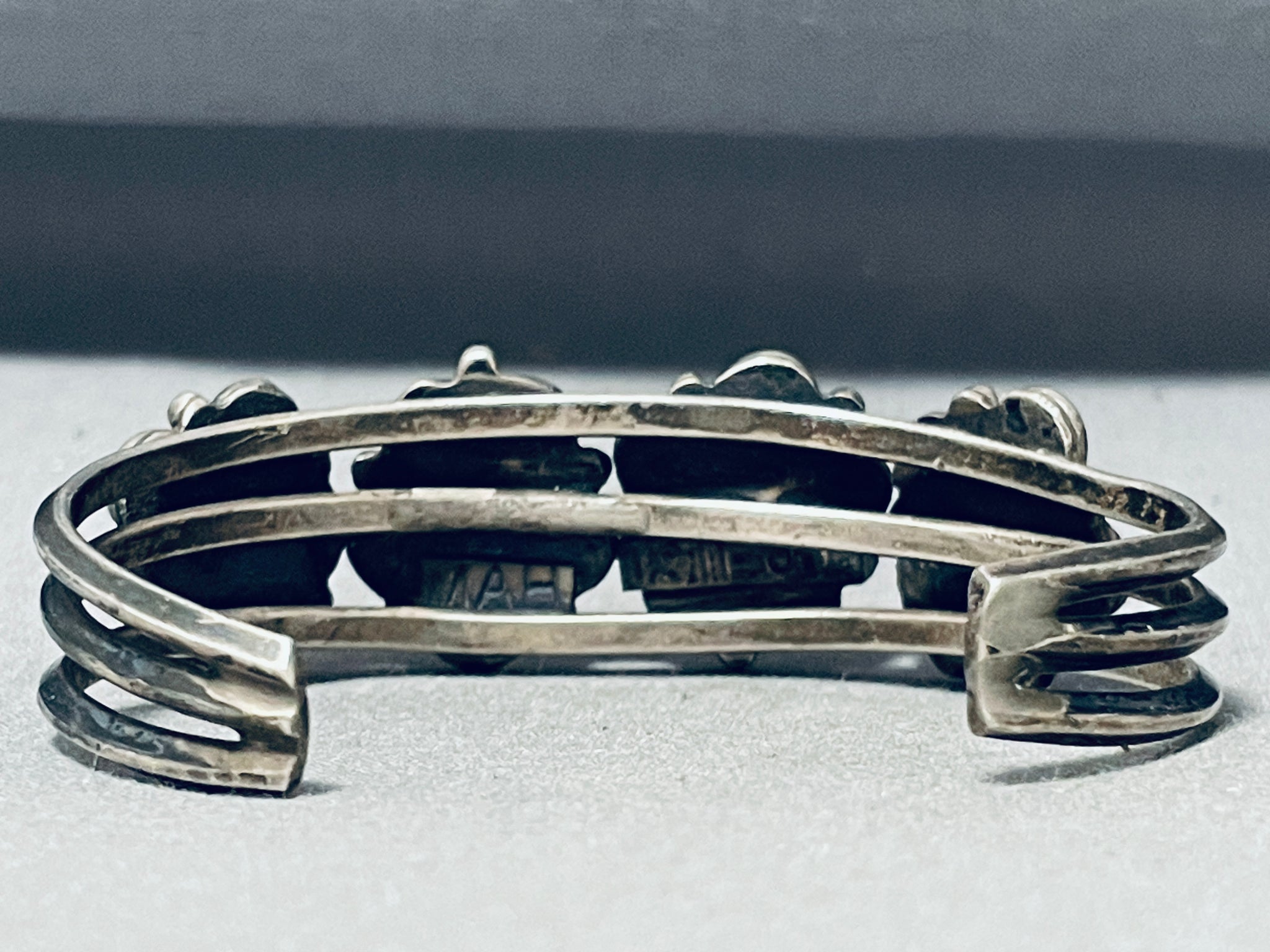 The bracelet features 4 Blue Gem turquoise stones, silver flowers, silver beads, silver rope, and a triple rail silver cuff! The stones measure around 3/8" x 1/4". The width of the bracelet measures around 3/4". Signed by Navajo artist, Johnny Frank. Sterling silver. The inside end to end measures around 5-1/4" with an additional 1-1/4" gap. Sturdy 32 grams.