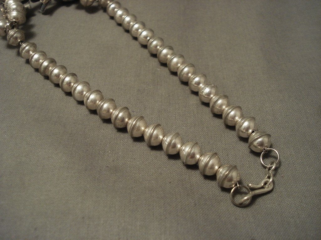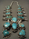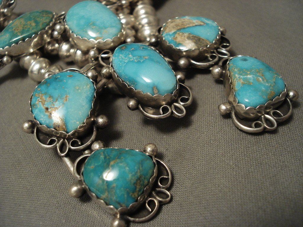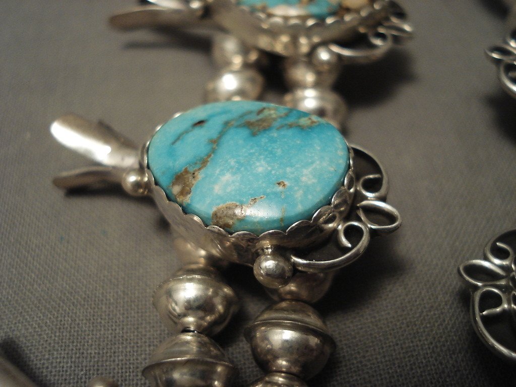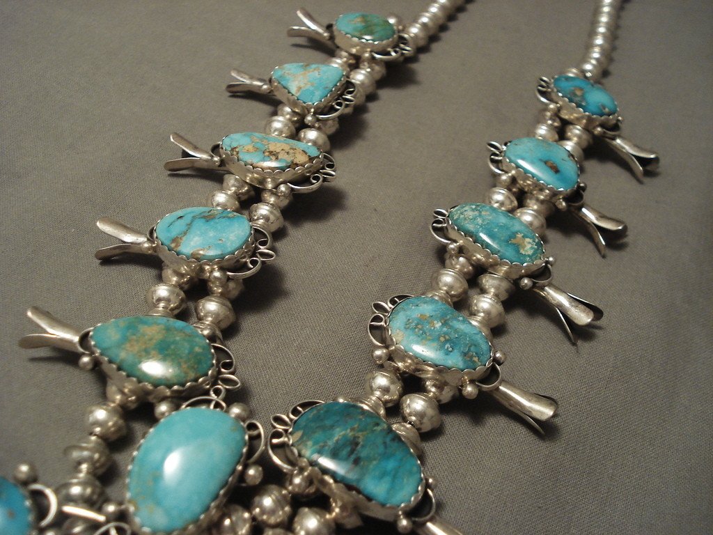 This is an incredible vintage Navajo Native American jewelry Native American jewelry museum quality silver and turquoise squash blossom necklace. This piece contains 16 fabulous and huge Blue Gem turquoise stones. Blue Gem is one of the most collectible turquoise mines. Check out the silver works on this piece, absolutely phenomenal. The silver works include swirling silver stmes, raindrops and amazing silver squashes. Each squash measures around 1-3/8" X 1/2" and the beautiful naja pendant measures around 2-3/4" X 2-3/8". The average turquoise stone measures around 3/4" X 1/2". Resting throughout the necklace are incredible silver beads with a traditional silver clasp. Sterling silver. Cir. 1970's+. Signed by Navajo Native American jewelry Native American jewelry artist, FC (unique font). The length of the necklace measures around 26". Sturdy 122 grams. LAYAWAYS- We are happy to work with you and are more flexible than anyone on the net. Simply send us an email for more information.