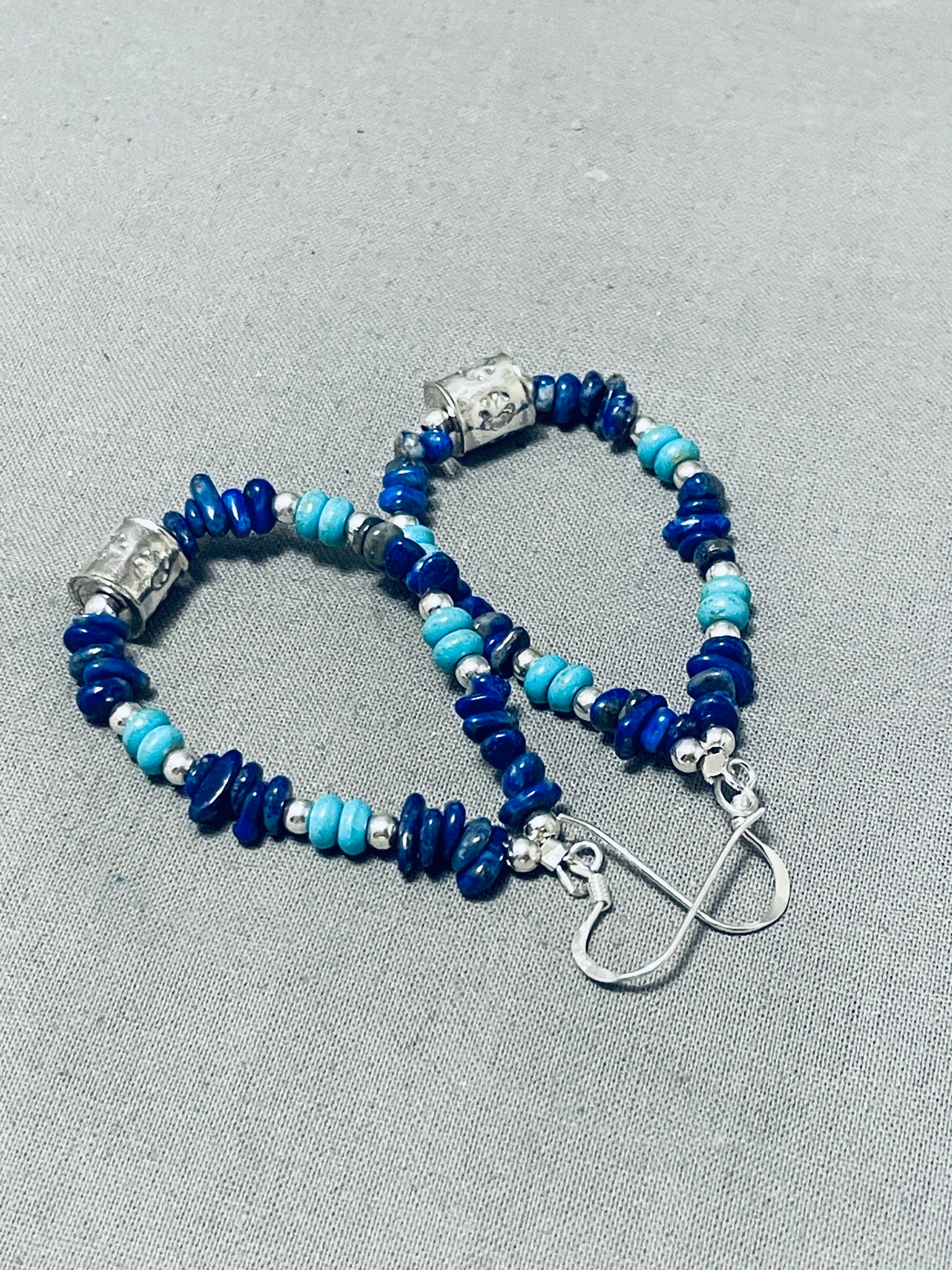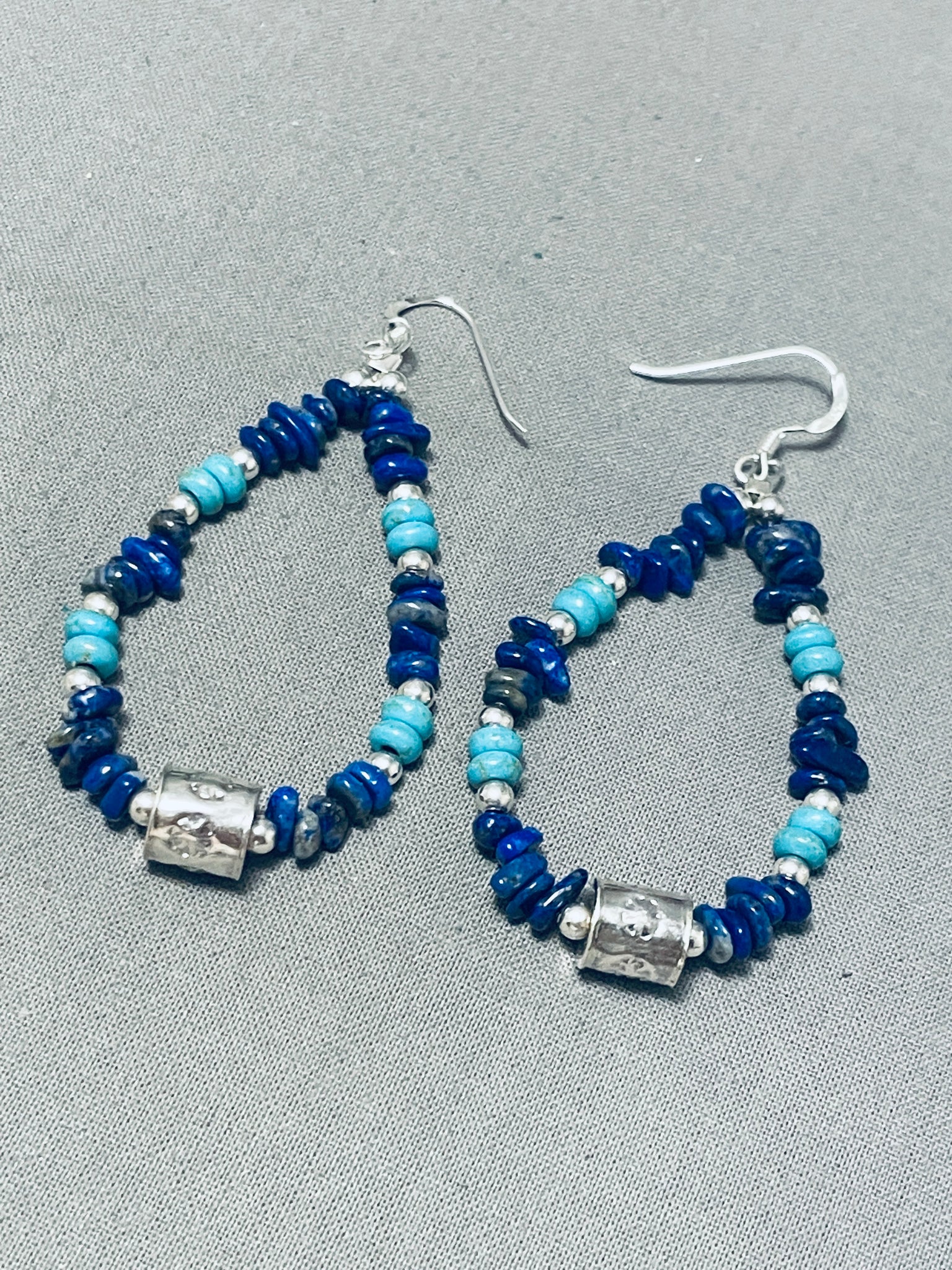 Here we have an incredible Navajo silver pair of earrings. This is a pair of colorful pierced wire dangle earrings of turquoise and lapis, also separated and accented with silver beads, with a handstamped silver tube at each base! Sterling silver. Each earring measures 2-3/4" long and 1-1/8" wide. The earrings weigh around 10 grams.