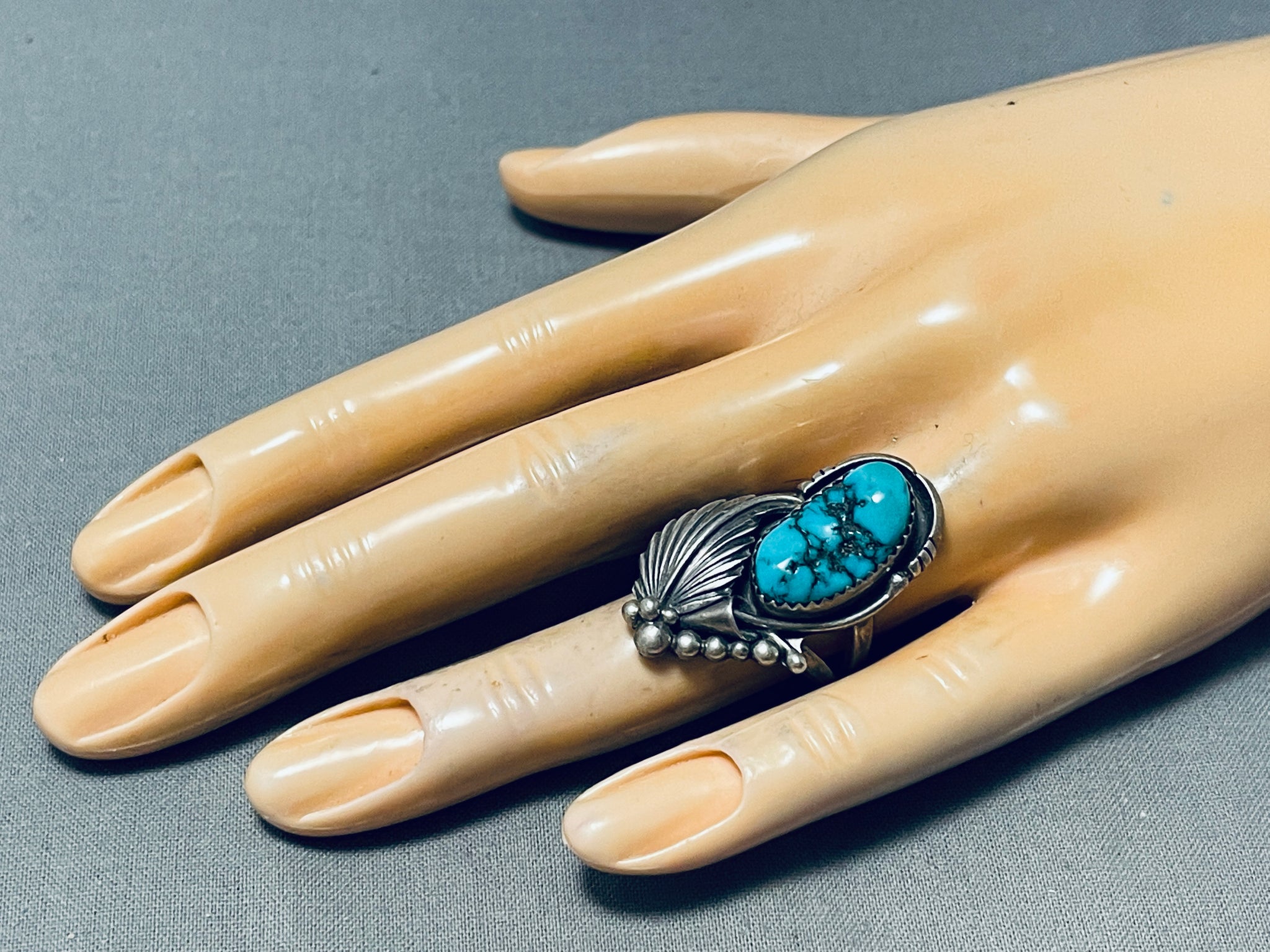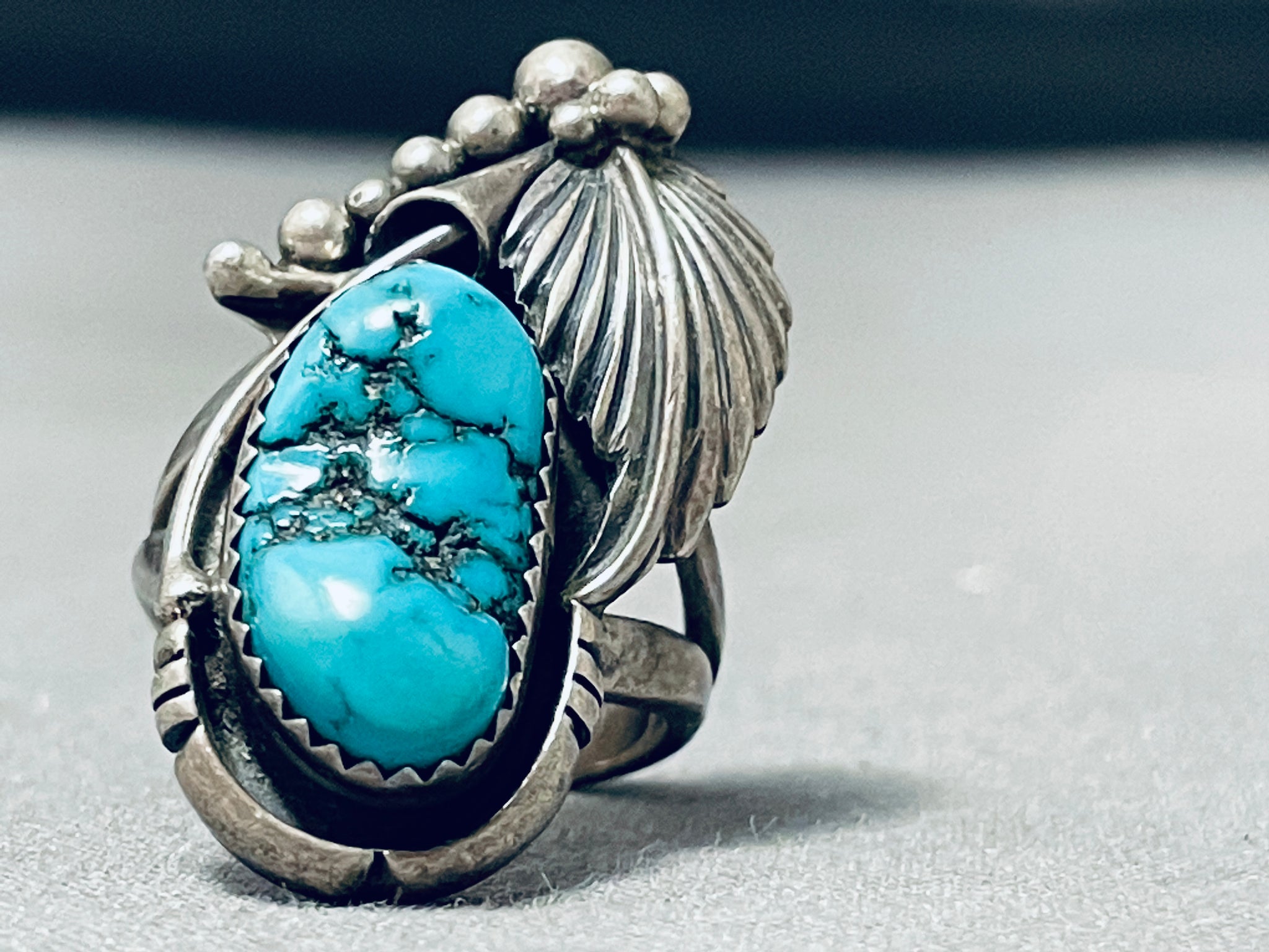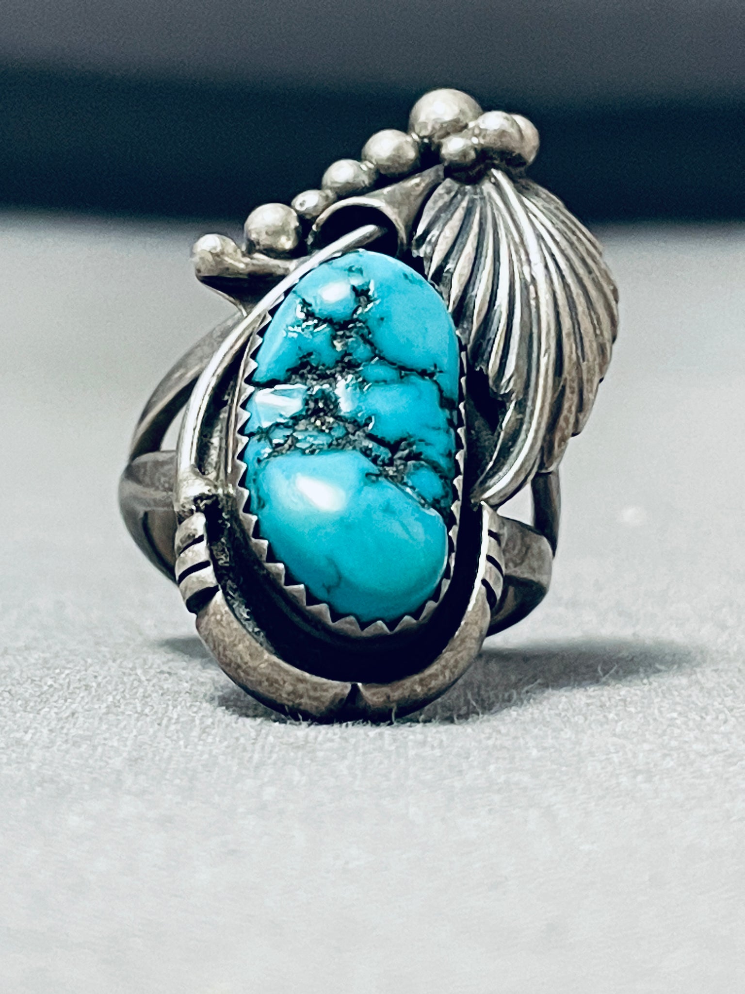 Marvelous Vintage Native American Navajo Sleeping Beauty Turquoise Sterling Silver Leaf Ring