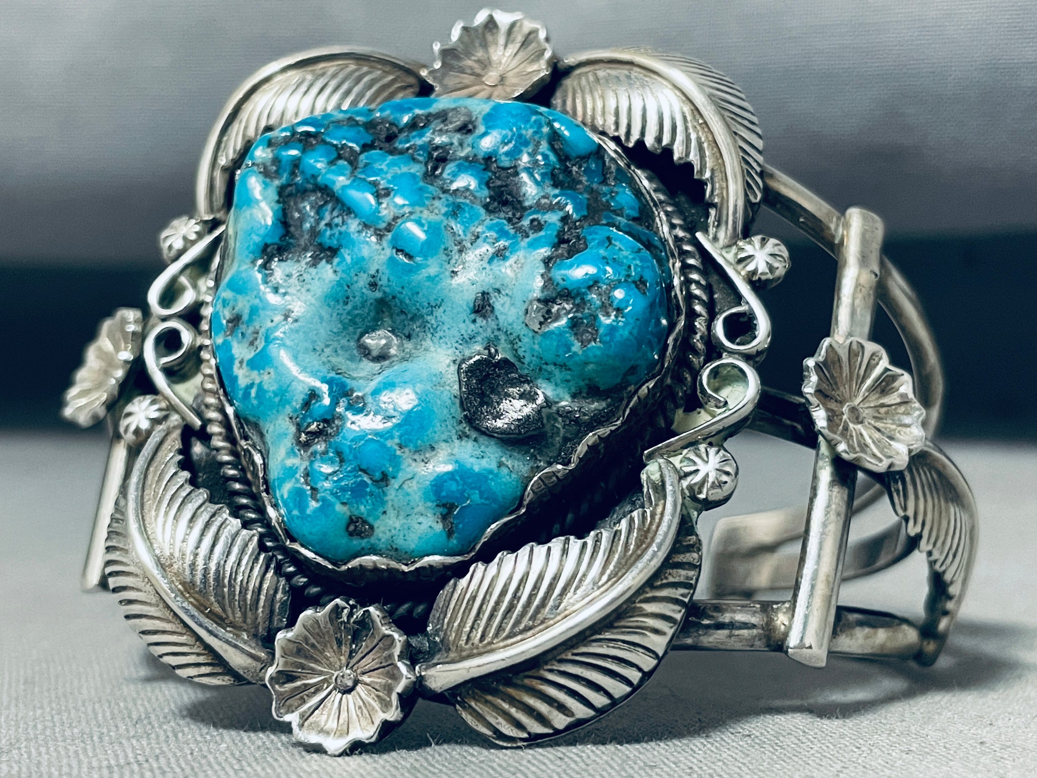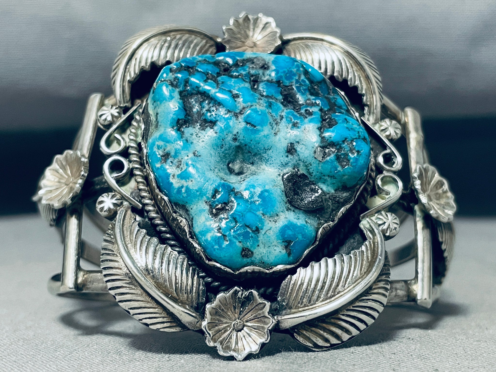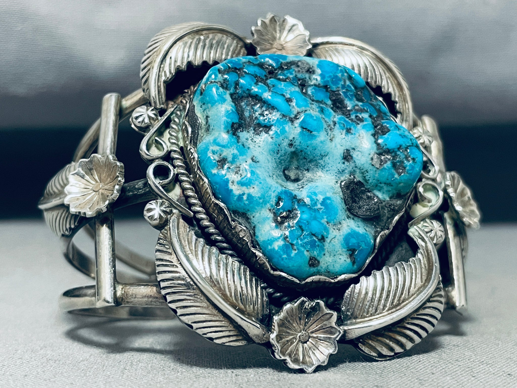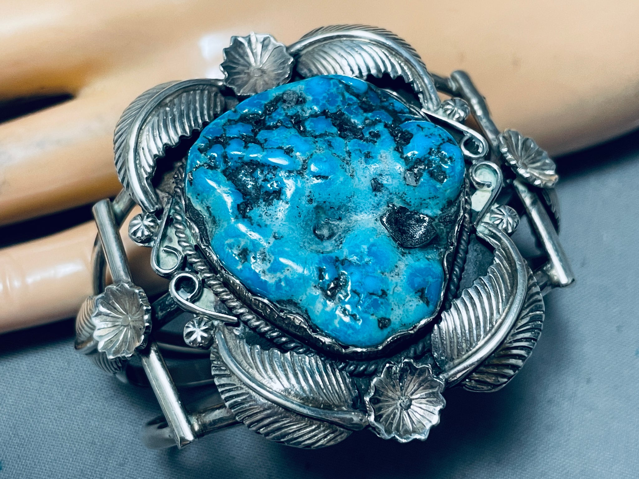 Massive Vintage Native American Navajo Turquoise Sterling Silver Leaf Bracelet