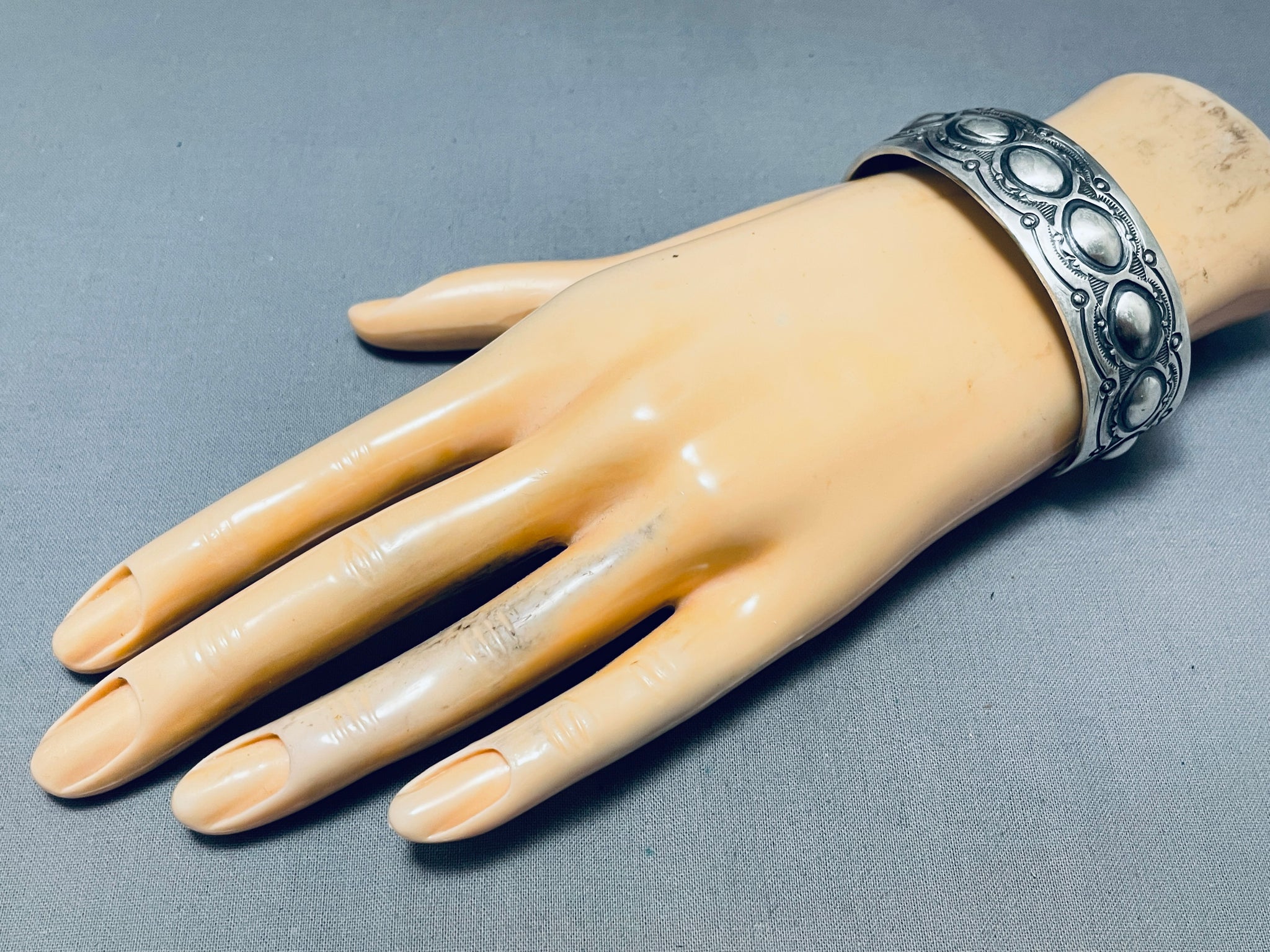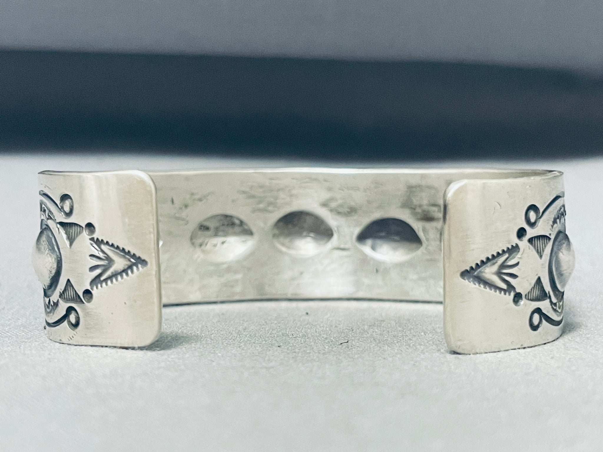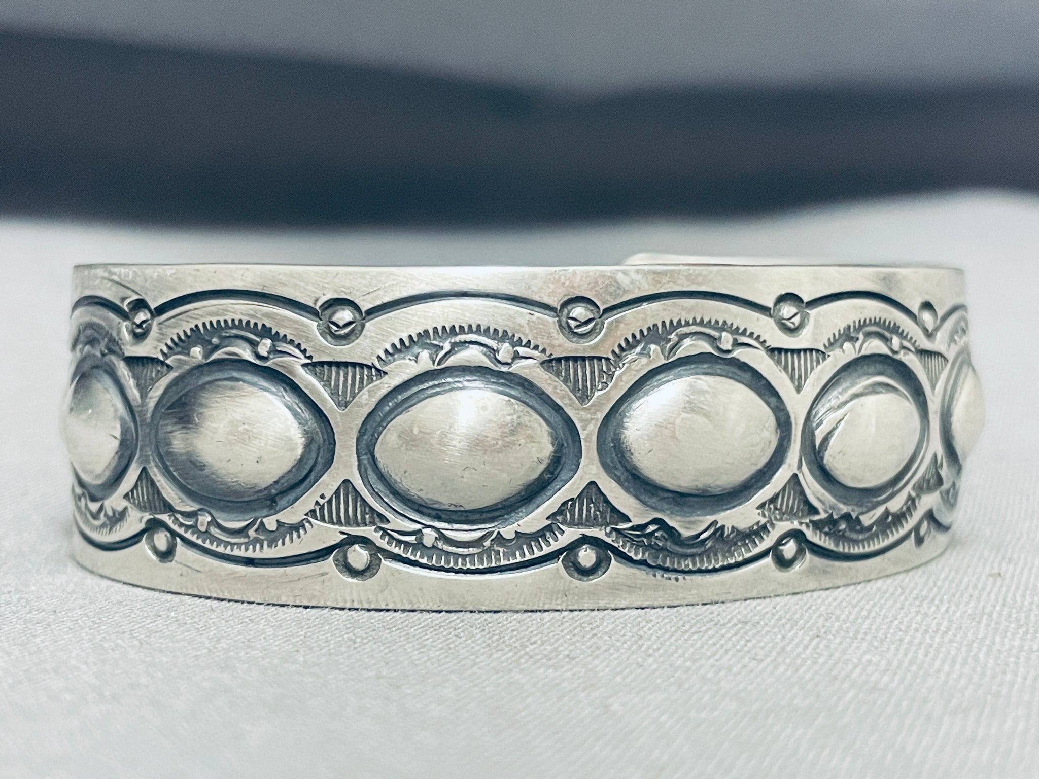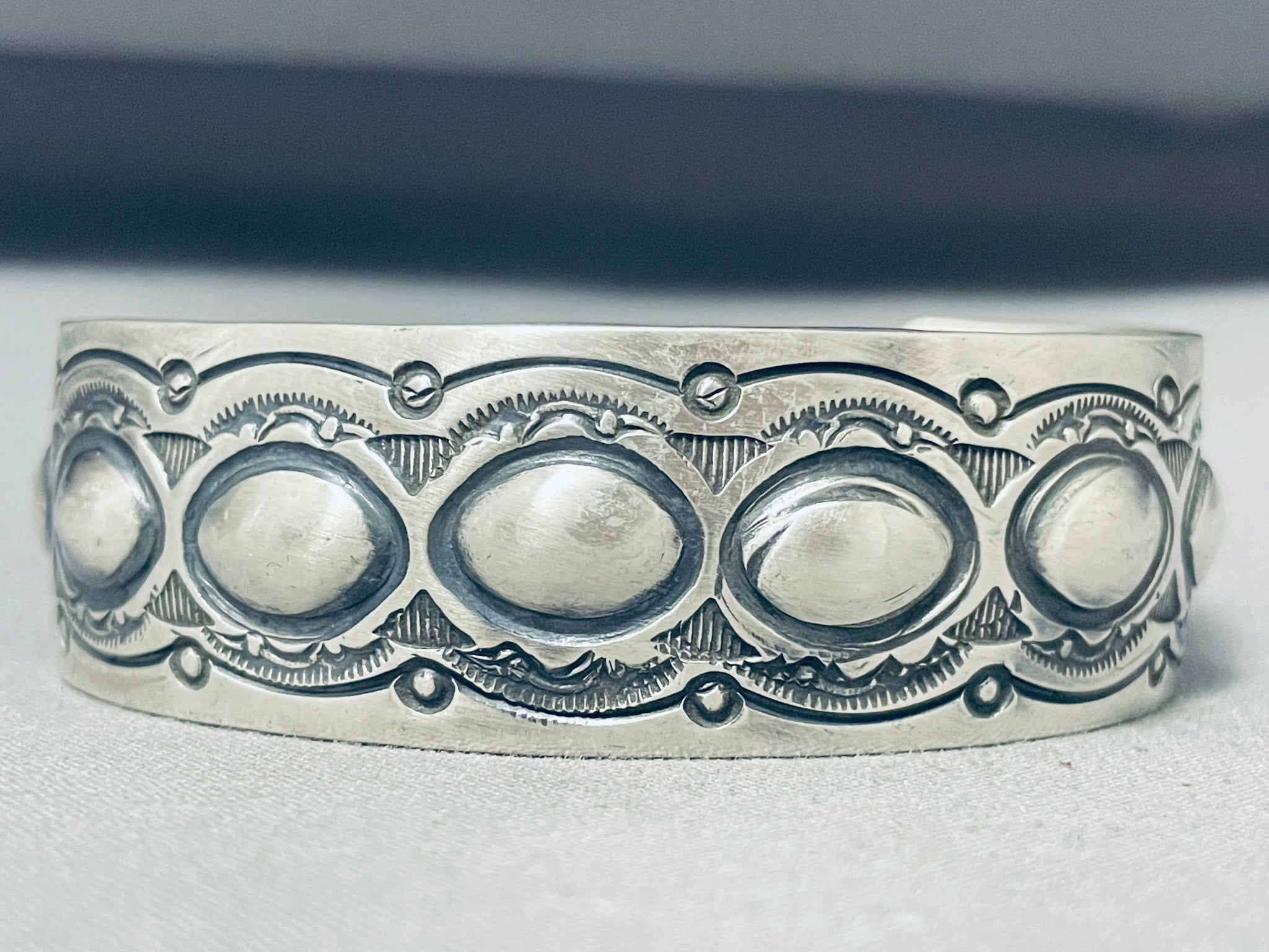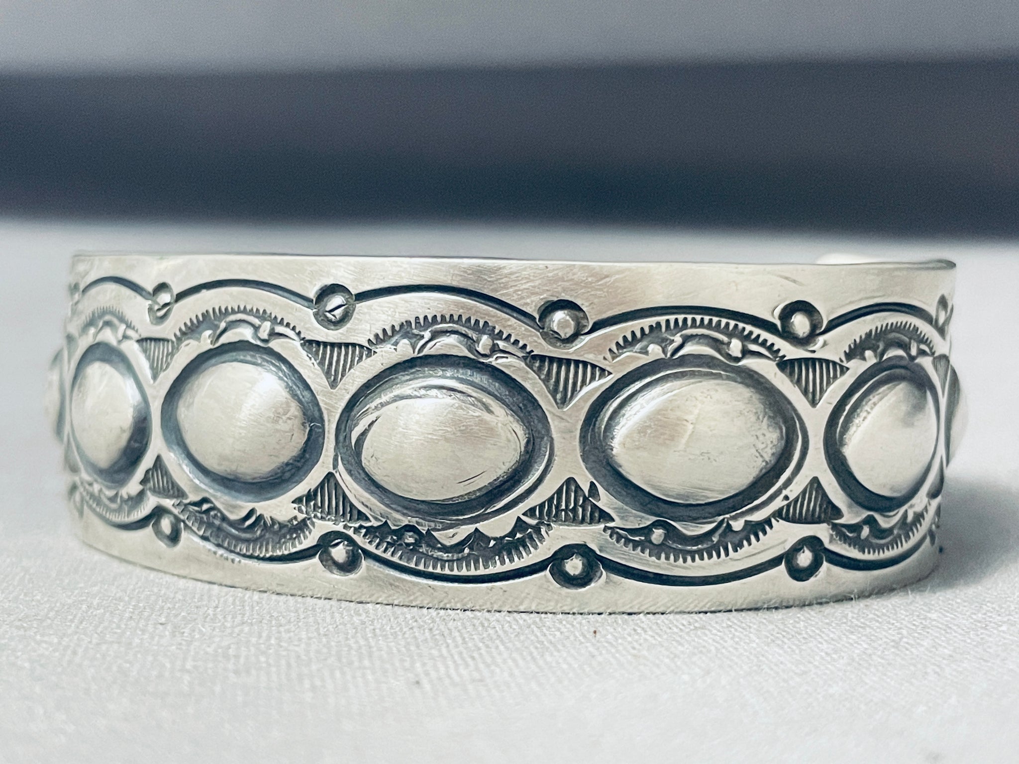 Up for sale is this striking Navajo silver bracelet. Beautiful handstampings decorate all around the 9 pretty repousse designs that dance down the middle of this impressive bracelet! So nice! The width of the bracelet measures around 3/4". Signed by Navajo artist, Mel Willie. Sterling silver, marked. The inside end to end measures around 5-3/4" with an additional 1-1/4" gap. Sturdy 46 grams.