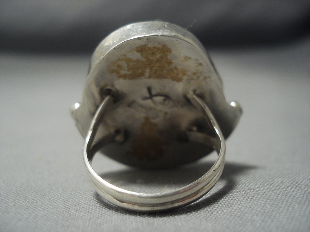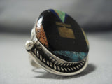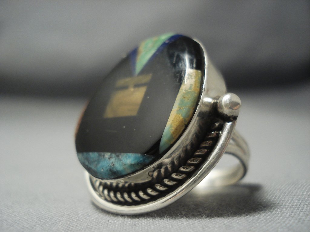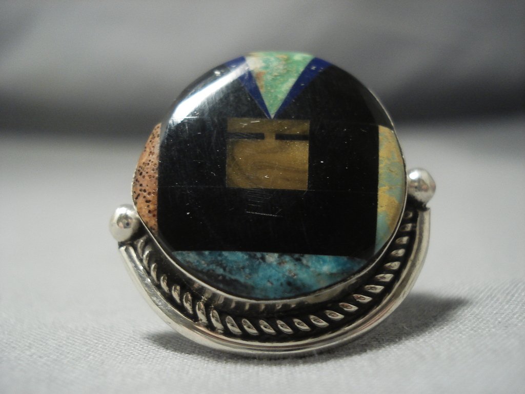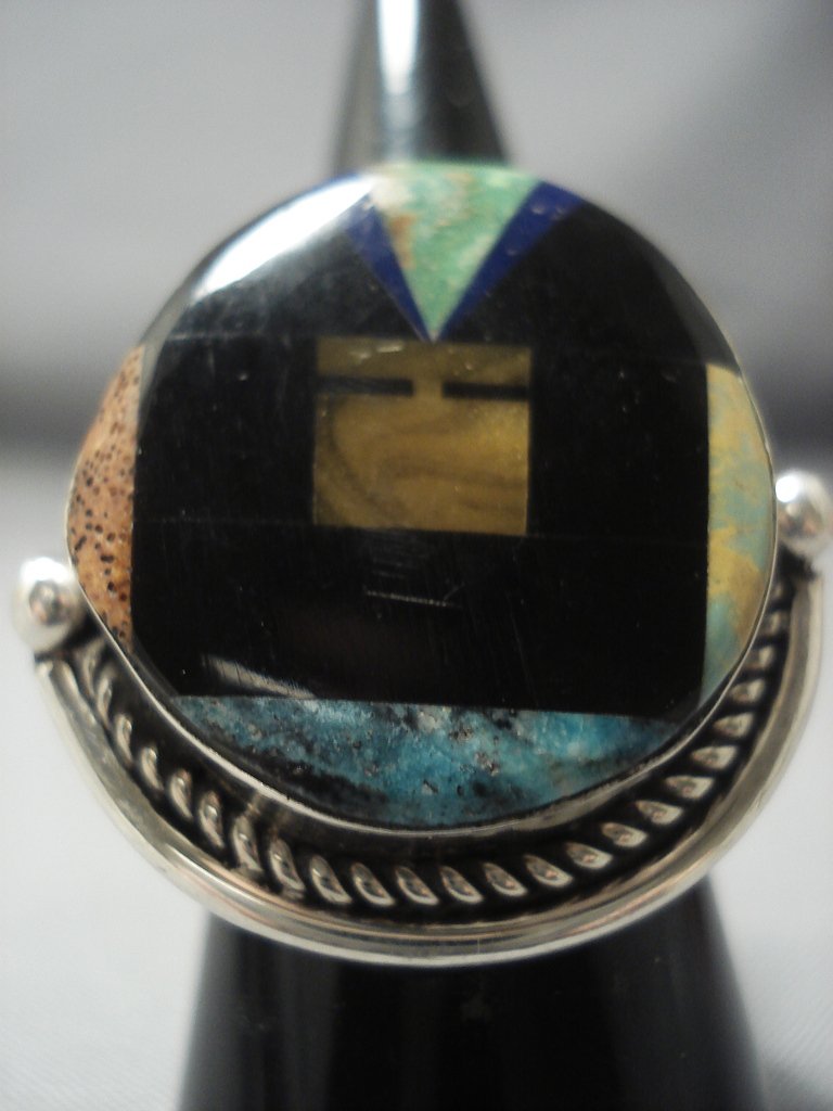 This is a breathtaking Navajo Native American jewelry Native American jewelry inlaid midnight space kachina silver ring. This piece contains fabulous Royston turquise, onyx, coral and shell. Accenting the inlay are amazing silver works that include silver raindrops and ropes. The ring measures to be a size 9 but can be resized if needed. The ring face measures around 1-1/8" x 1-1/8". Signed by Navajo Native American jewelry Native American jewelry artist, T (fish). Cir. 1970's+. Sterling silver, marked. Sturdy 8 grams.