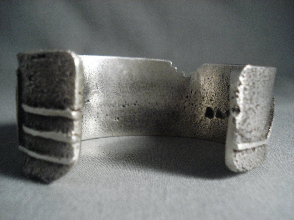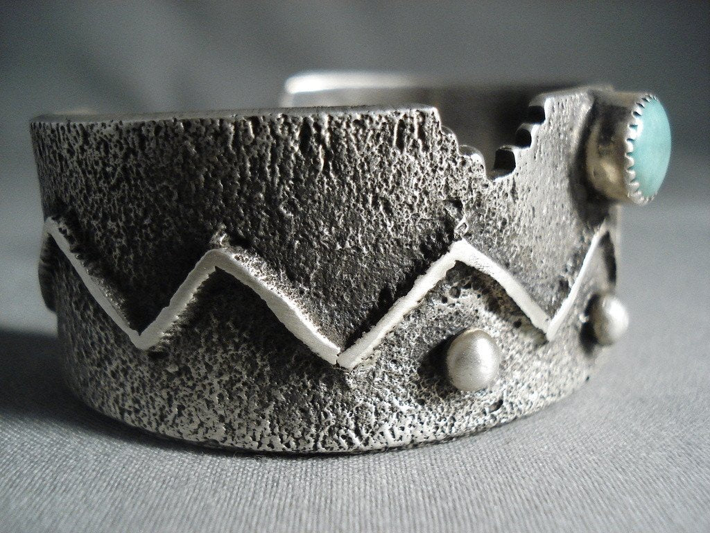 An impressive vintage Navajo Native American jewelry Native American jewelry silver bracelet. The thick raised arrow starts at one end of the cuff and zigzags across toward the other side, passing two large silver balls, a cutout mountain range design - and a vibrant green turquoise stone - all as the one side gently increases in width and it approaches the wind symbols. The background for the cuff is a texturing that really enhances the stone and designs that much more! The center stone measures around 3/8" x 5/16". The width of the bracelet measures around 1-1/8". Signed by Navajo Native American jewelry Native American jewelry artist, S. Billie. Sterling silver, marked. The inside end to end measures around 5-1/2" with an additional 1-1/4" gap. Sturdy 88 grams. LAYAWAYS- We are happy to work with you and are more flexible than anyone on the net. Simply send us an email for more information.