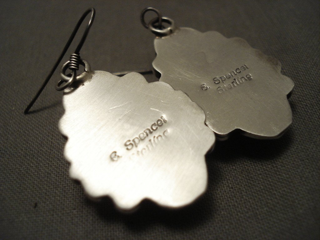 This is an exquisite modernistic Navajo Native American jewelry Native American jewelry silver pair of earrings. This set includes wonderful and unique Number 8 turquoise stones. Surrounding the stones are impeccable silver works that consist of fans, flower petals, and raindrops. Each stone measures a stunning 5/8" X 3/8" while each earring measures around 1-1/8" X 3/4" not including the hook. The earrings weigh around 11 grams. LAYAWAYS- We are happy to work with you and are more flexible than anyone on the net. Simply send us an email for more information.