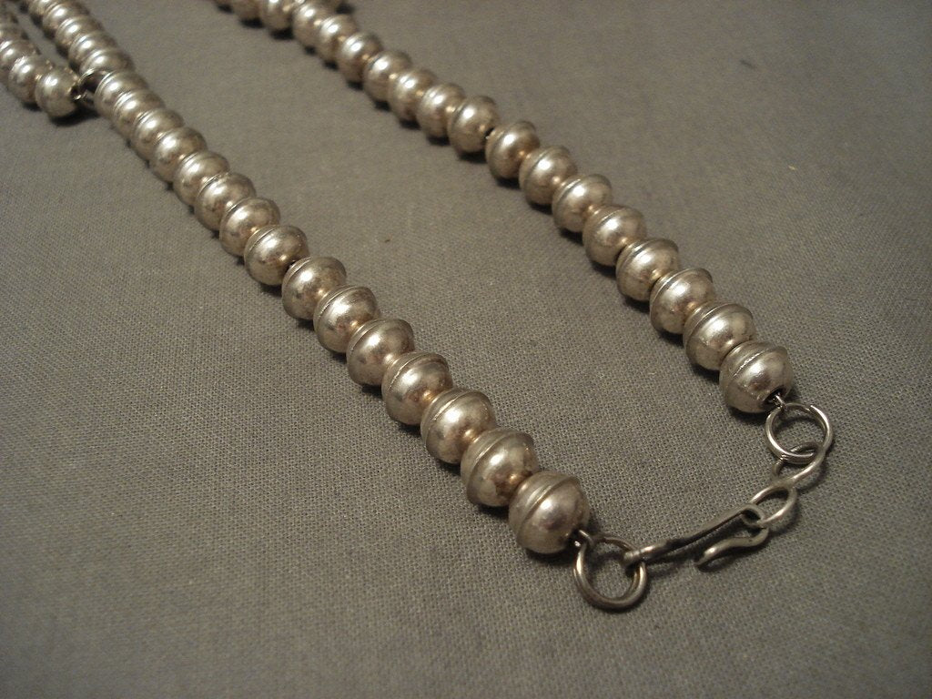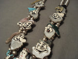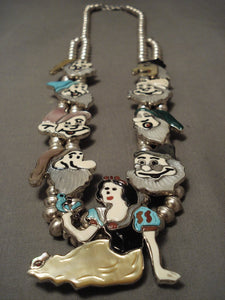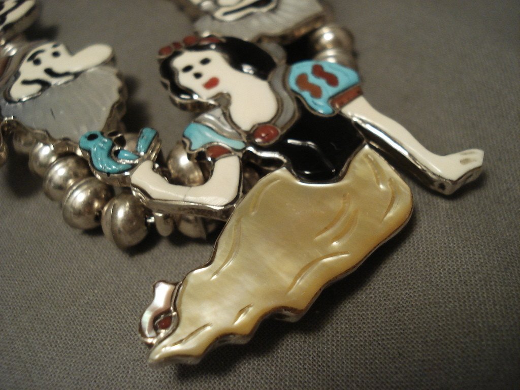 This is a wonderful vintage Zuni Native American jewelry museum quality silver squash blossom necklace having a phenomenal Snow White theme. The necklace consists of a large inlaid Snow White pendant with the seven dwarfs and witch being the squashes. Absolutely incredible necklace as each silver pendant are wonderfully inlaid with mother of pearl, shells, turquoise, corals and onyx stones. Resting throughout the necklace are marvelous hand wrought silver beads with a traditional silver clasp. The Snow White pendant at the bottom measures around 1-3/4" X 1-7/8". Sterling silver, marked. Signed by Zuni Native American jewelry artist, AFCRR. The length of the necklace measures around 26". Sturdy 96 grams. LAYAWAYS- We are happy to work with you and are more flexible than anyone on the net. Simply send us an email for more information.