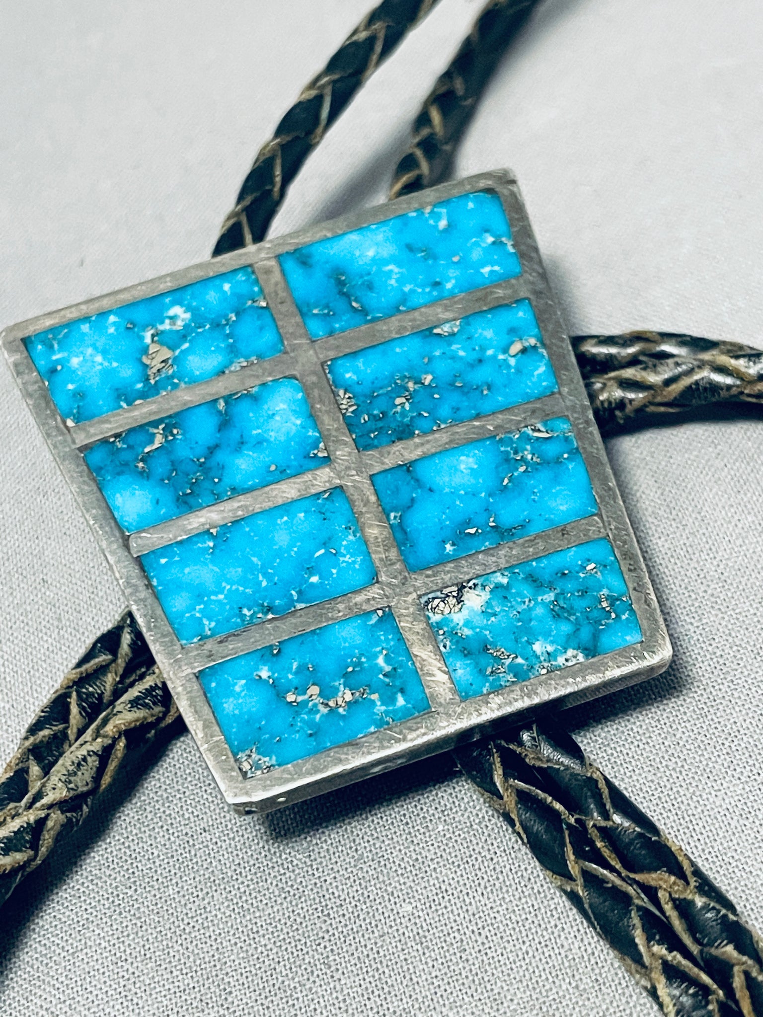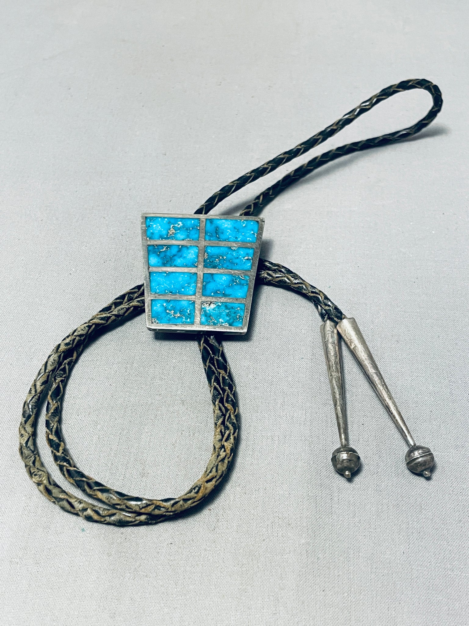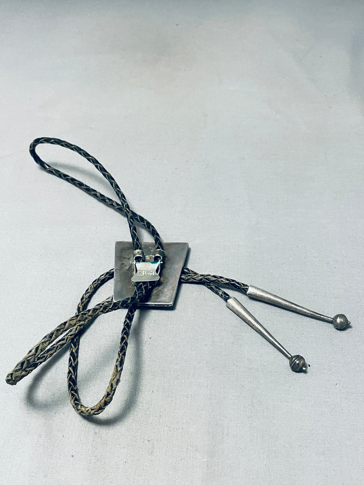 Native American 50 + Year Old Seasoned Vintage Zuni Turquoise Inlay Sterling Silver Bolo Tie