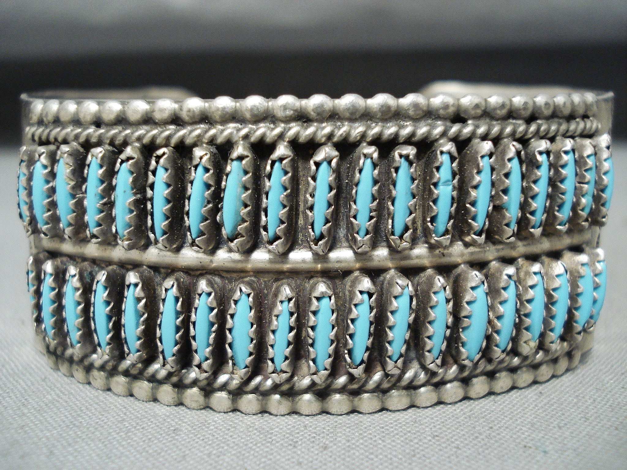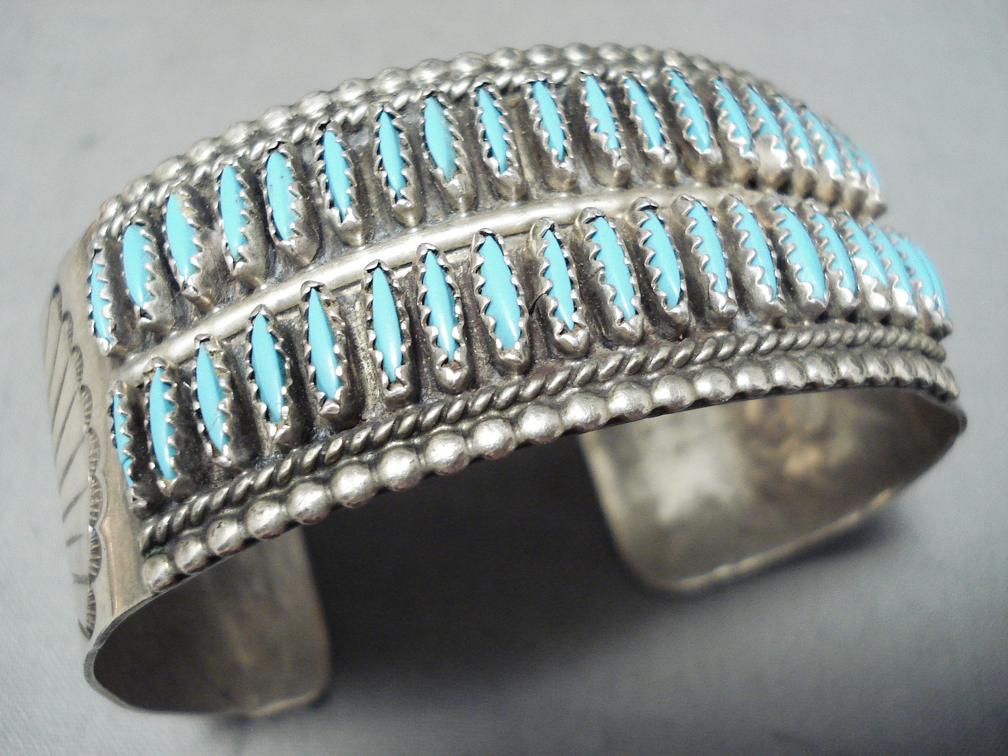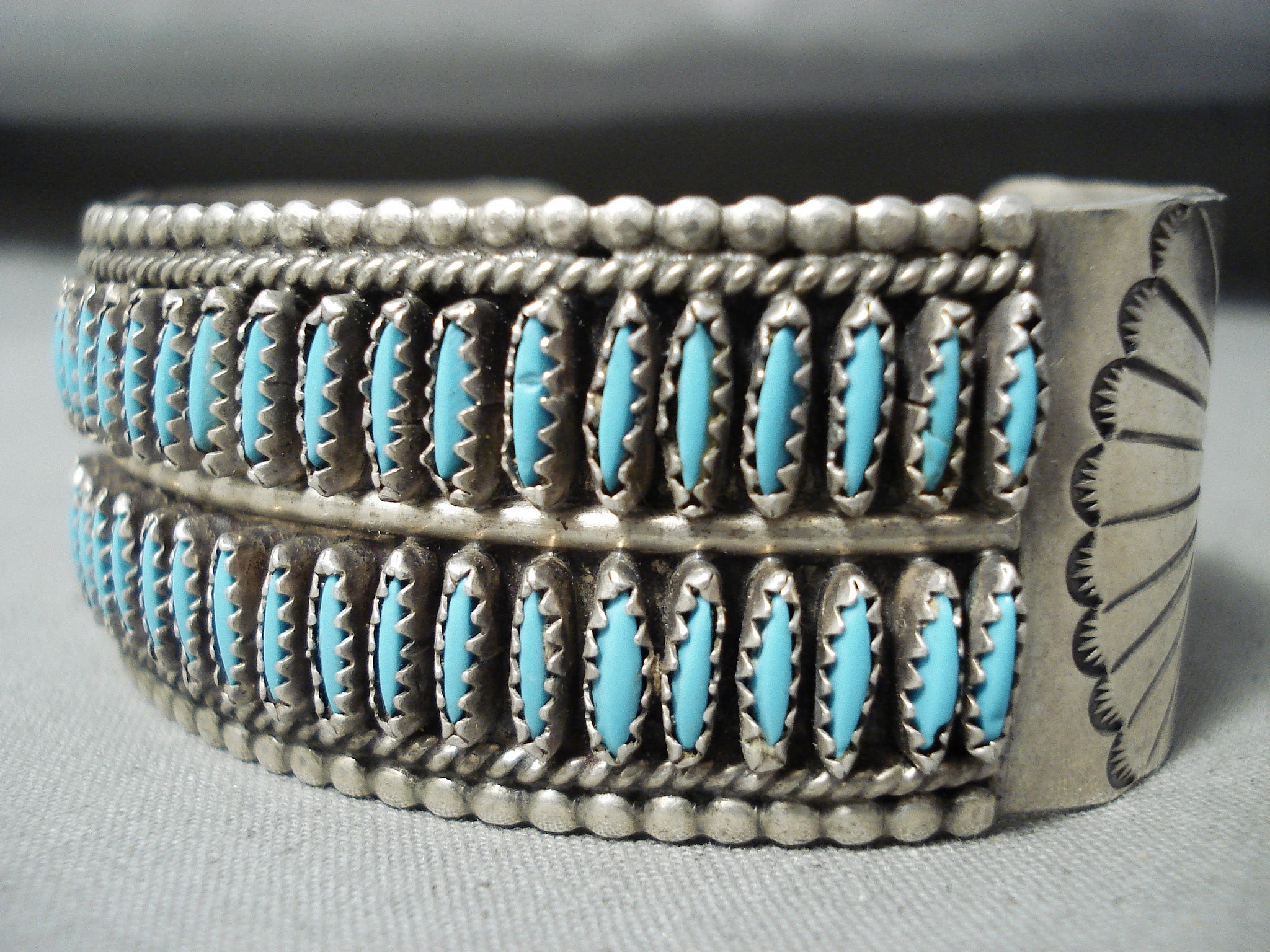 Native American Double Row Vintage Navajo Needle Turquoise Sterling Silver Bracelet