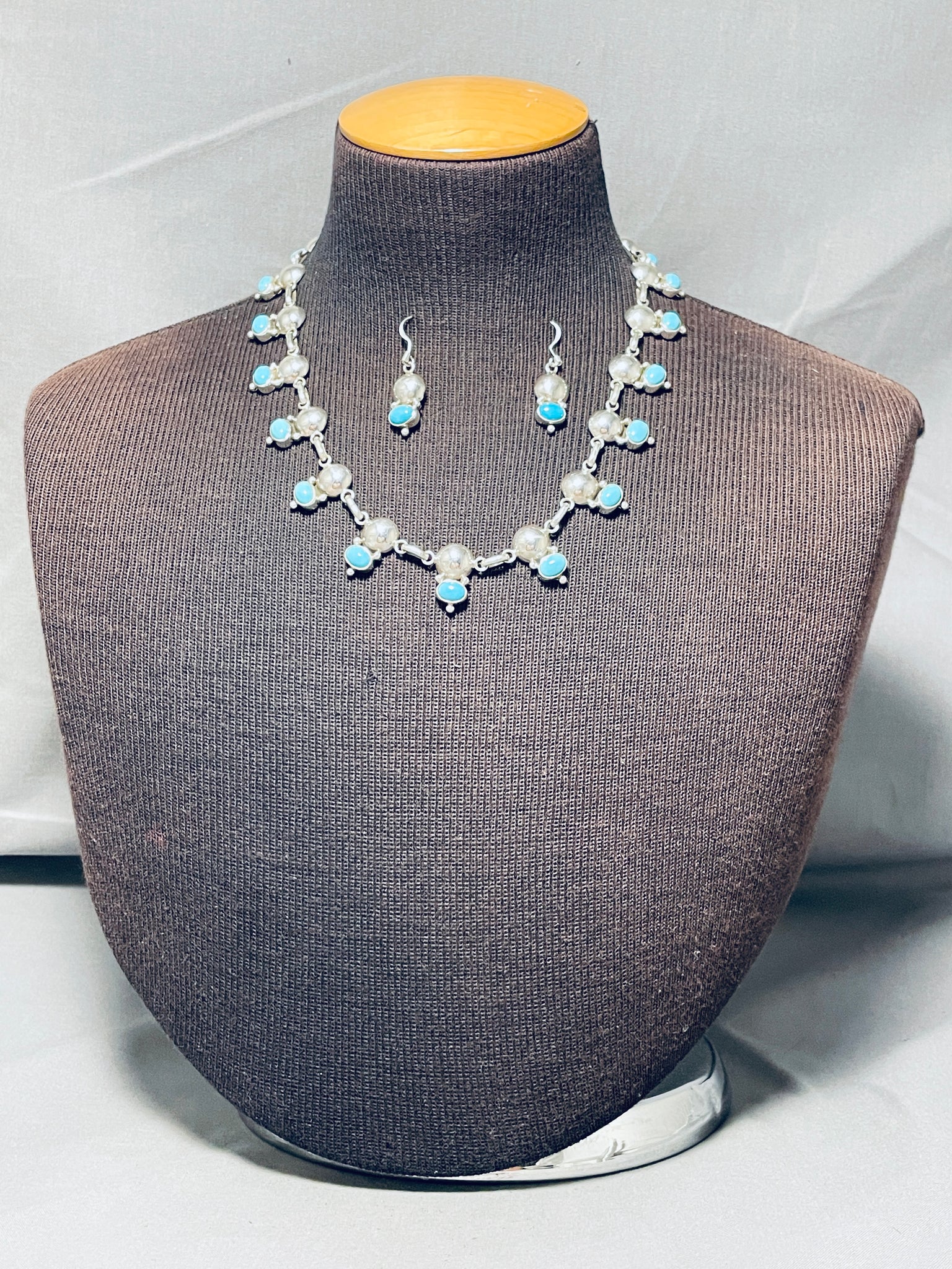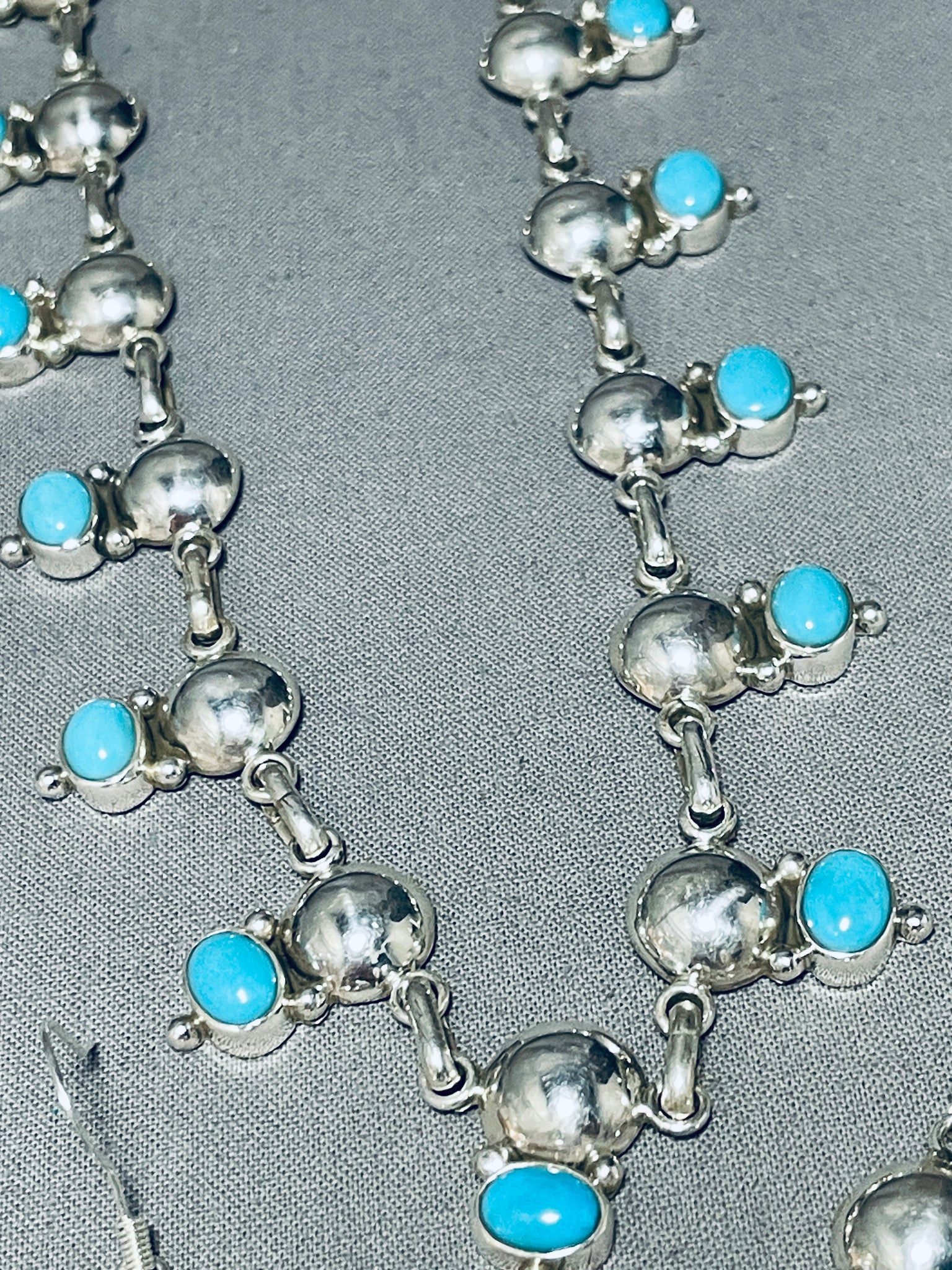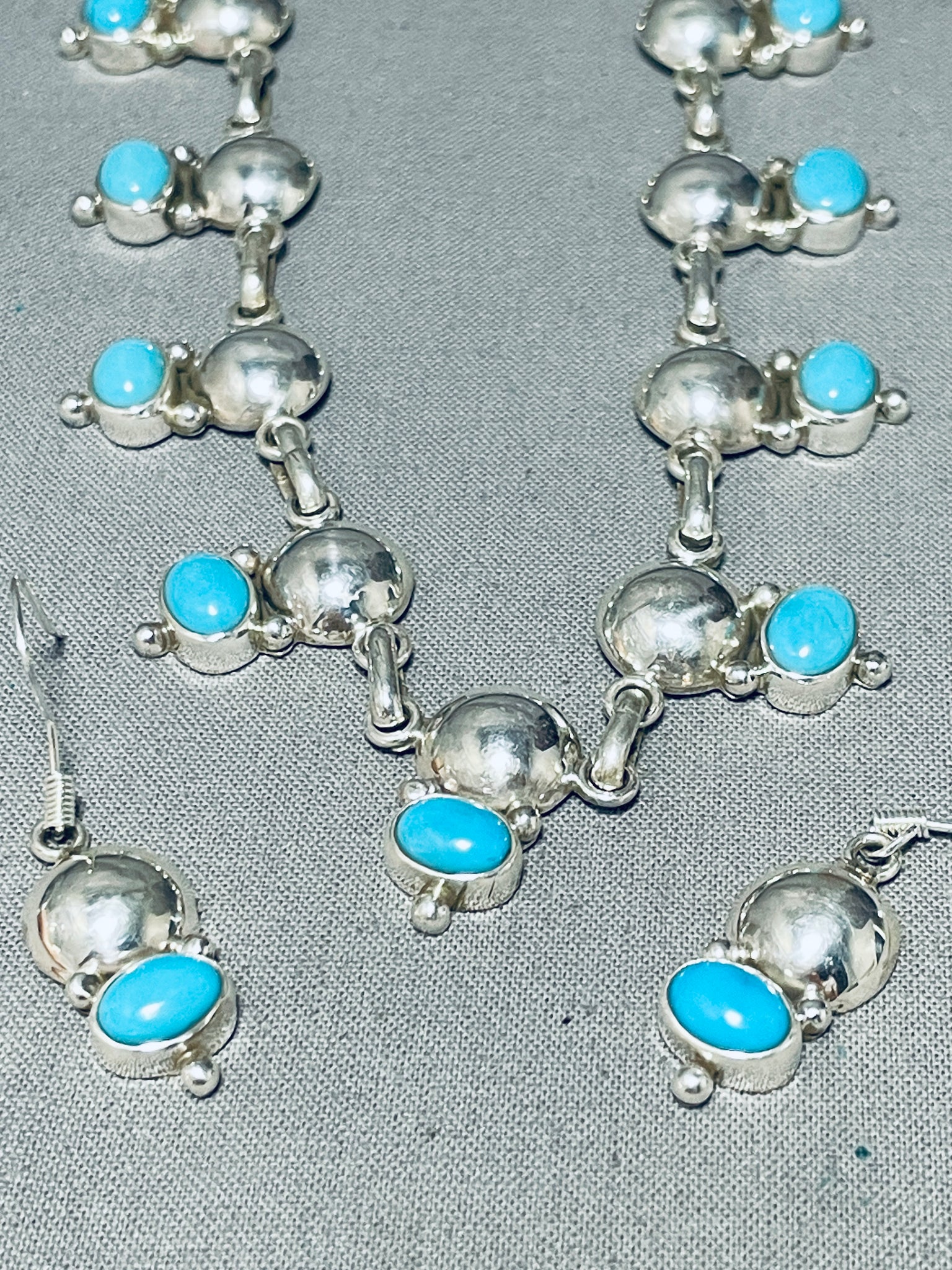 This is an exceptional Apache turquoise silver necklace set. This amazing set consist of a fabulous turquoise and silver necklace with a beautiful matching pair of turquoise silver earrings. The necklace contains a mind blowing plethora of oval shaped Sleeping Beauty turquoise stones that each accenting a marvelous large half silver bead with accenting smaller silver raindrops. Each stone measures around 5/16" X 3/16". Each earring measures around 1" X 3/8" not including the silver hooks. I just love the look of this necklace and matching earrings so much, will be a great addition to any outfit. Sterling silver, marked. Cir. 1980's+. Signed by Apache artist, Carlyne Apachito. The length of the necklace measures around 18". Sturdy 50 grams.