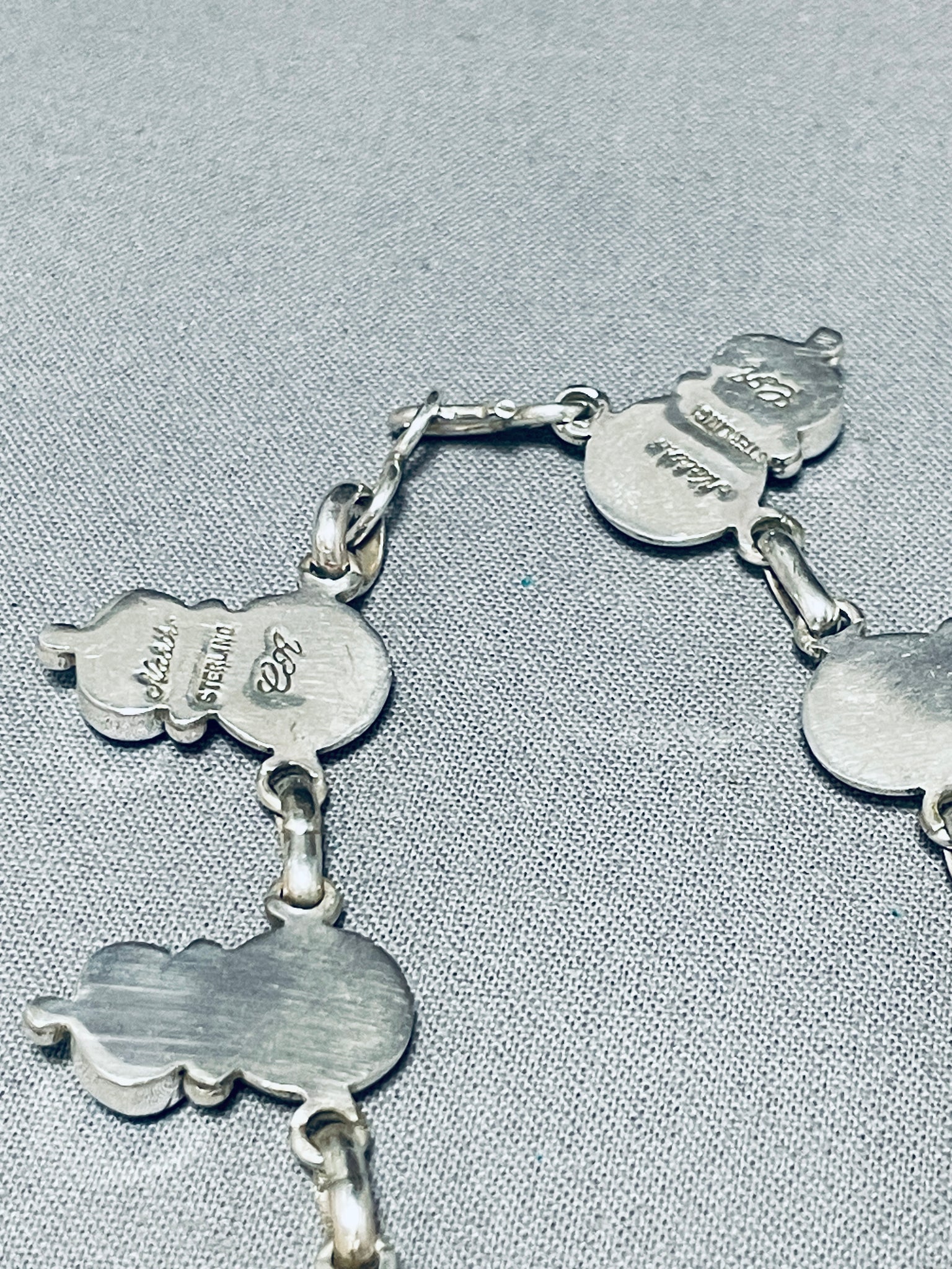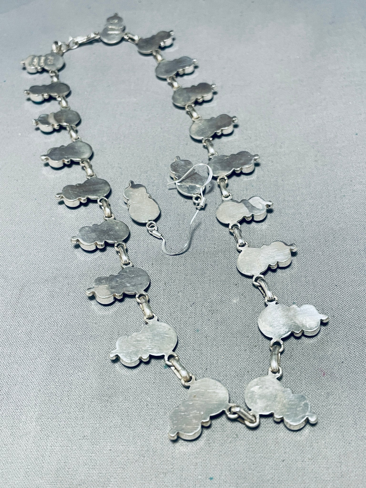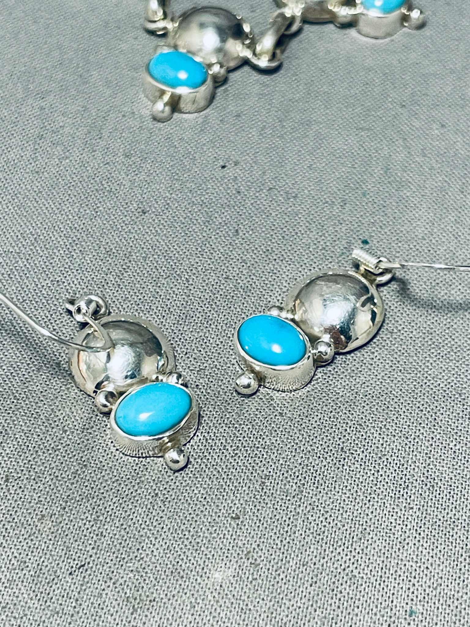 This is an exceptional Apache turquoise silver necklace set. This amazing set consist of a fabulous turquoise and silver necklace with a beautiful matching pair of turquoise silver earrings. The necklace contains a mind blowing plethora of oval shaped Sleeping Beauty turquoise stones that each accenting a marvelous large half silver bead with accenting smaller silver raindrops. Each stone measures around 5/16" X 3/16". Each earring measures around 1" X 3/8" not including the silver hooks. I just love the look of this necklace and matching earrings so much, will be a great addition to any outfit. Sterling silver, marked. Cir. 1980's+. Signed by Apache artist, Carlyne Apachito. The length of the necklace measures around 18". Sturdy 50 grams.