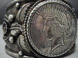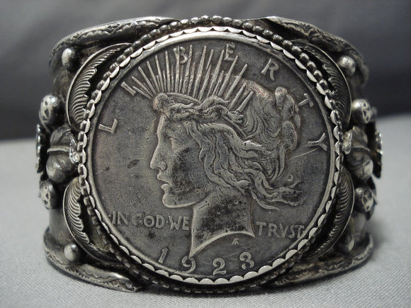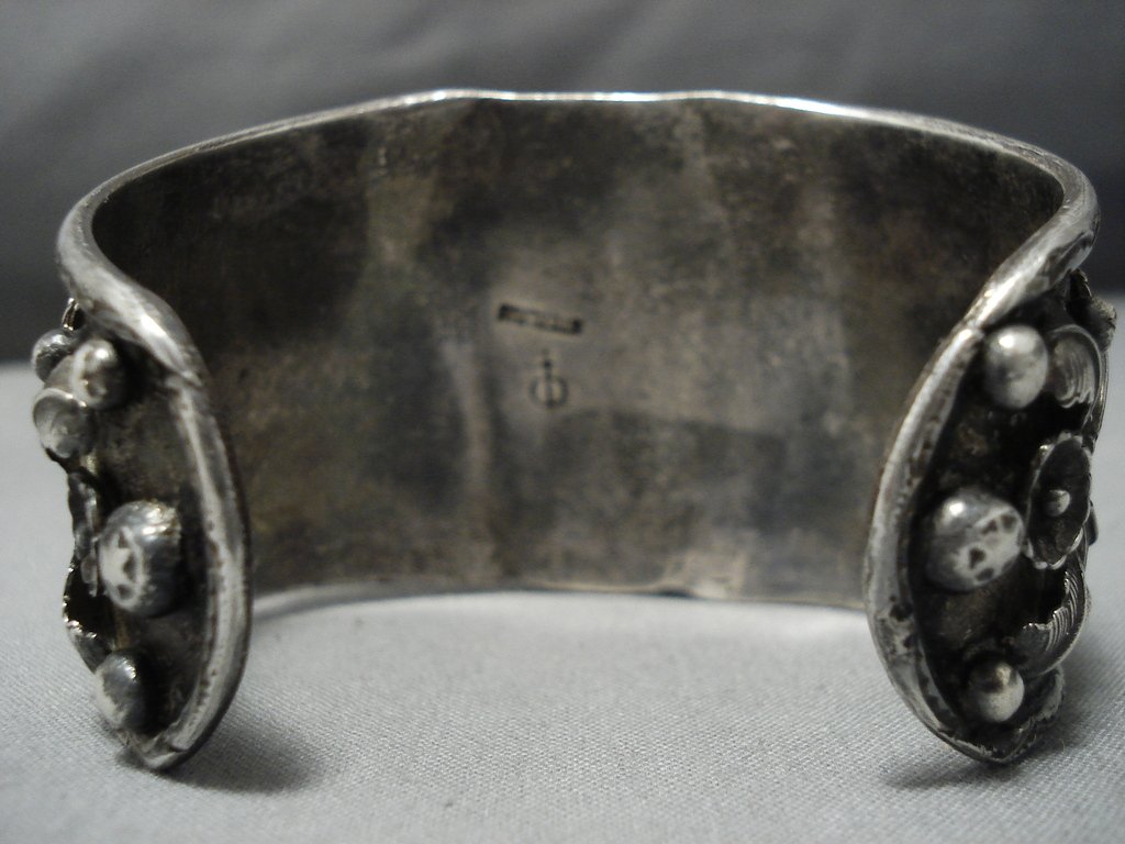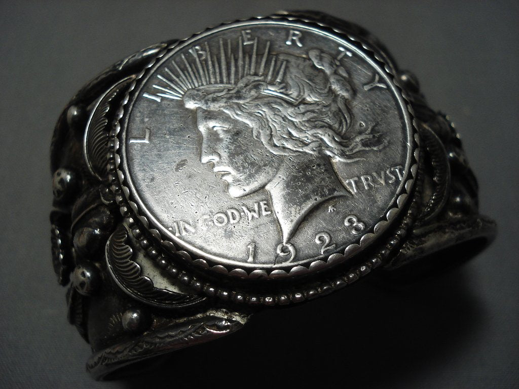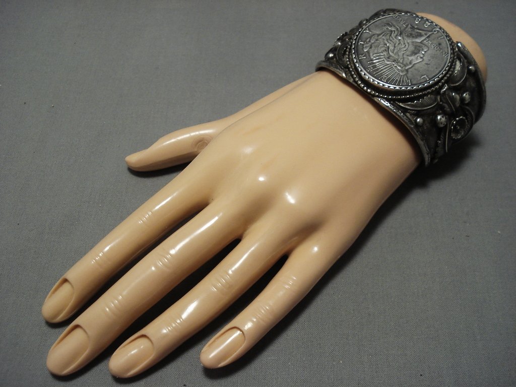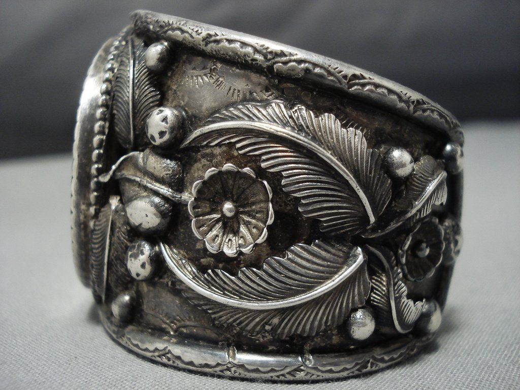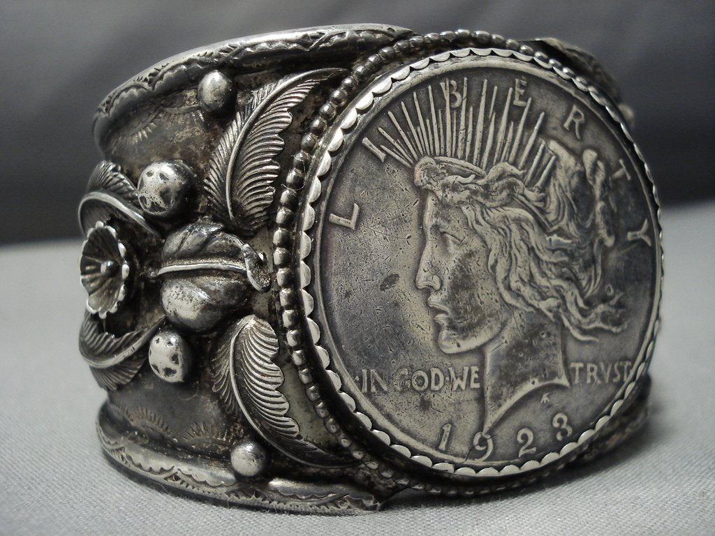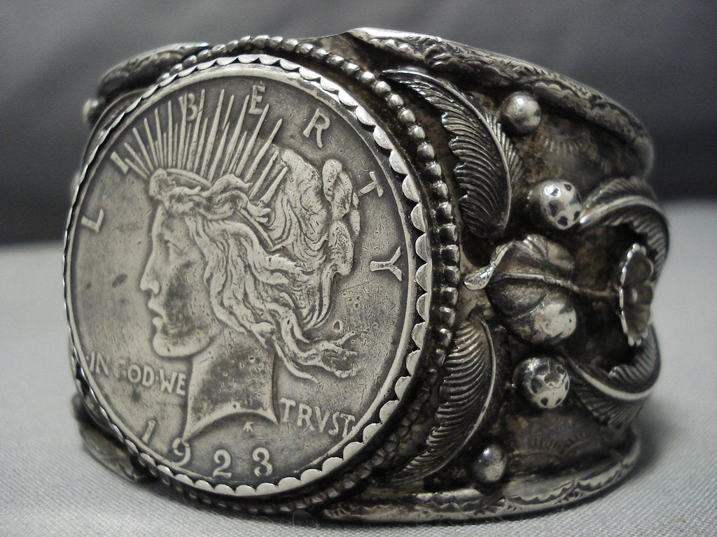 Native American Jewelry Huge Old Coin Sterling Silver Leaves Of Gardens Cuff Bracelet