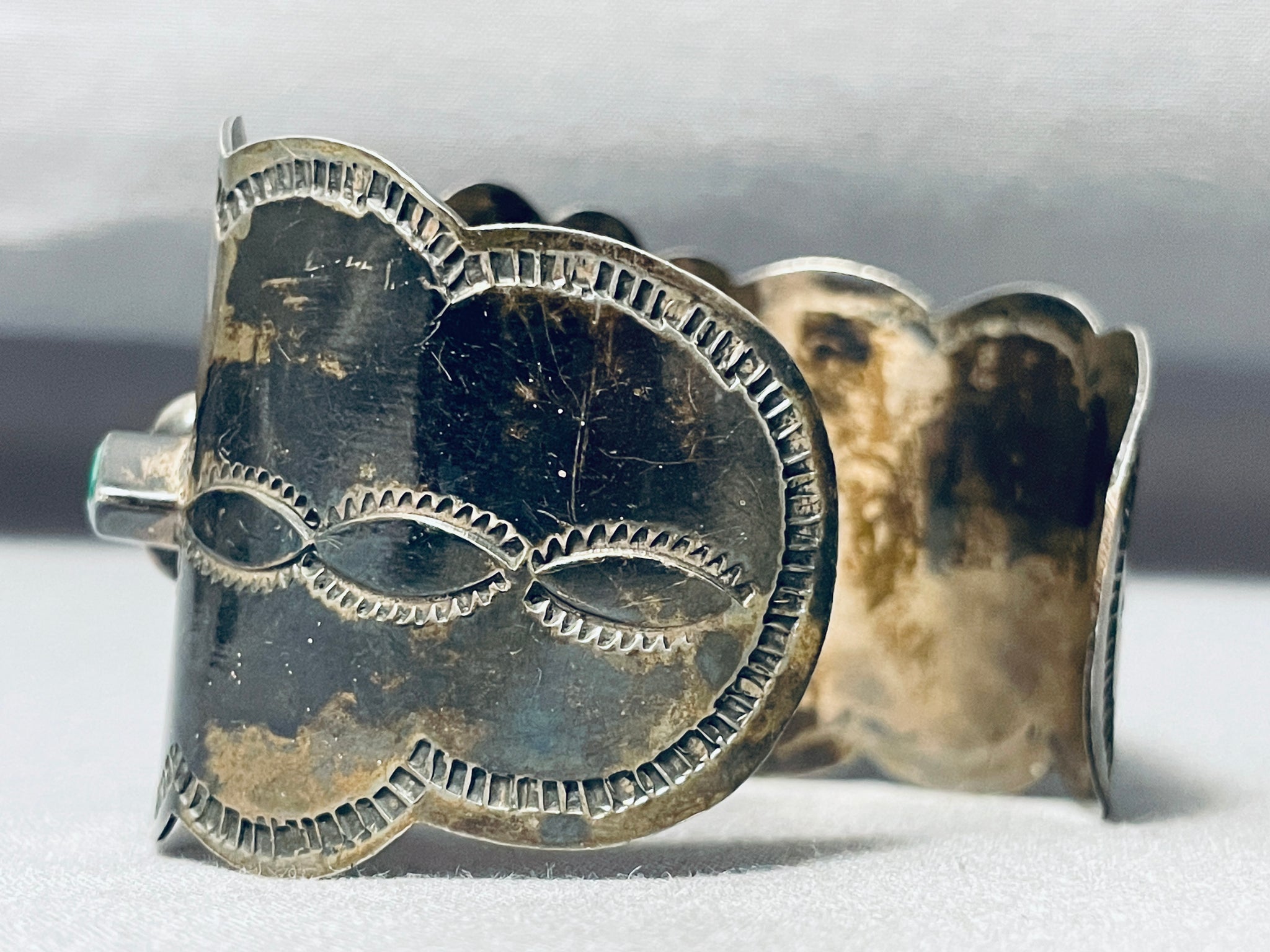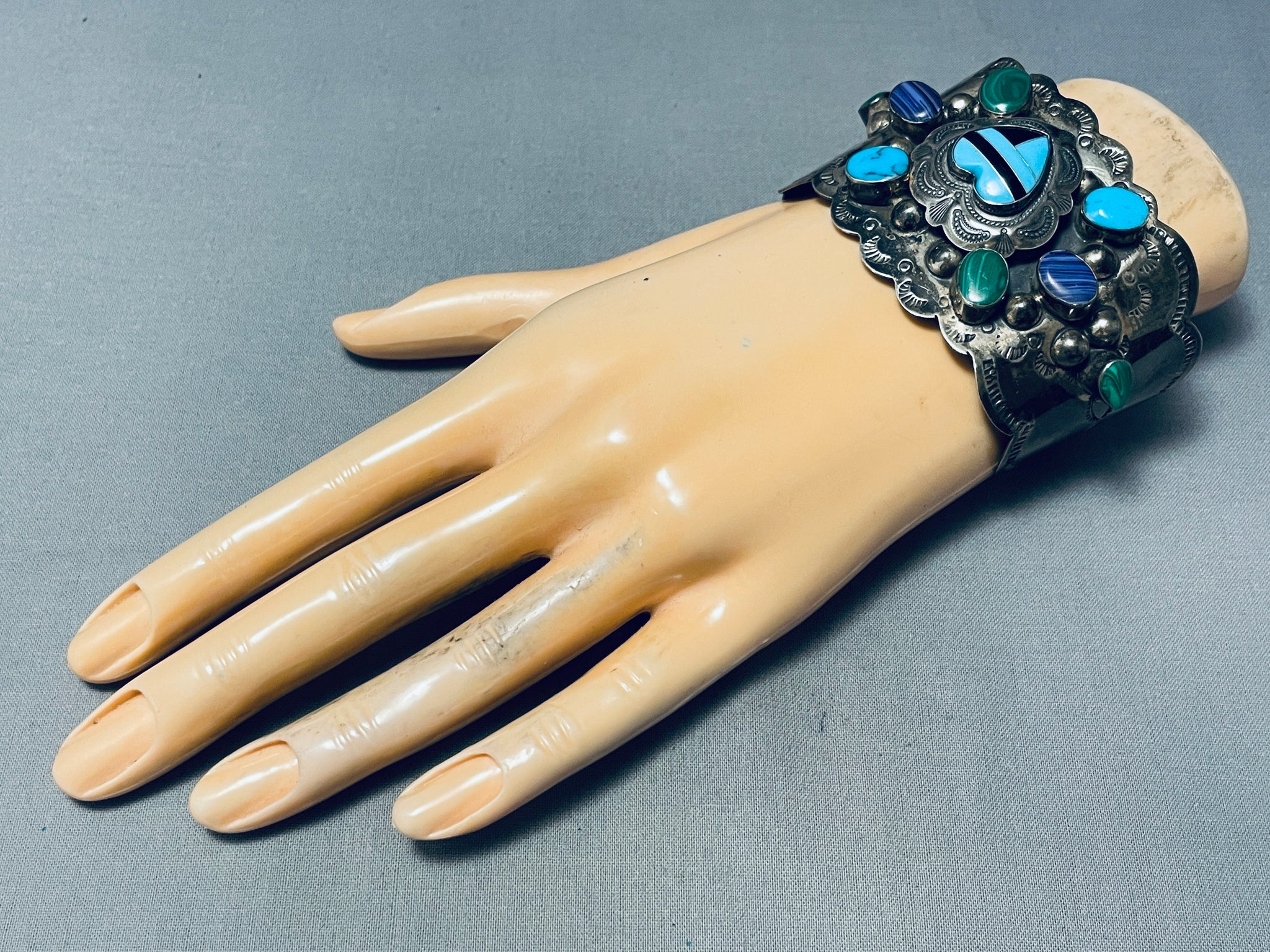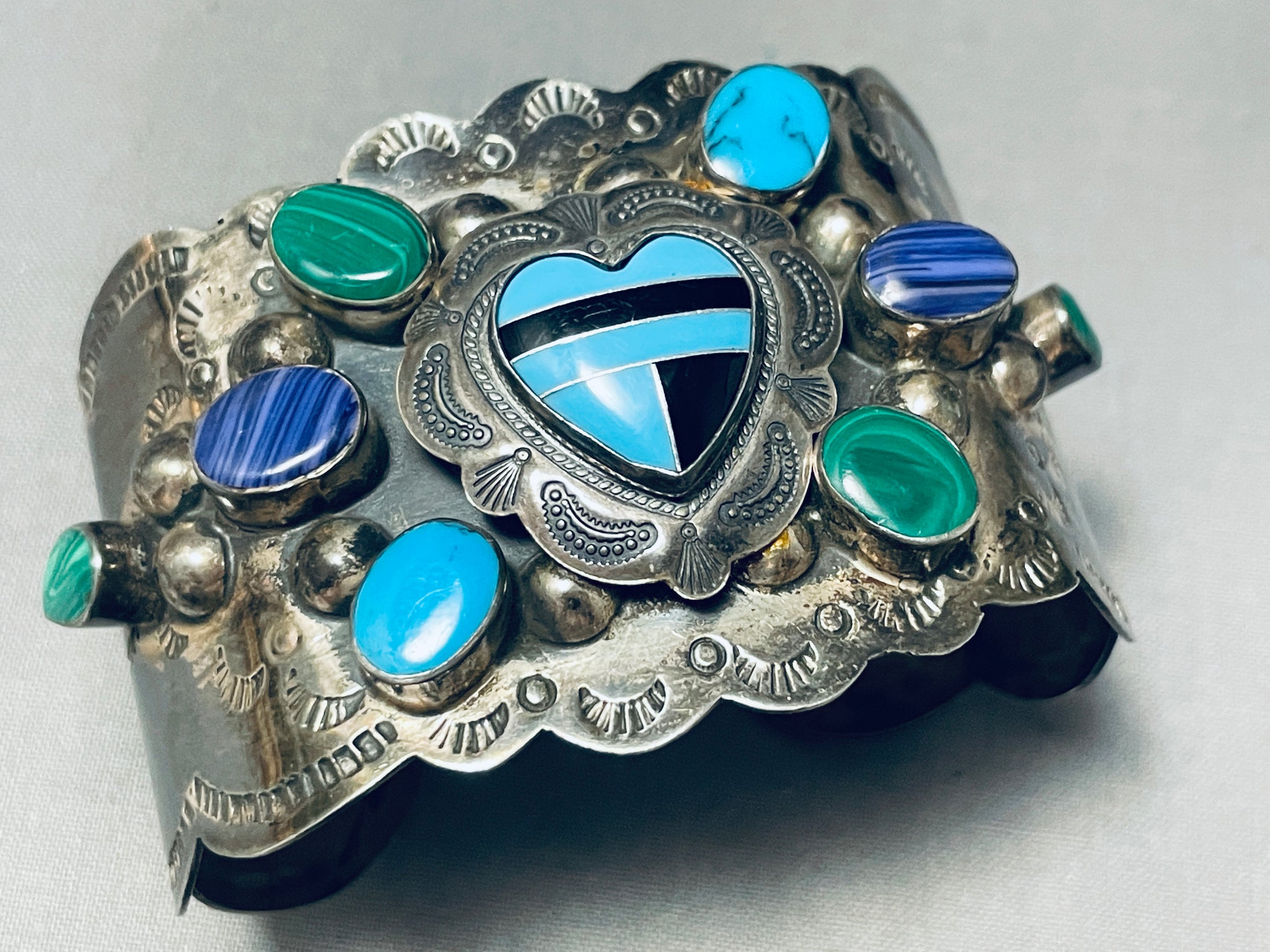 Native American Huge Vintage Navajo Turquoise Heart Sterling Silver Wide Bracelet Old