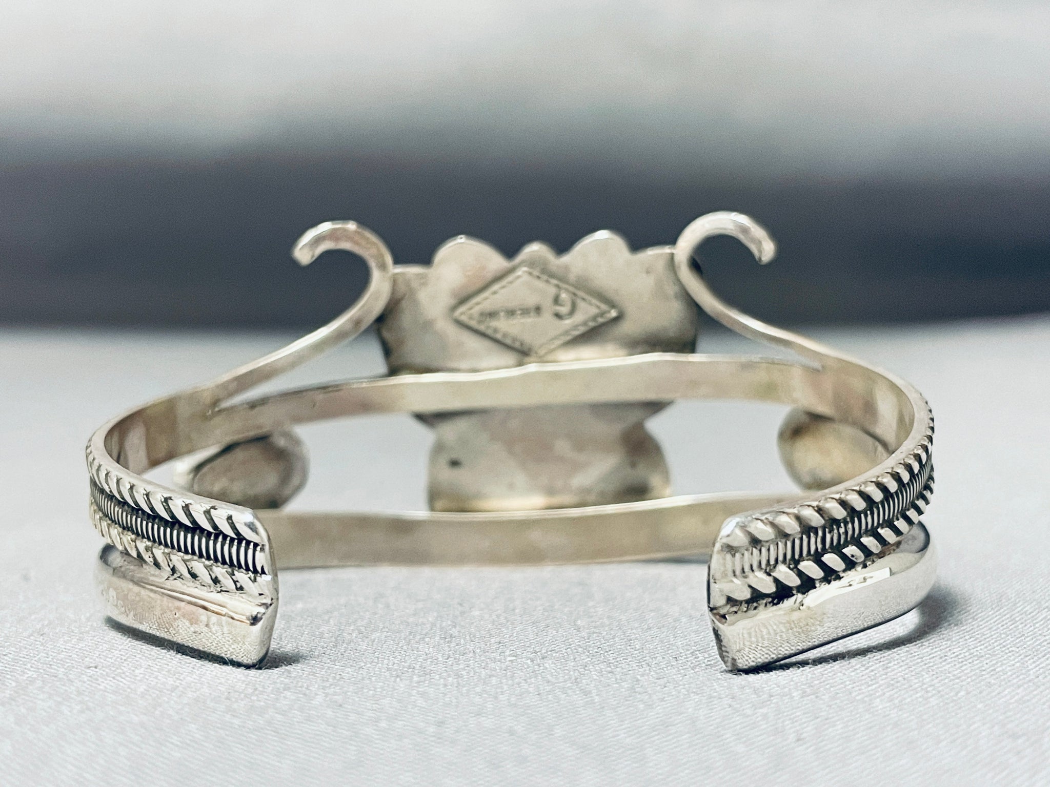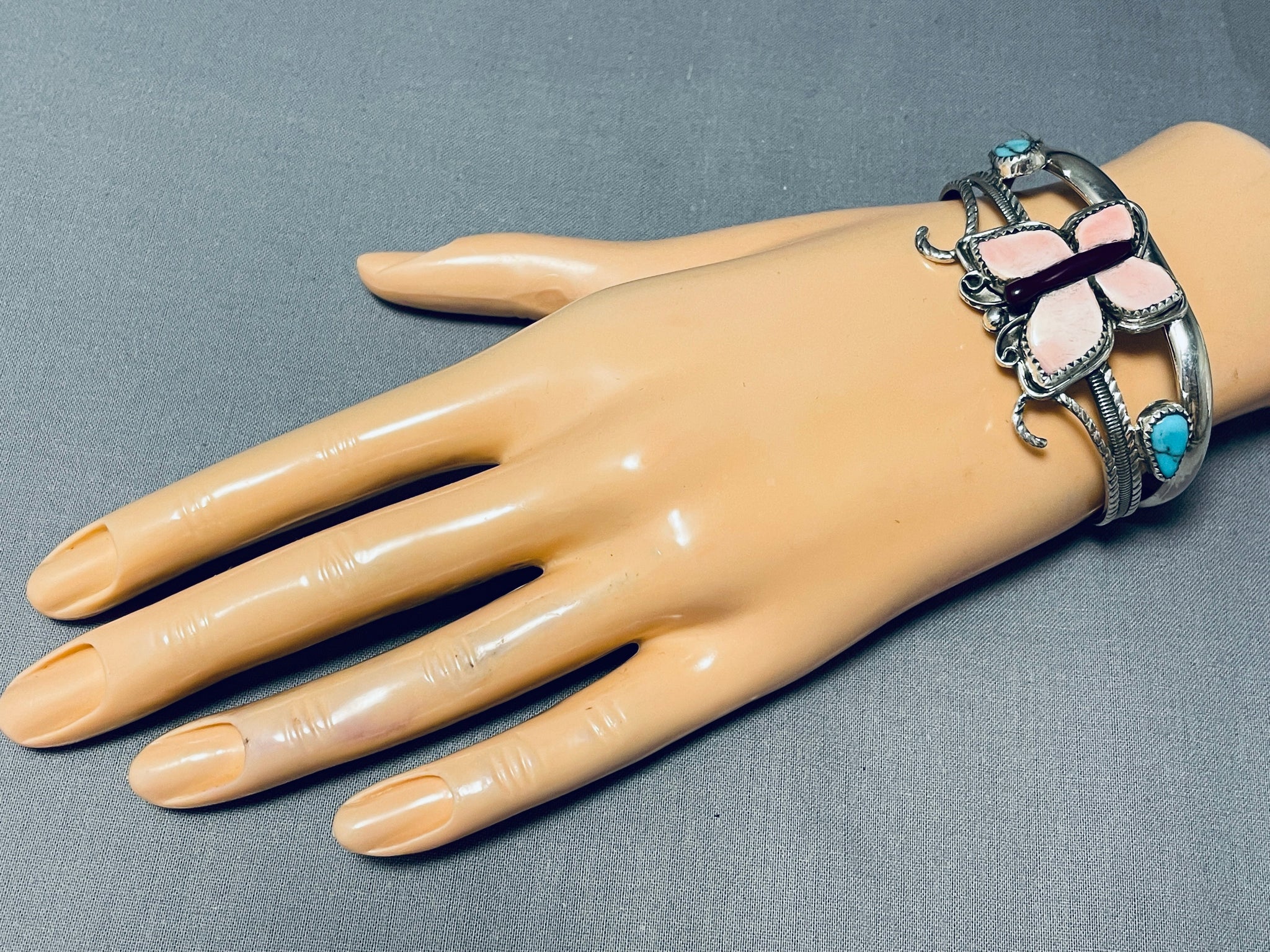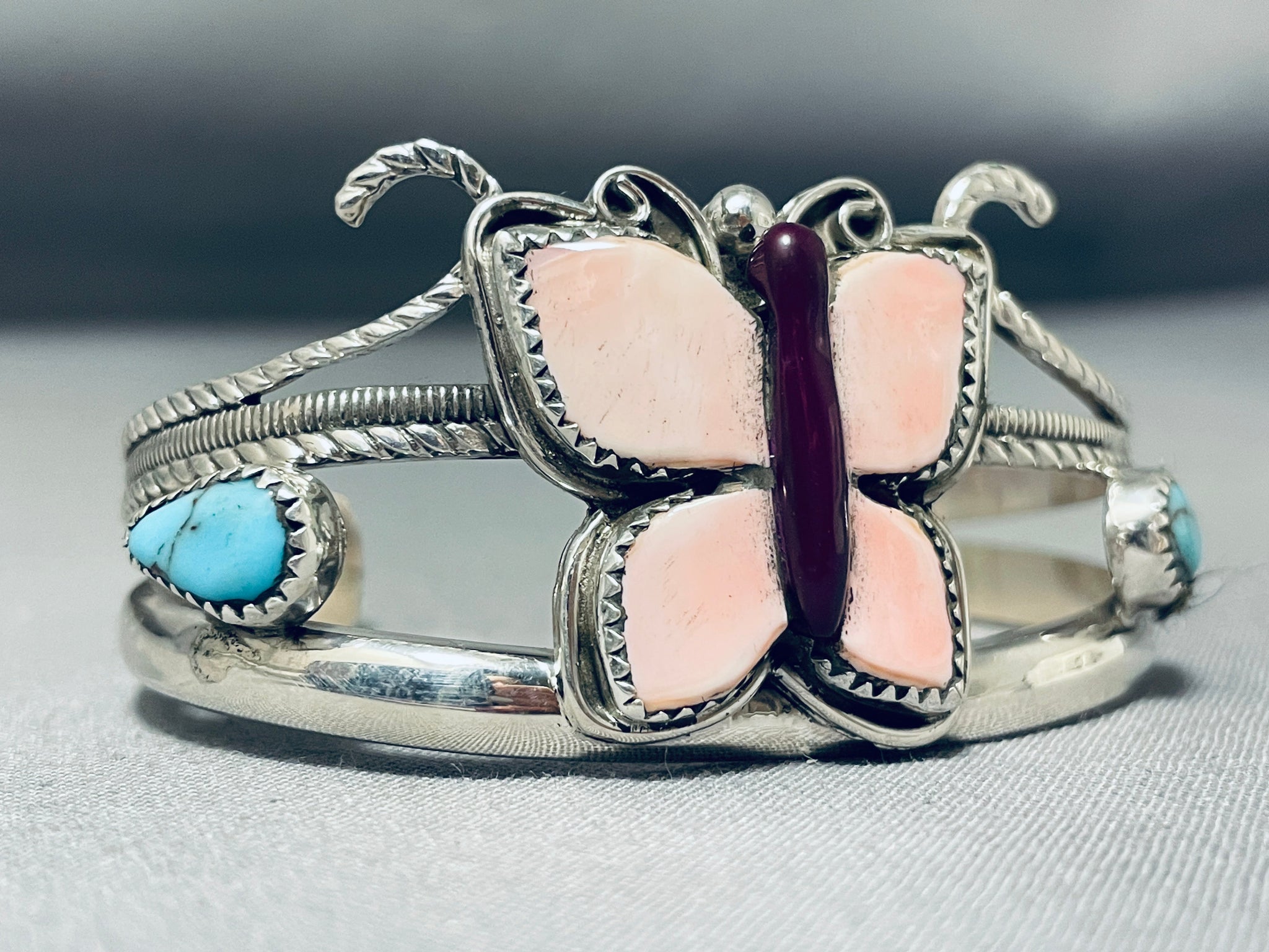 This is a marvelous inlaid butterfly silver bracelet handmade by the very famous artist, Francisco Gomez. This museum quality bracelet contains outstanding colors that consist of pink shell, purple shell and side accenting Bisbee turquoise stones. The turquoise stones are beautifully carved into large teardrop shapes. This bracelet is superior as the detailing of the double silver shank cuff is marvelous and superb including ropes and channel works. The width of the bracelet measures around 1-1/4". Signed by artist, Francisco Gomez. Sterling silver, marked. The inside end to end measures around 5-1/4" with an additional 1" gap. Sturdy 28 grams.