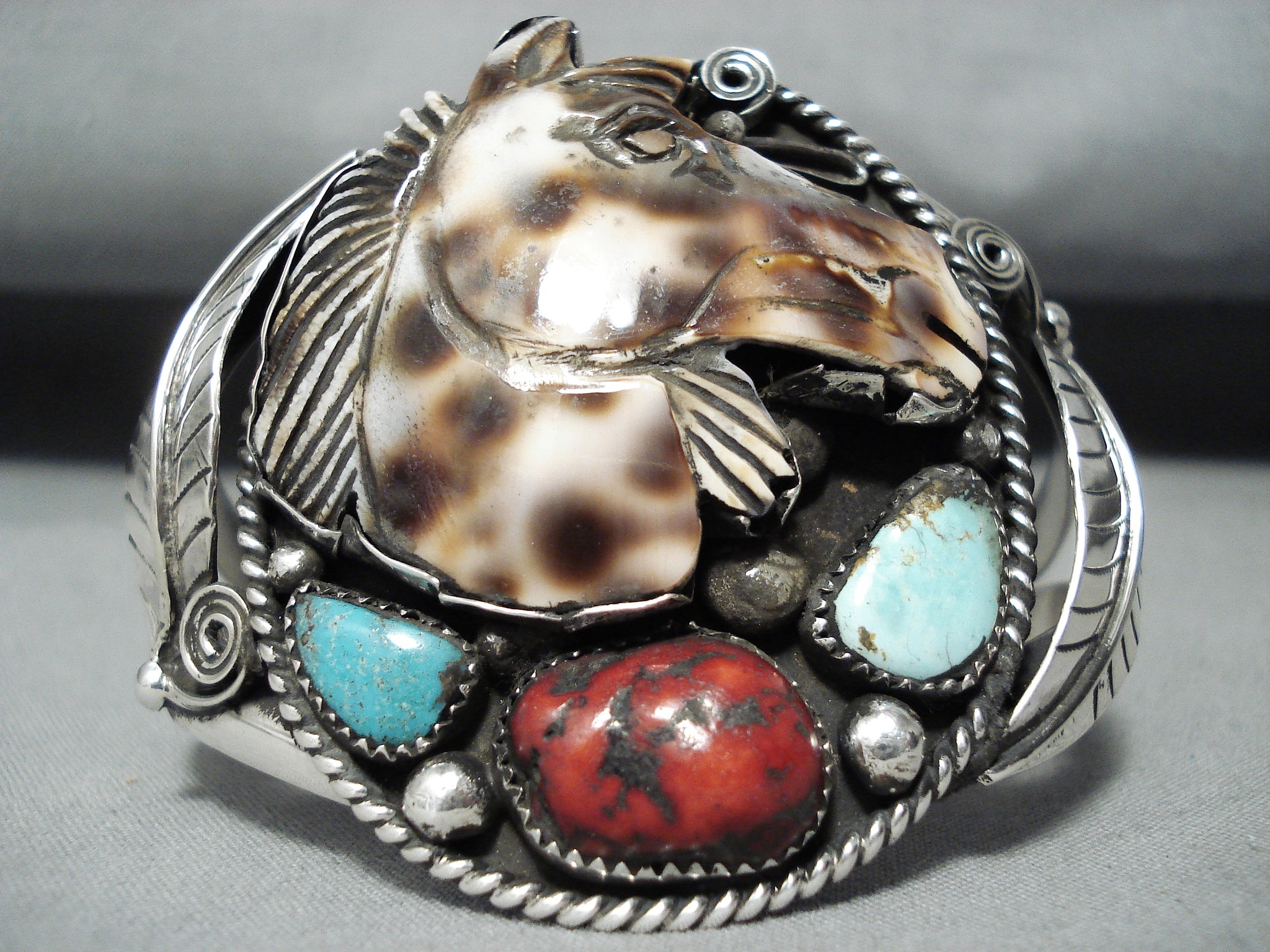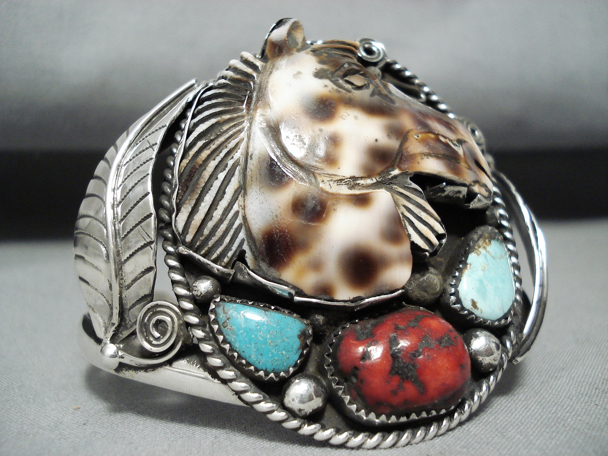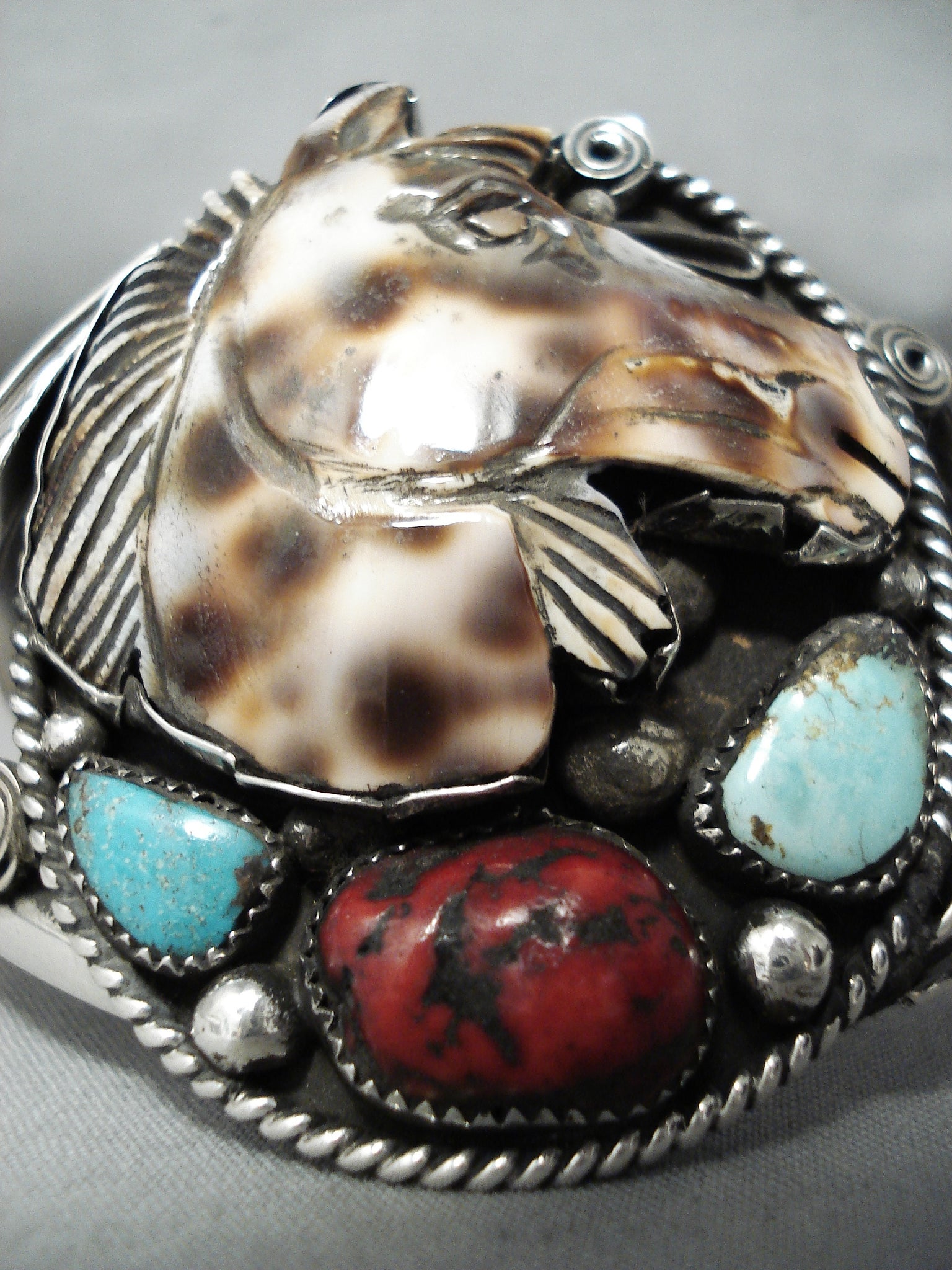 Native American Important Hand Carved Horse Turquoise Sterling Silver Bracelet Francisco Gomez