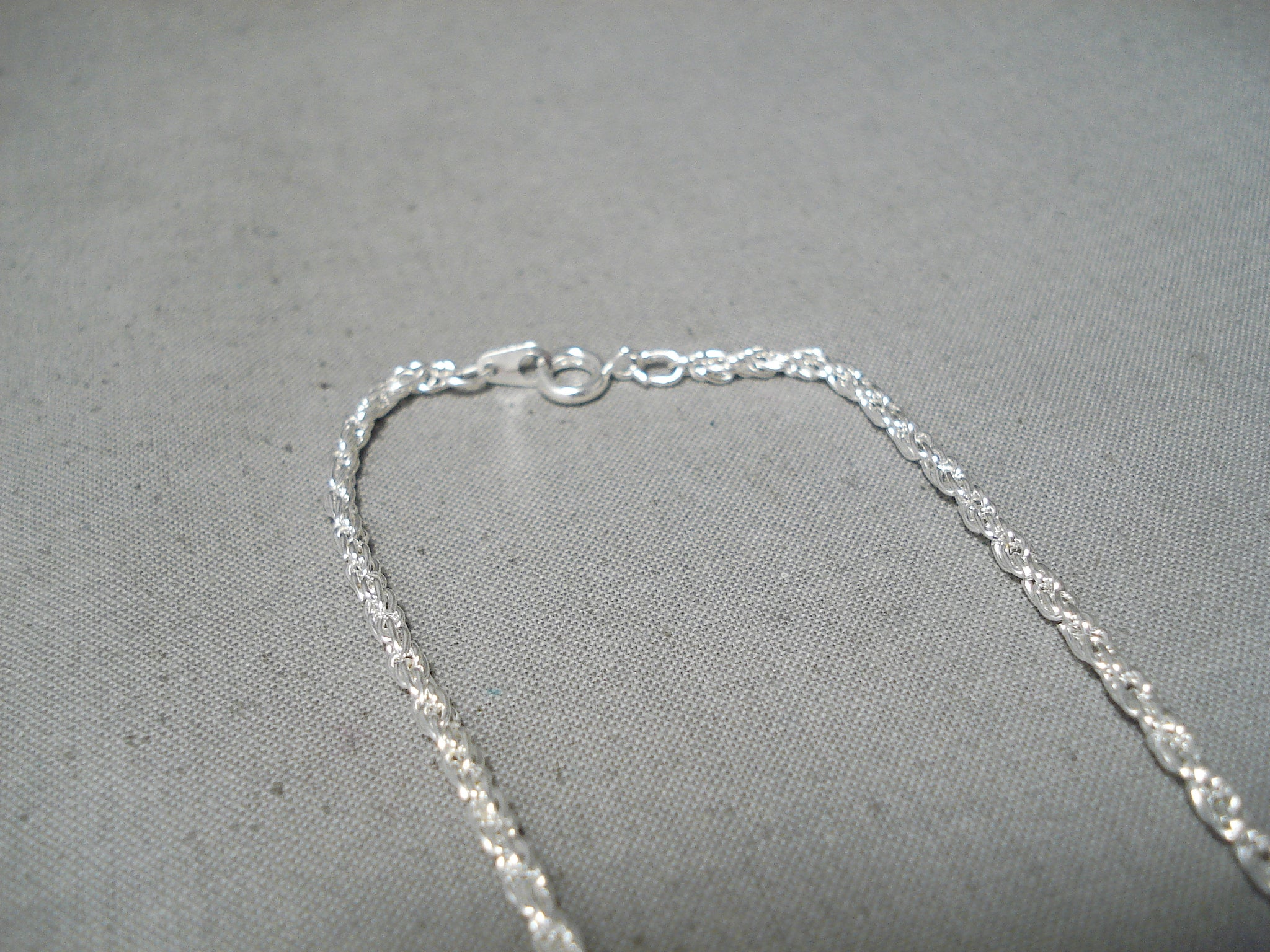 Here we have an incredible Navajo silver necklace having a large handcarved silver cross pendant with a Royston turquoise oval center and silver handstampings! The necklace has a silver chain with a handmade silver lobster clasp! Absolutely Amazing! The cross pendant measures about 1-3/4" x 1-1/4". Royston turquoise oval measures around 1/2" x 3/8". Silver bail measures about 1/4" x 1/4". Sterling silver, marked. Signed by Navajo artist, Jeanette Dale. The length of the necklace measures around 17". Sturdy 11 grams.