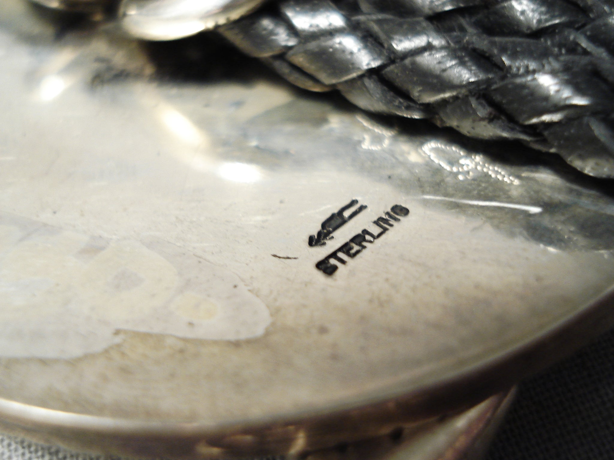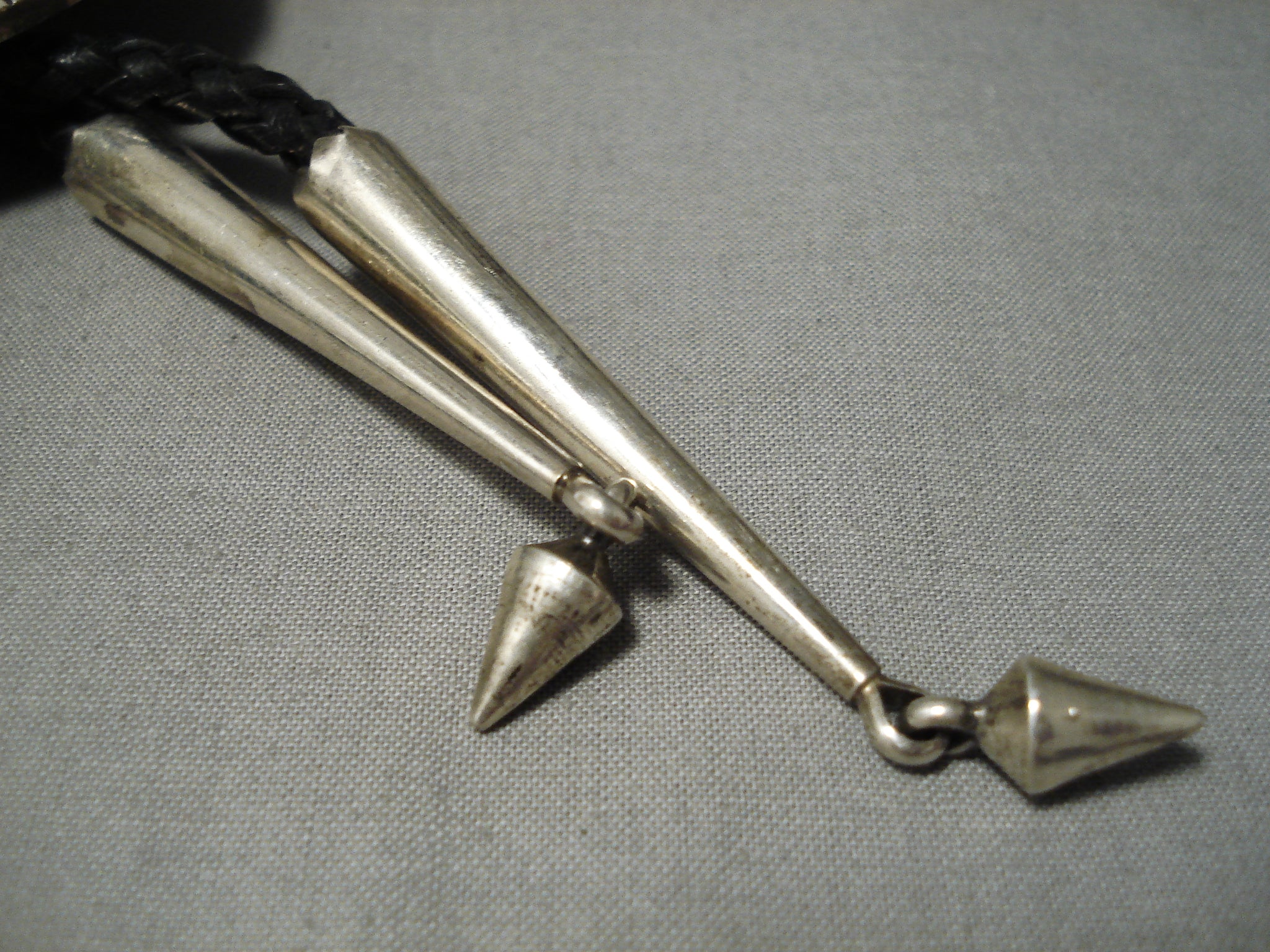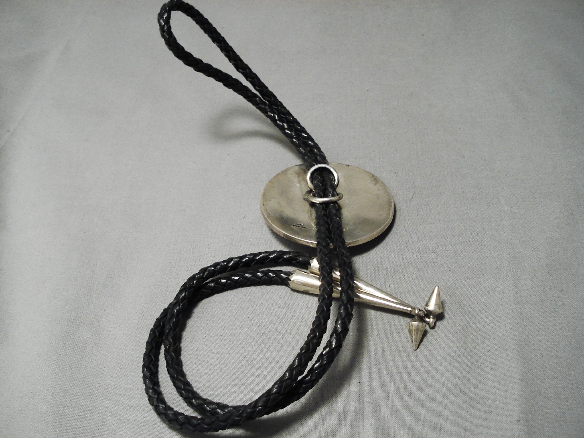 This is an incredible vintage Navajo inlaid scorpian silver bolo tie. This is one of the finest bolo ties we have collected all. The bolo was handmade by the famous artist, WIll Manning with the inlay done by James Mcabe. The bolo consists of an incredible intricate scorpian inlay that appears to be from the wonderful new Lander Blue turquoise mine. The silver is incredibly thick and heavy with accenting sun bursting patterns. The bolo measures a mind blowing 2-1/2" in diameter. Resting at the end of the 38" thick black leather tie are long silver cones with accenting dangling silver spikes. Signed by Navajo artist, Will Manning . Sterling silver, marked. Cir. 1970's+. Sturdy 116 grams.