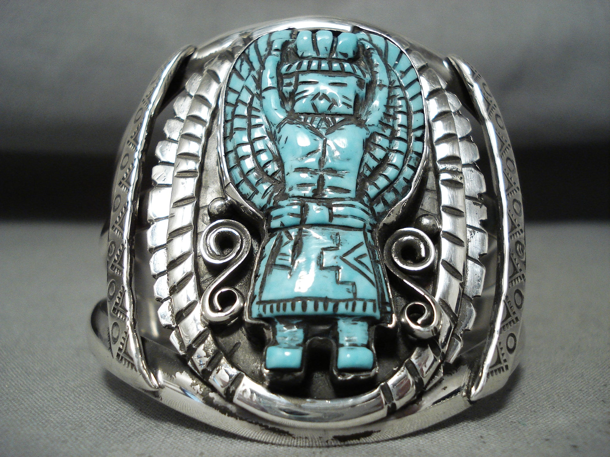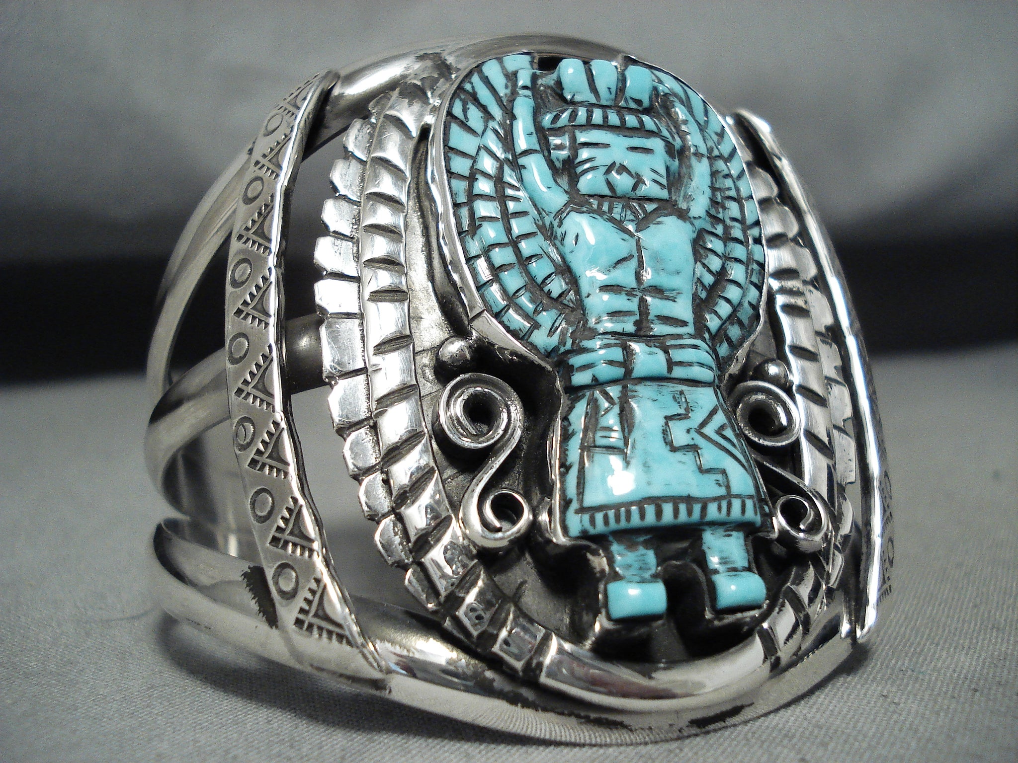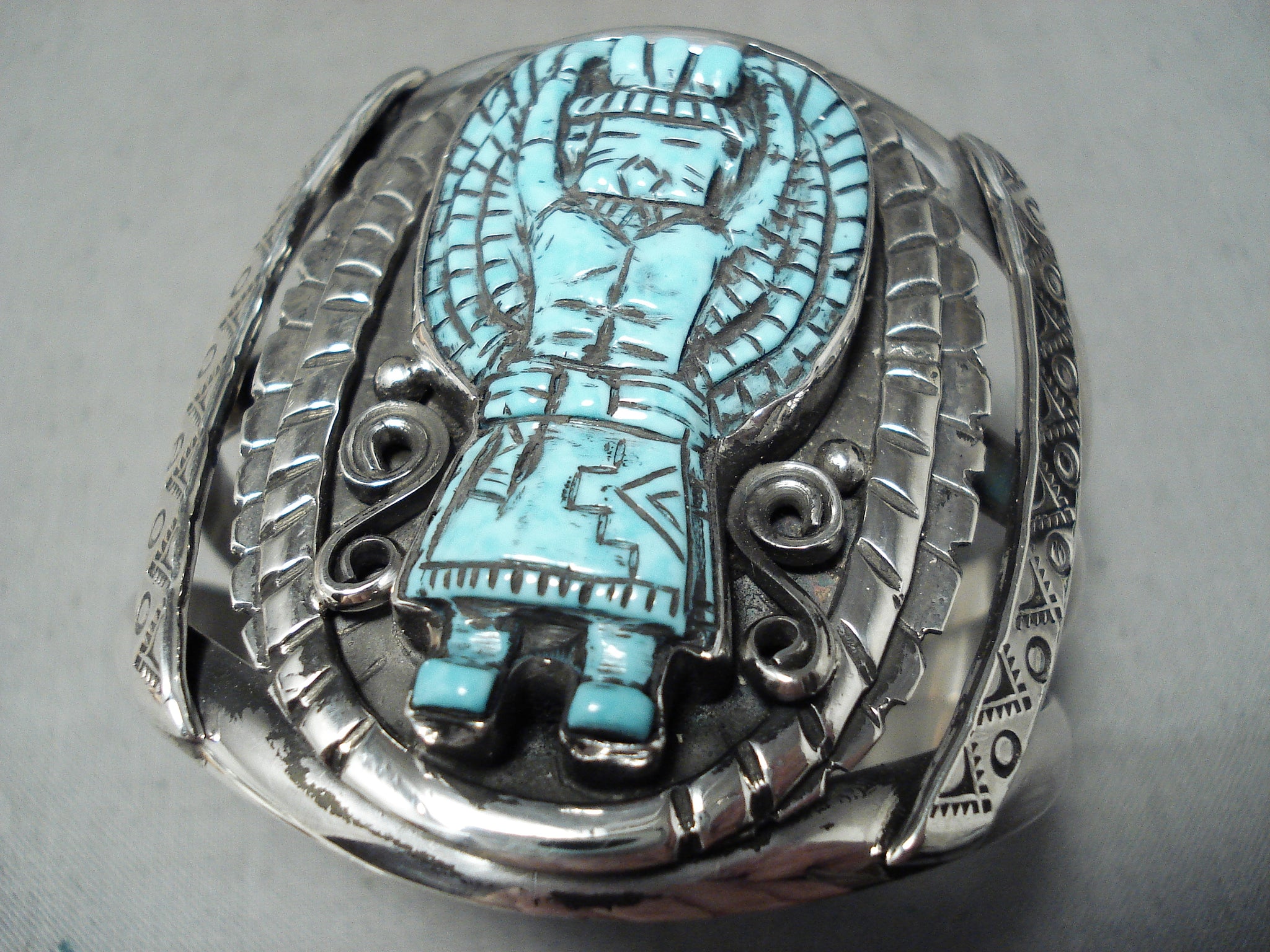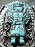Native American Incredibly Intricate Hand Carved Turquoise Sterling Silver Kachina Bracelet