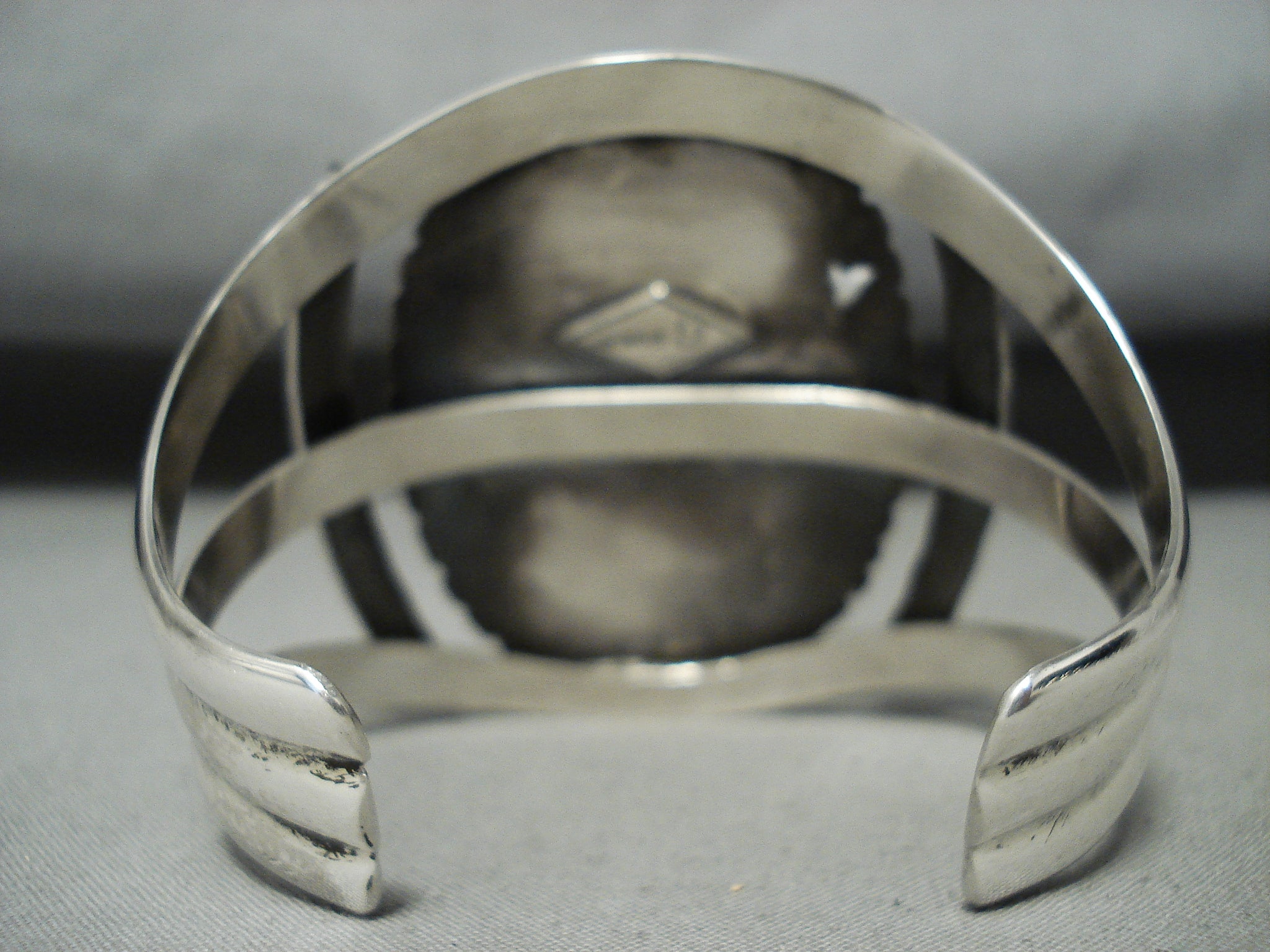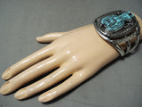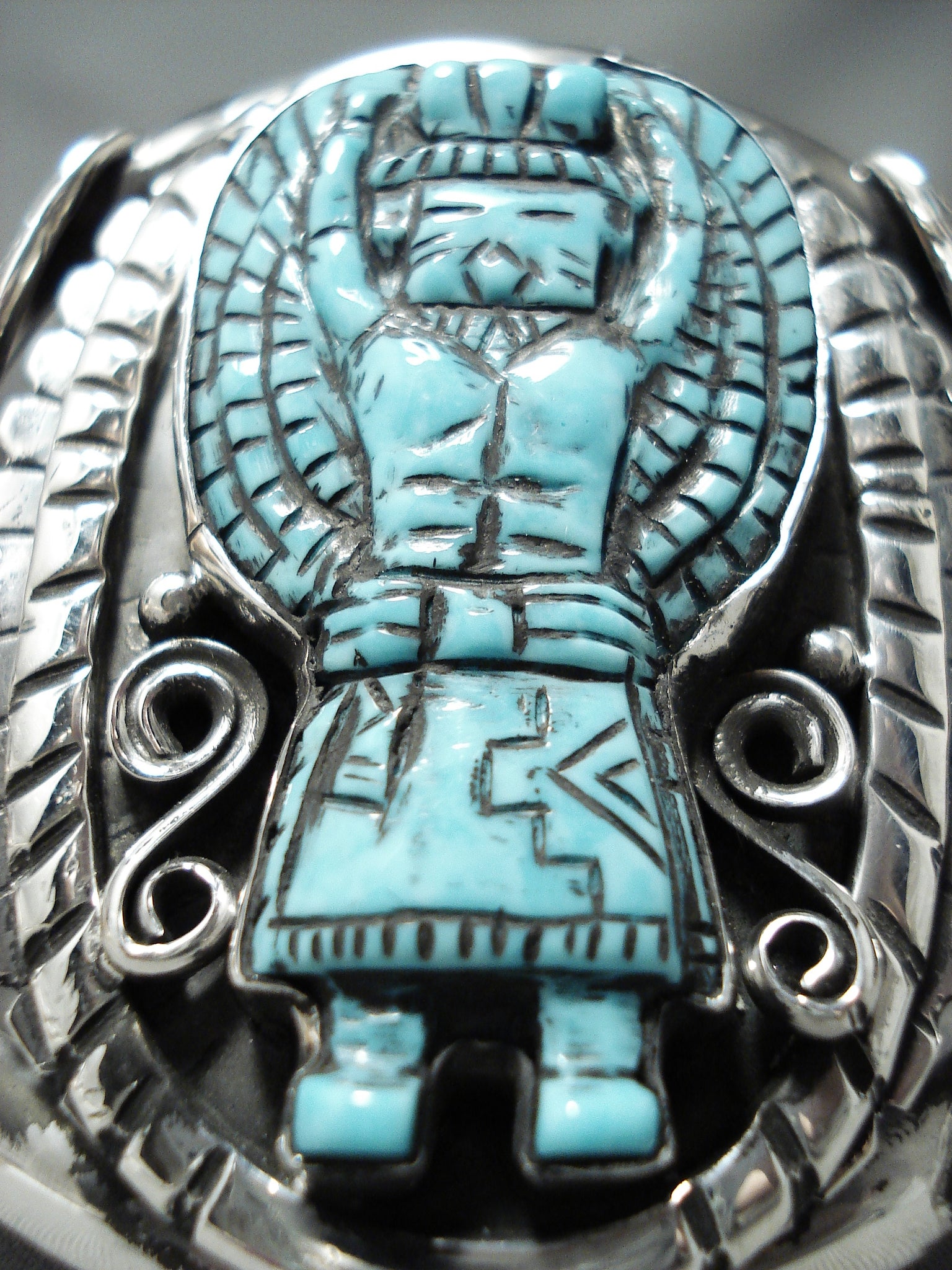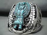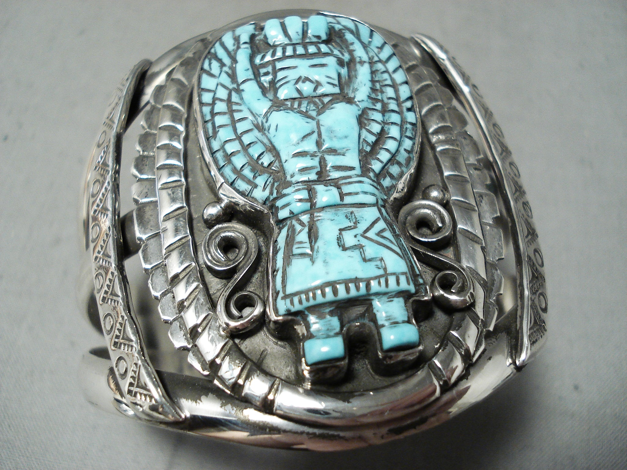Native American Incredibly Intricate Hand Carved Turquoise Sterling Silver Kachina Bracelet