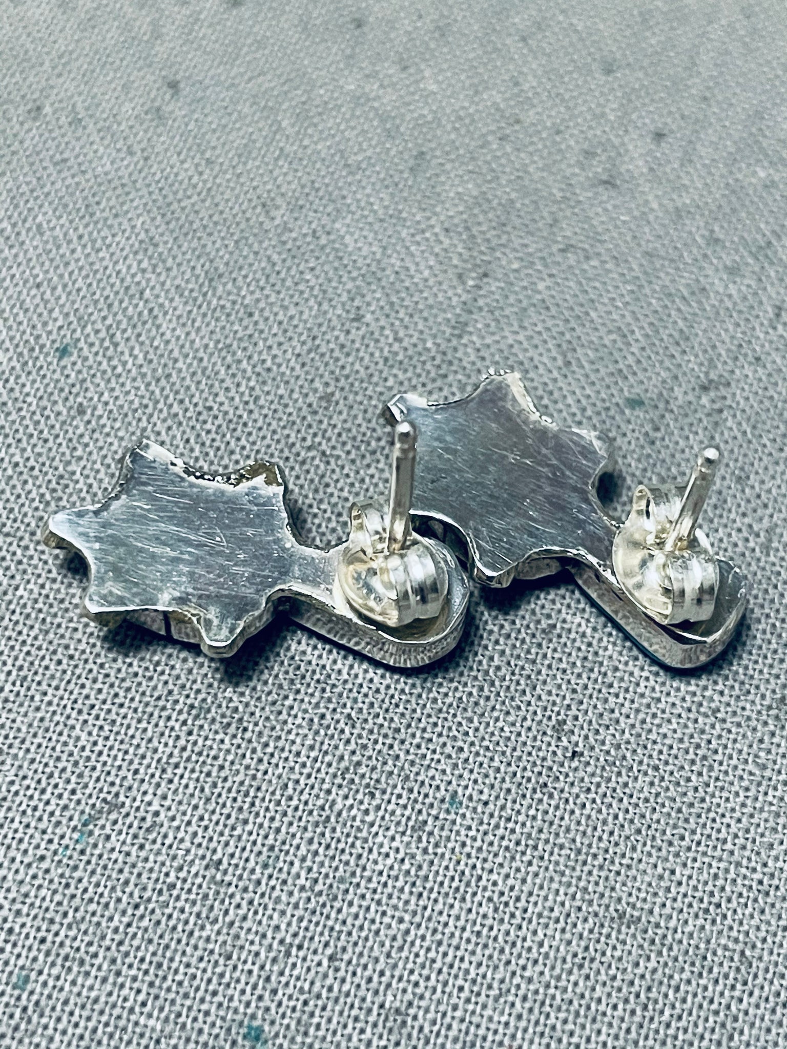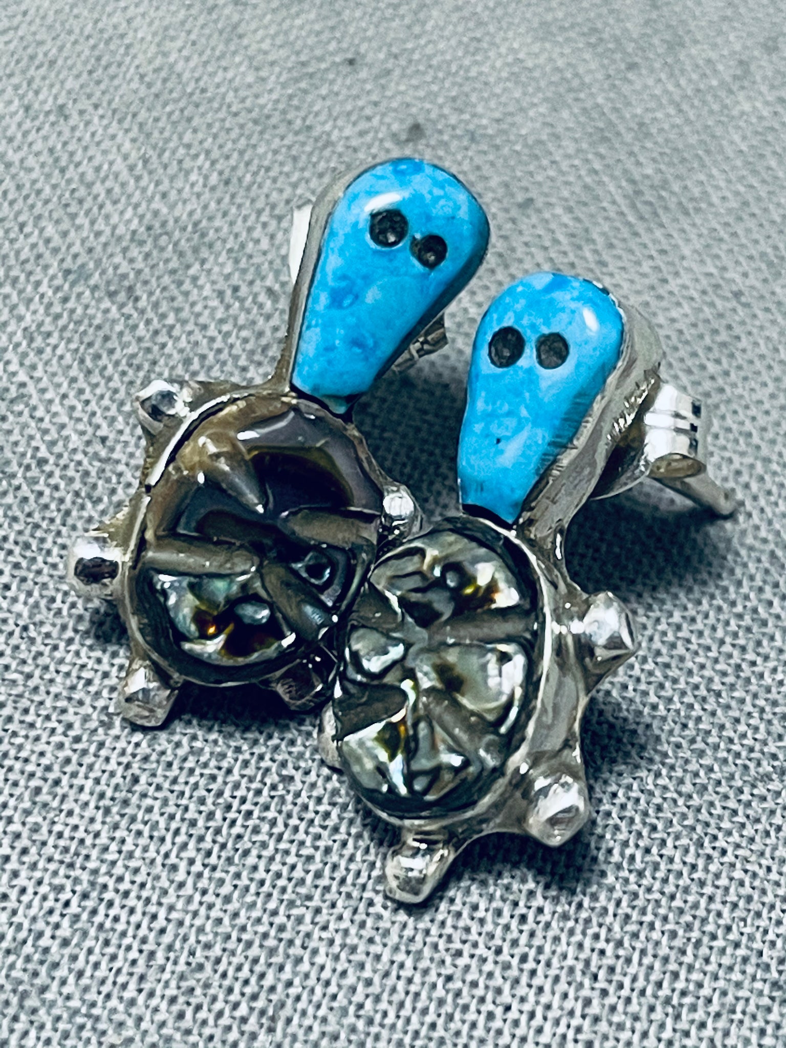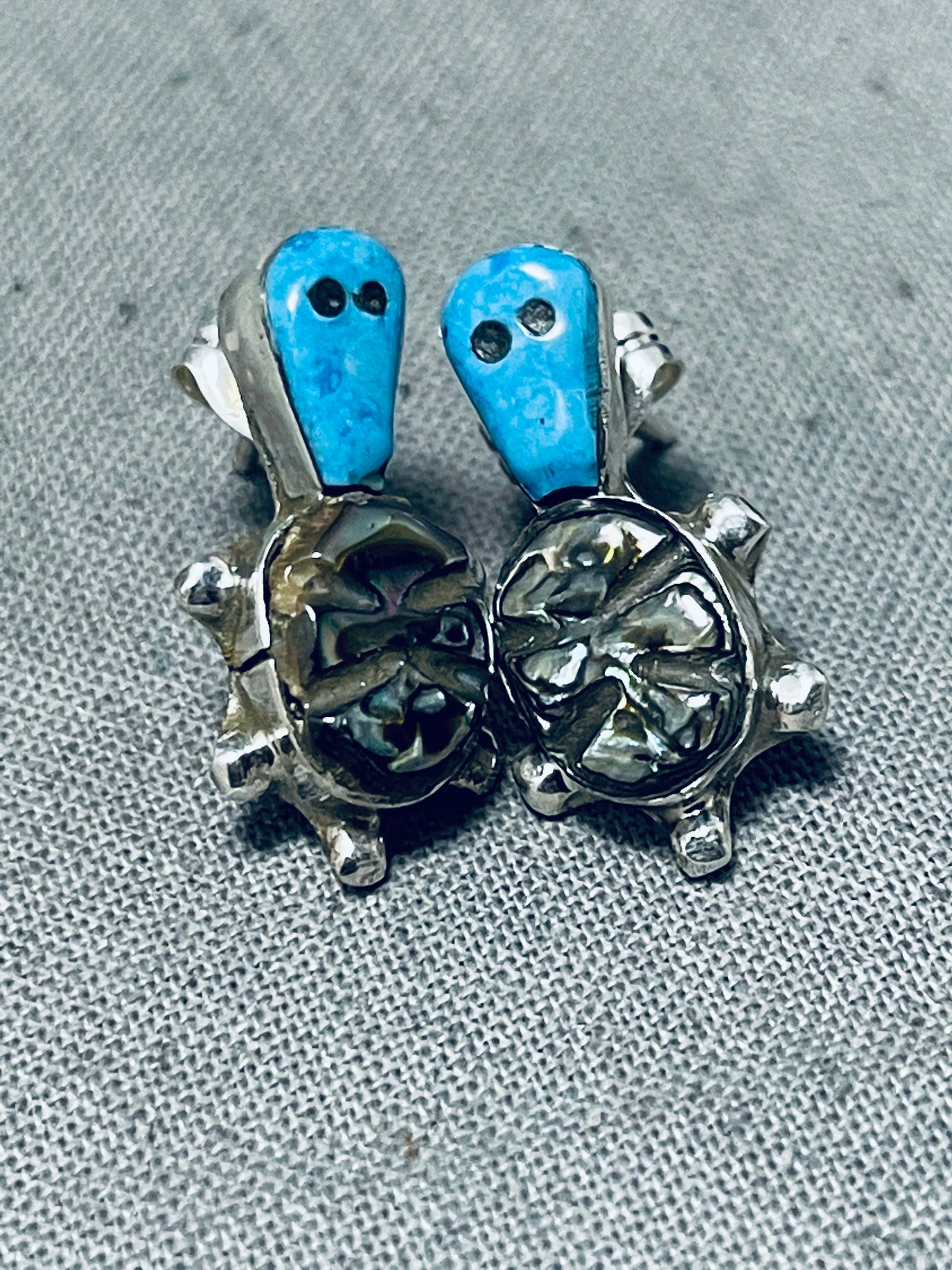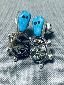 Native American Intricate Turtle Vintage Navajo Turquoise Sterling Silver Earrings