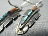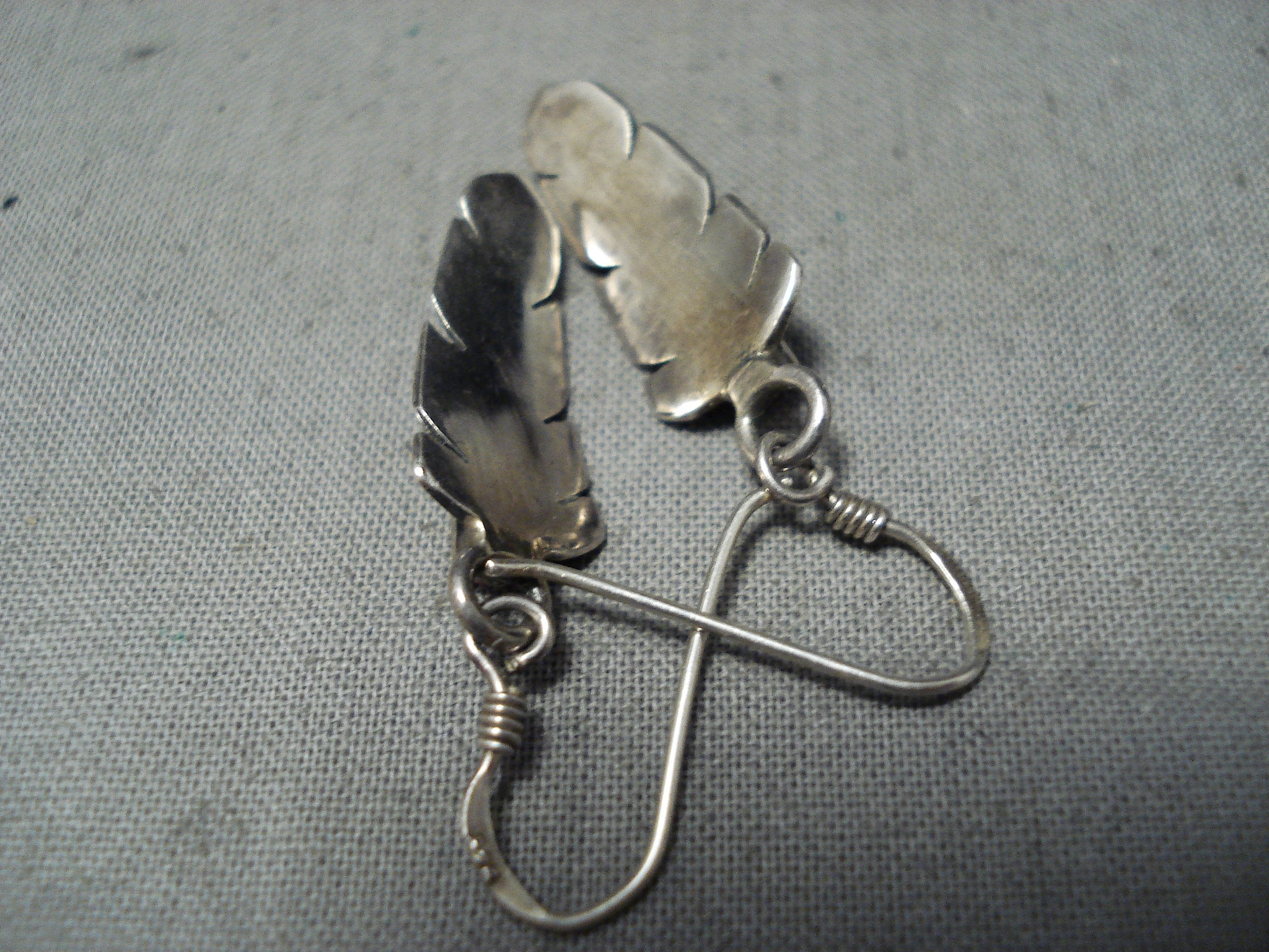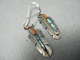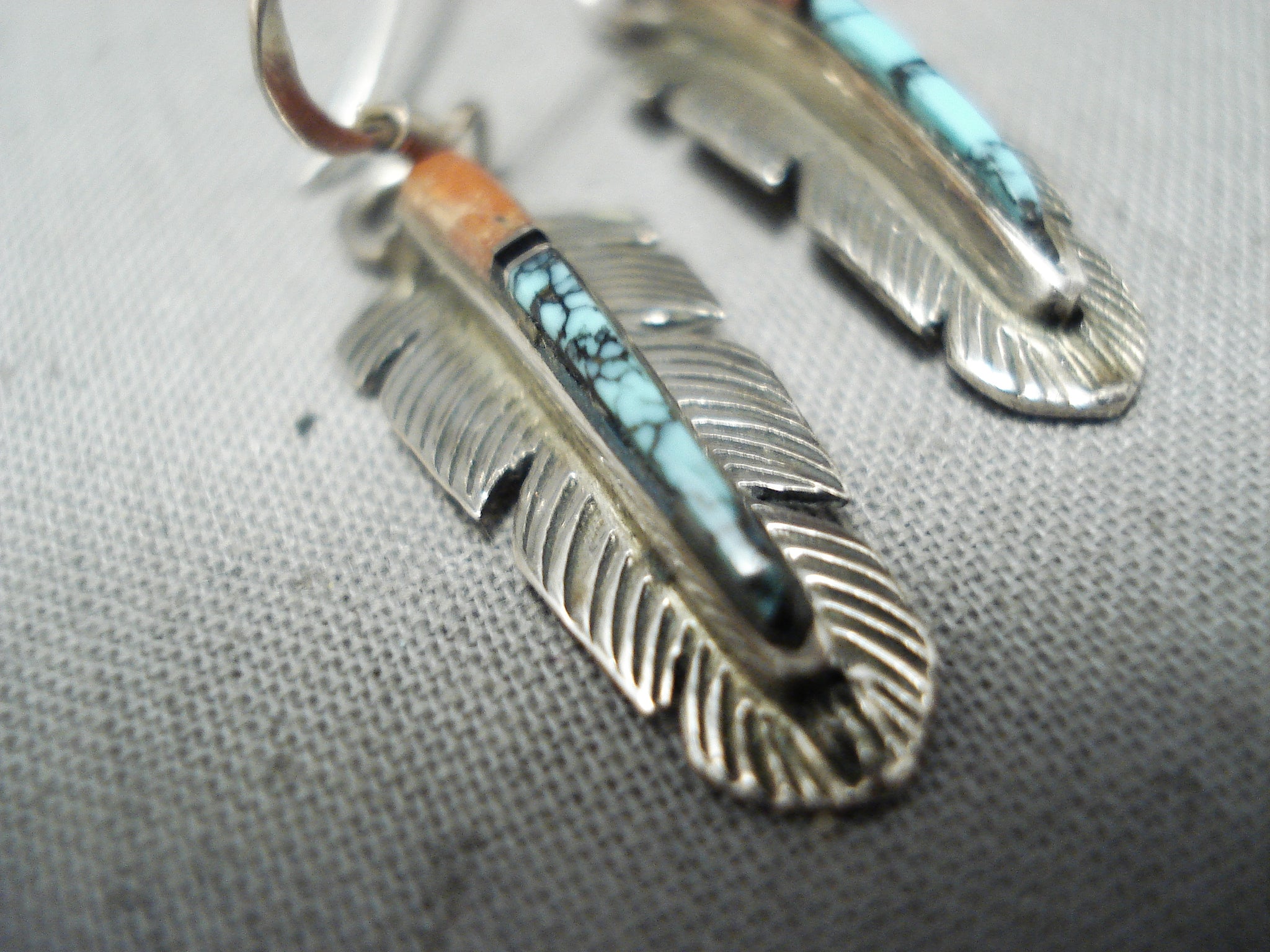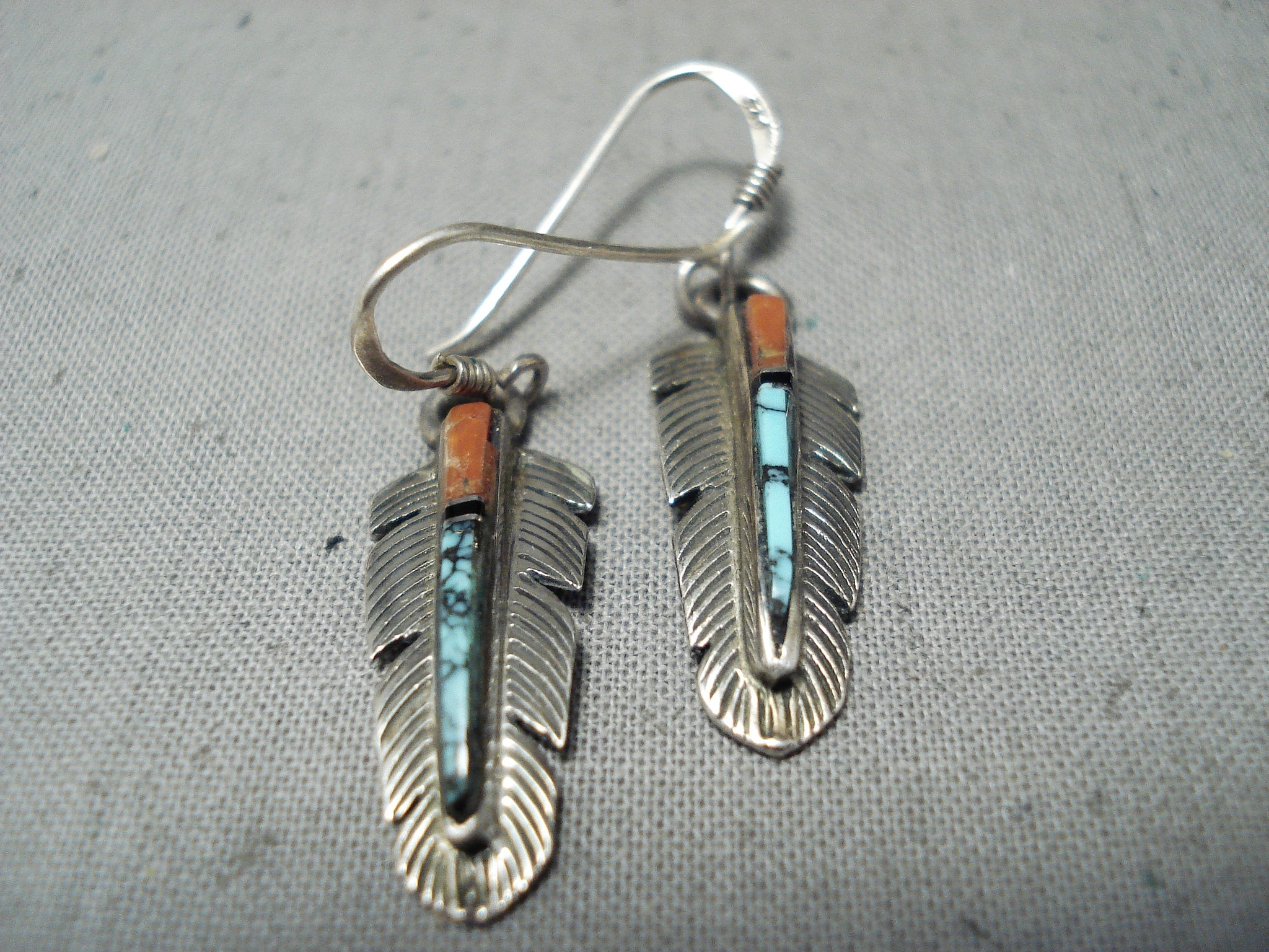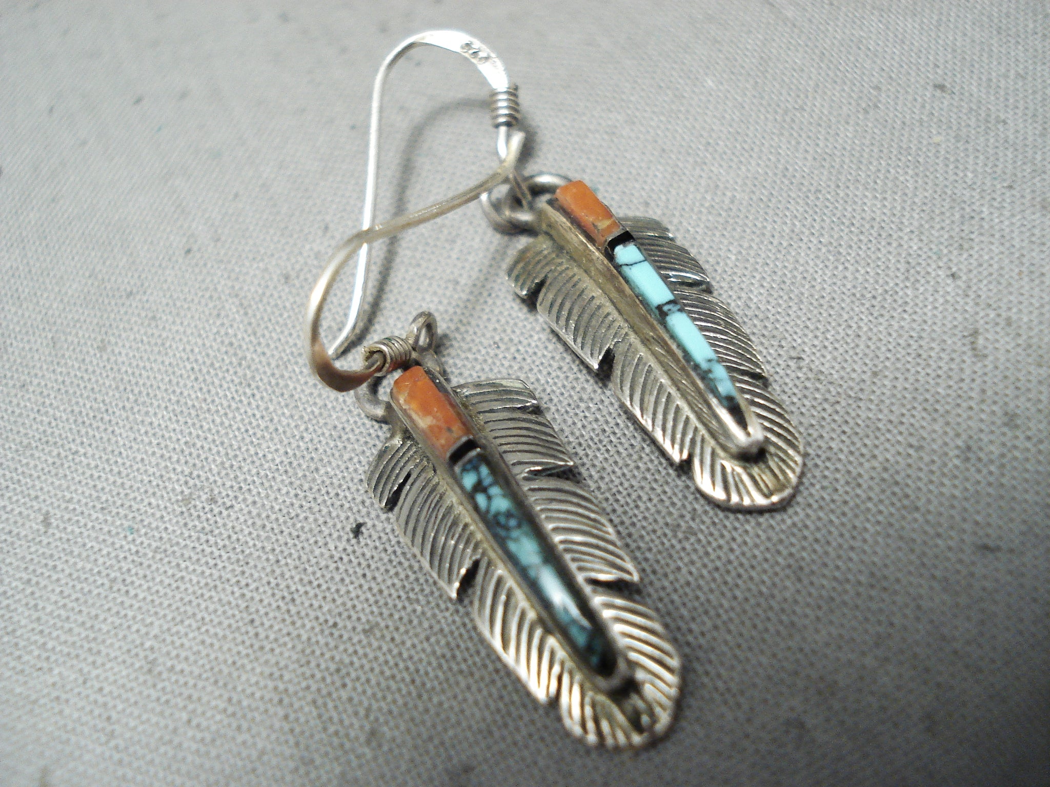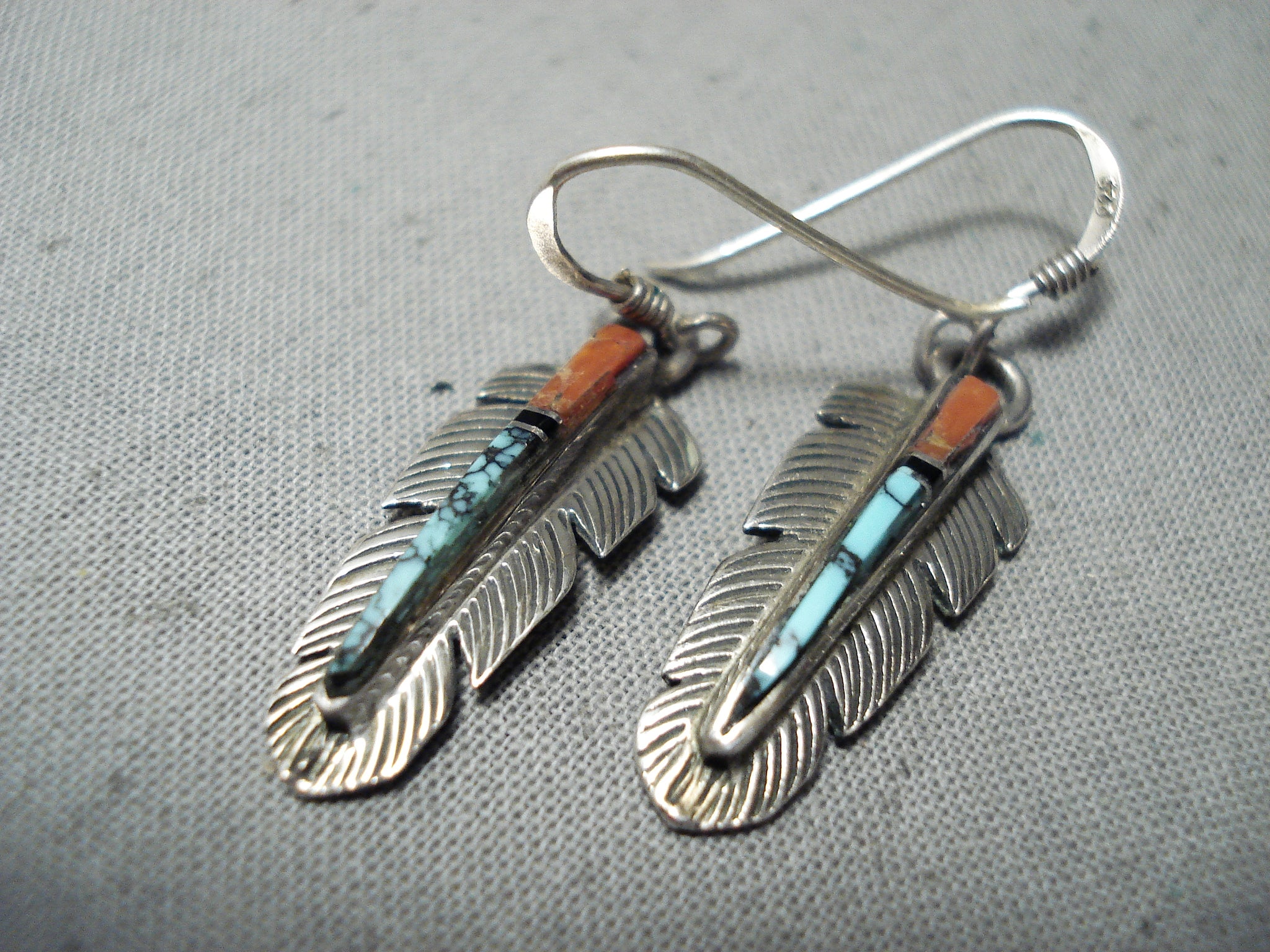 Native American Intricate Vintage Navajo Feather Turquoise Inlay Sterling Silver Earrings