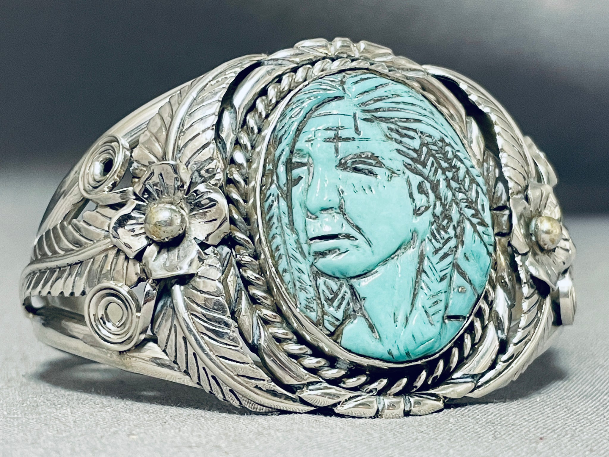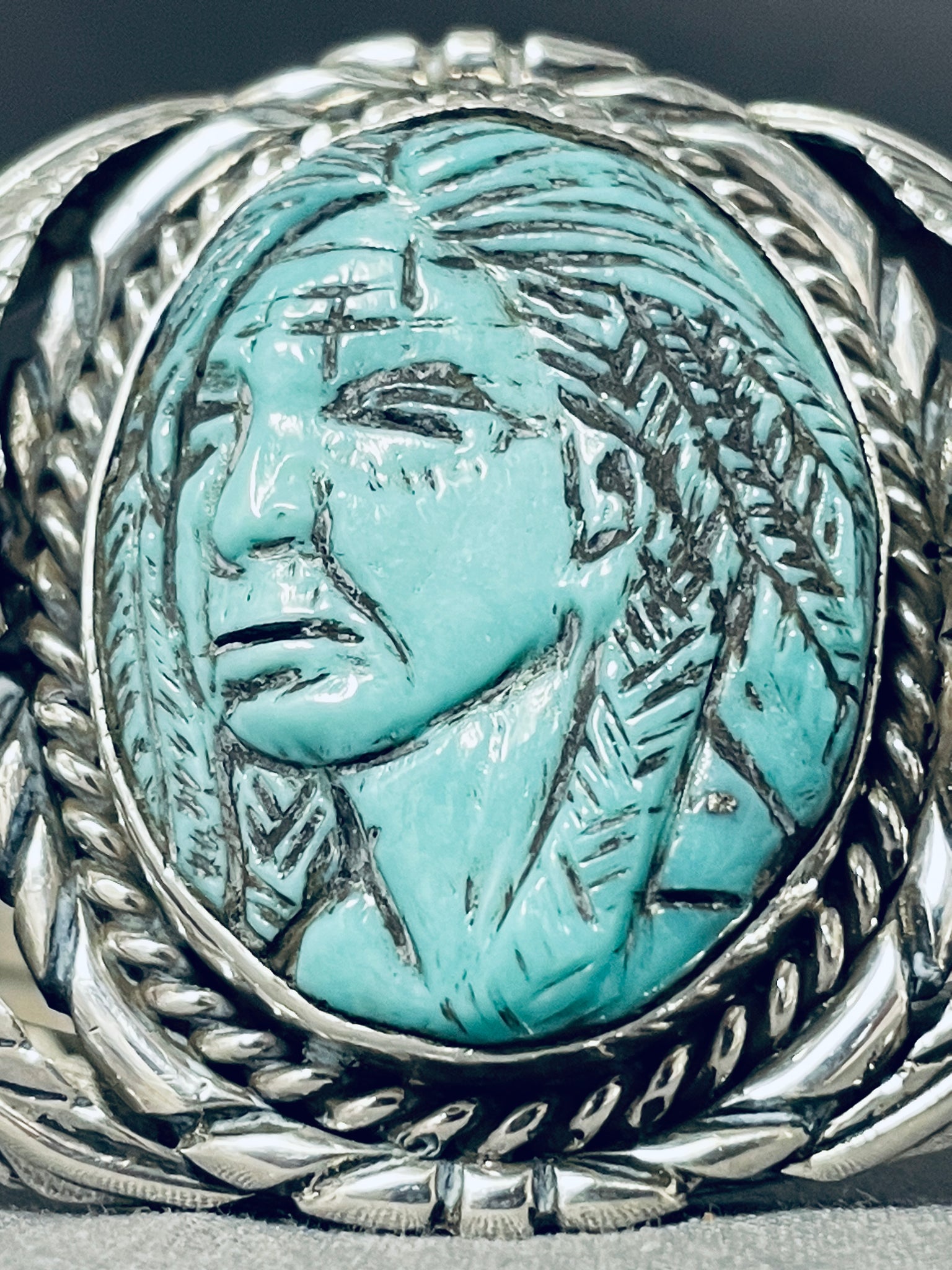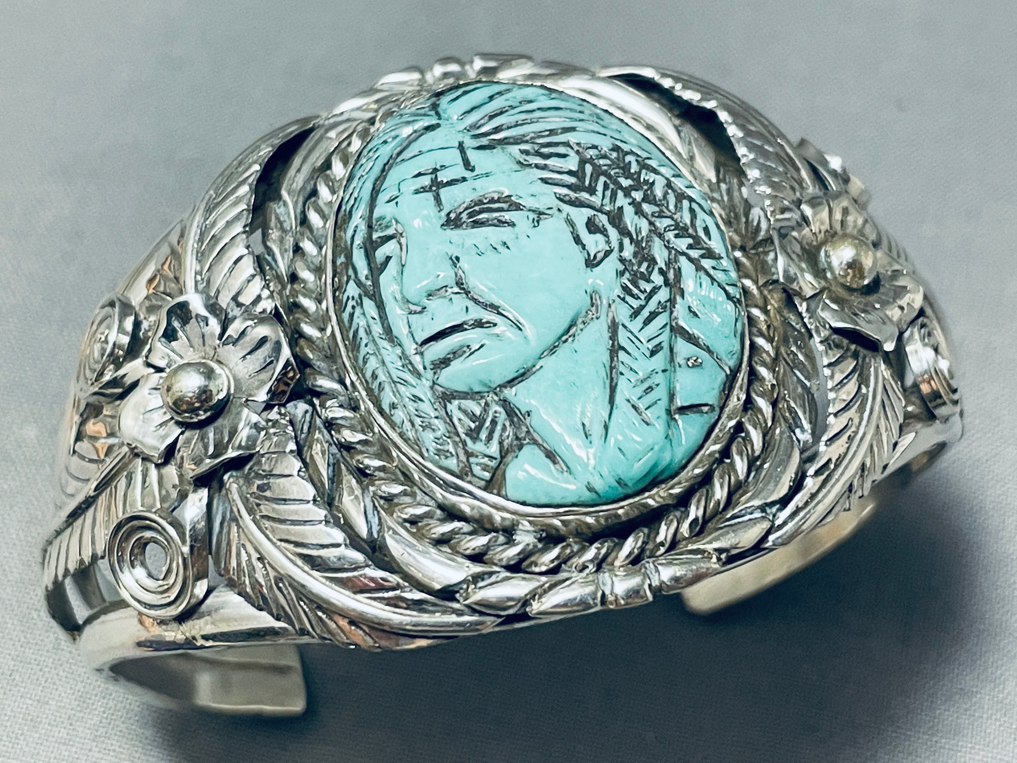 Native American One Of The Most Intricate Ever Hand Carved Turquoise Sterling Silver Bracelet