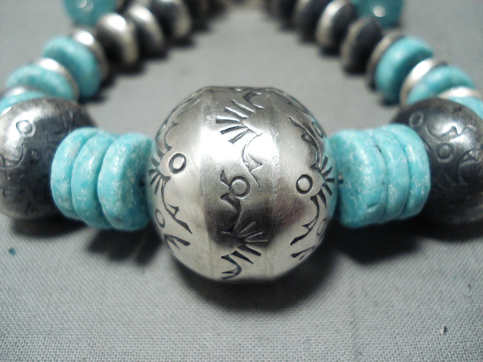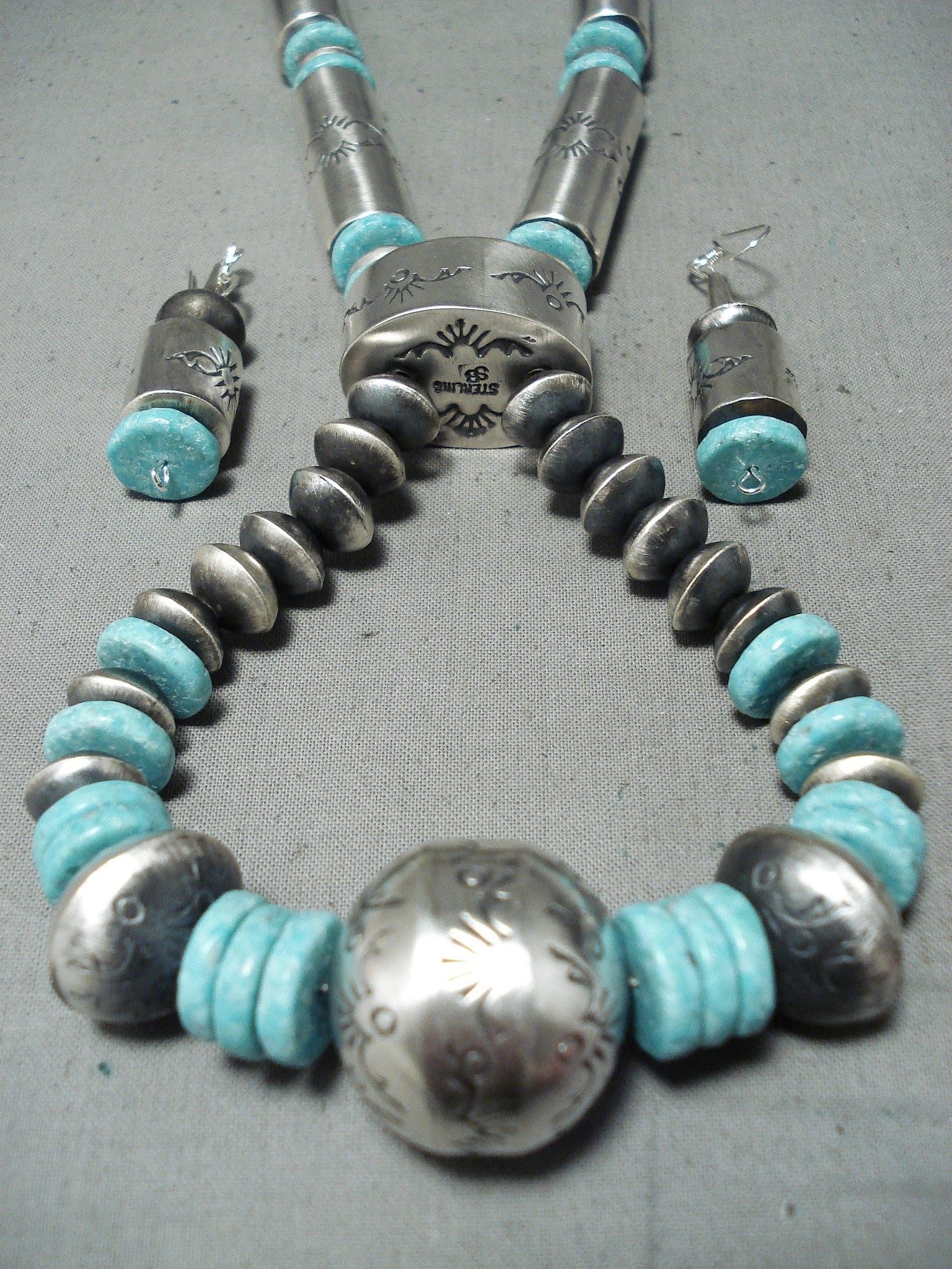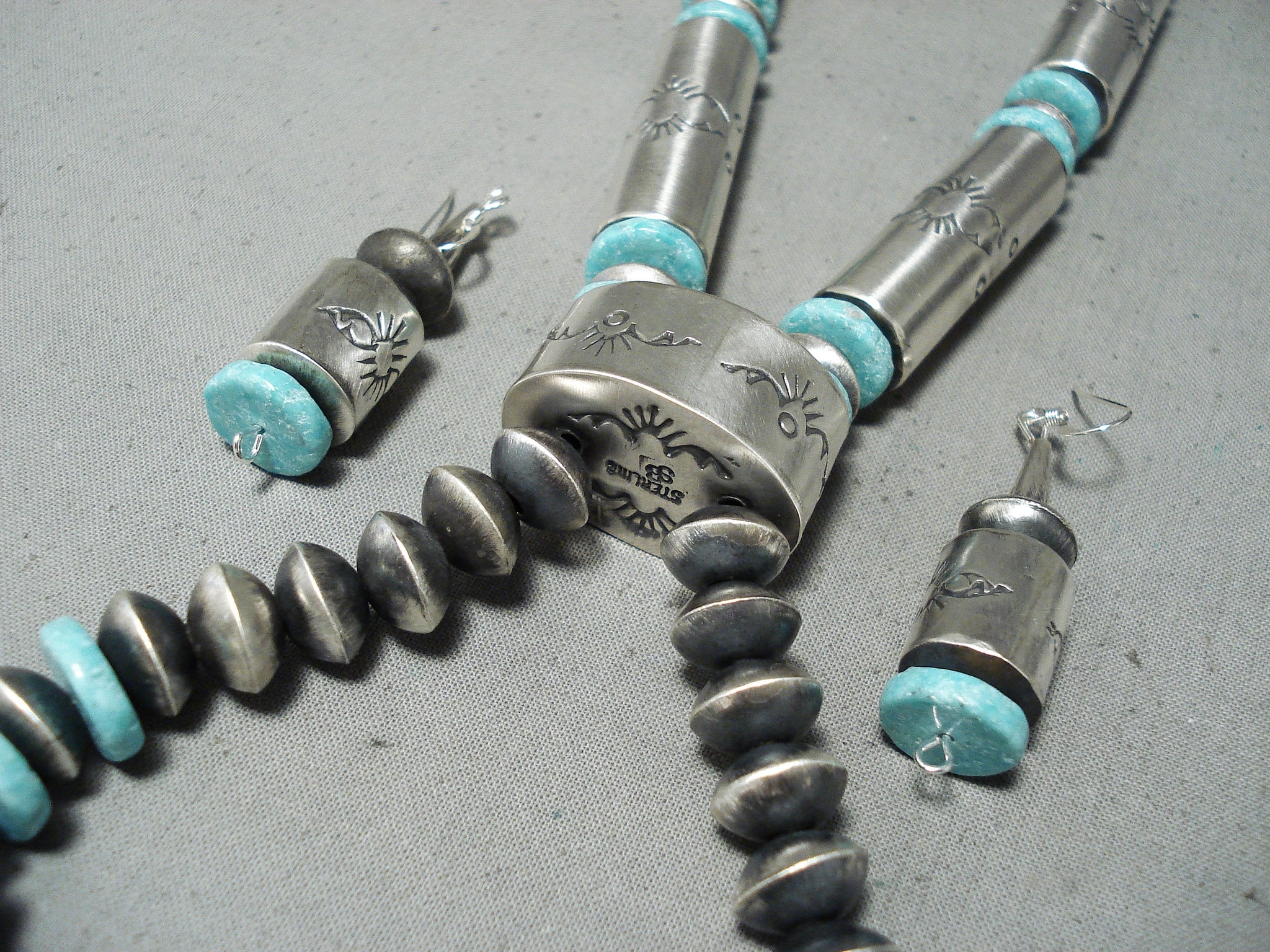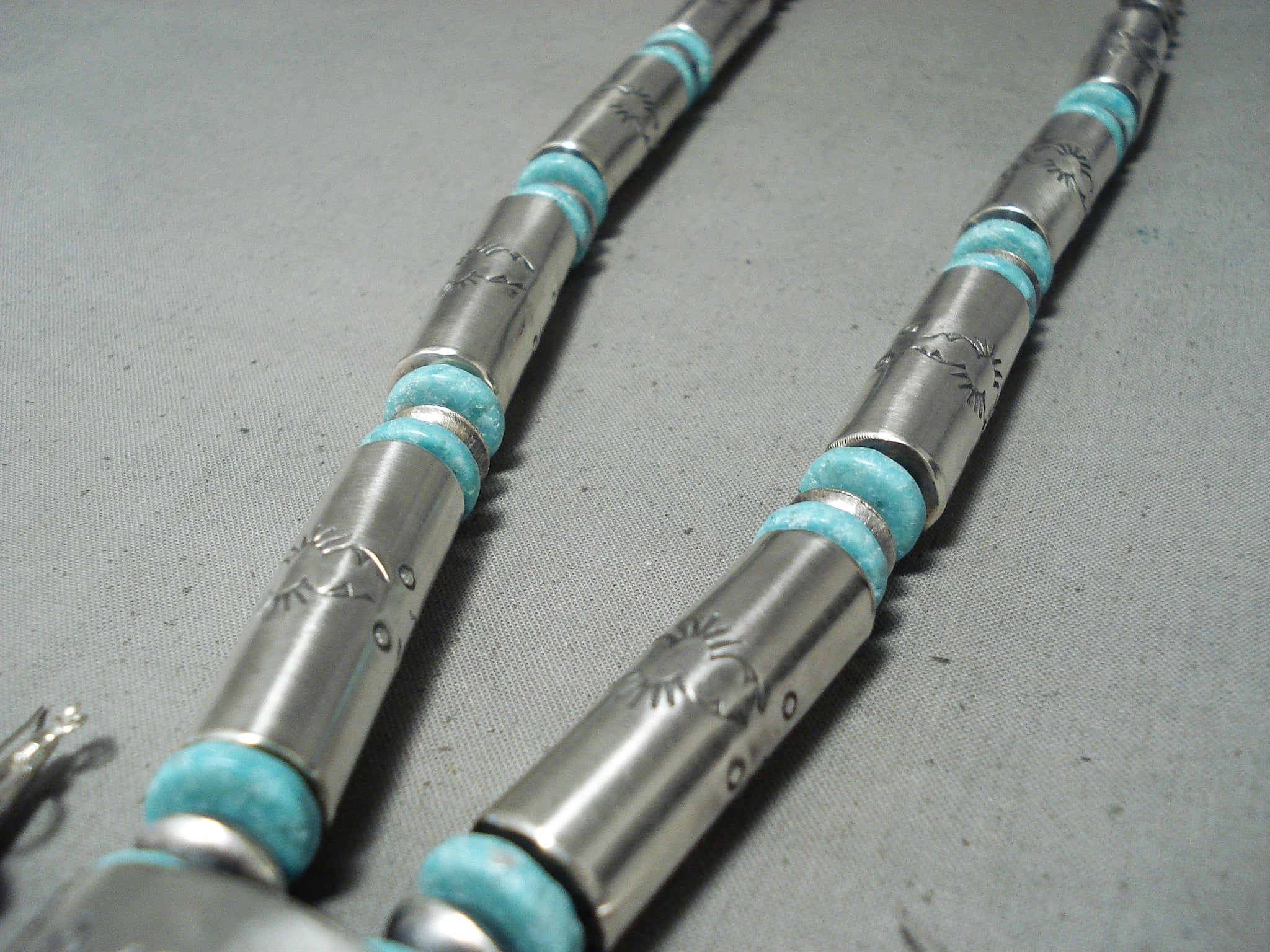 Native American Signed Very Long Tubule Sterling Silver Turquoise Necklace