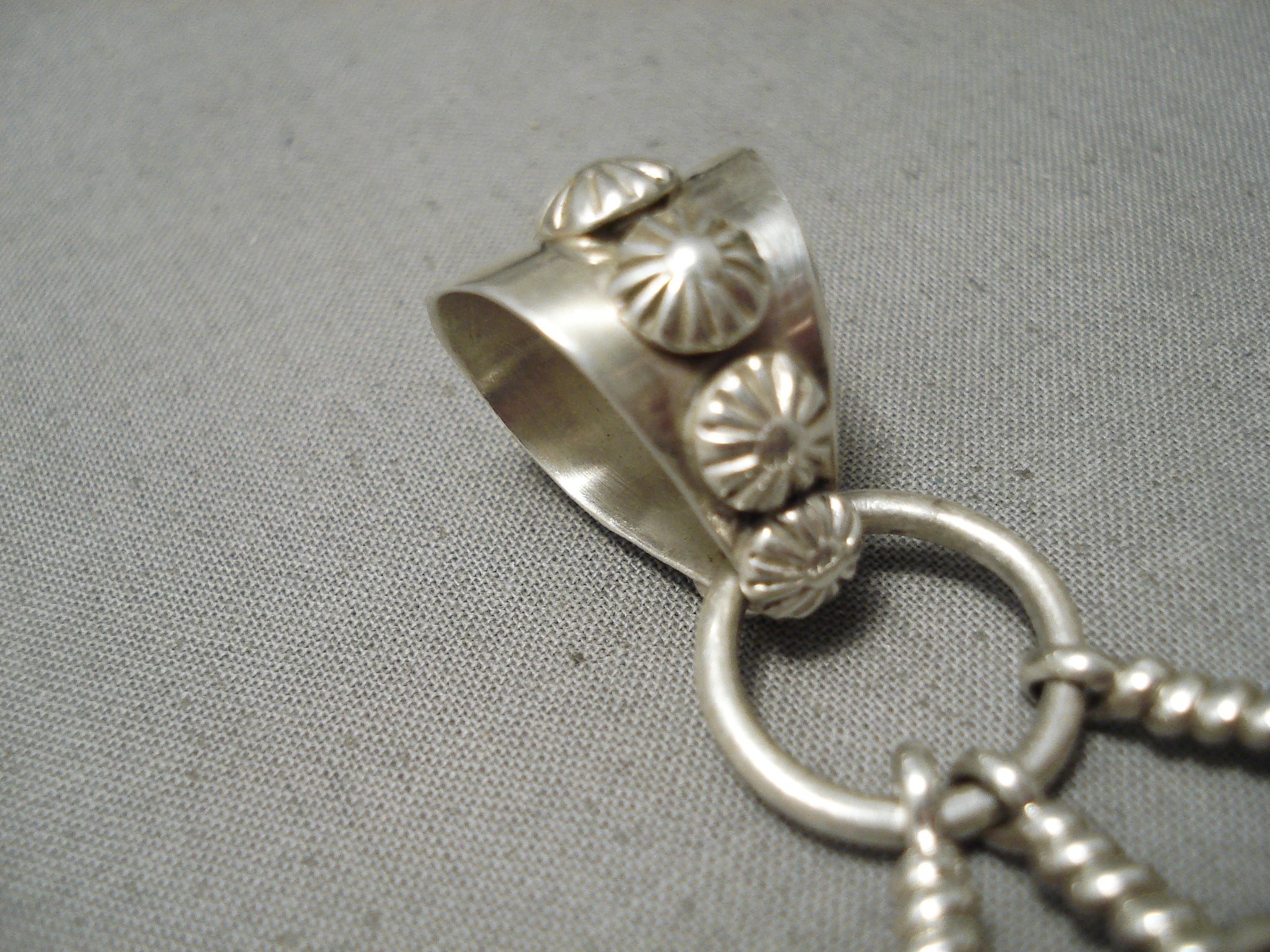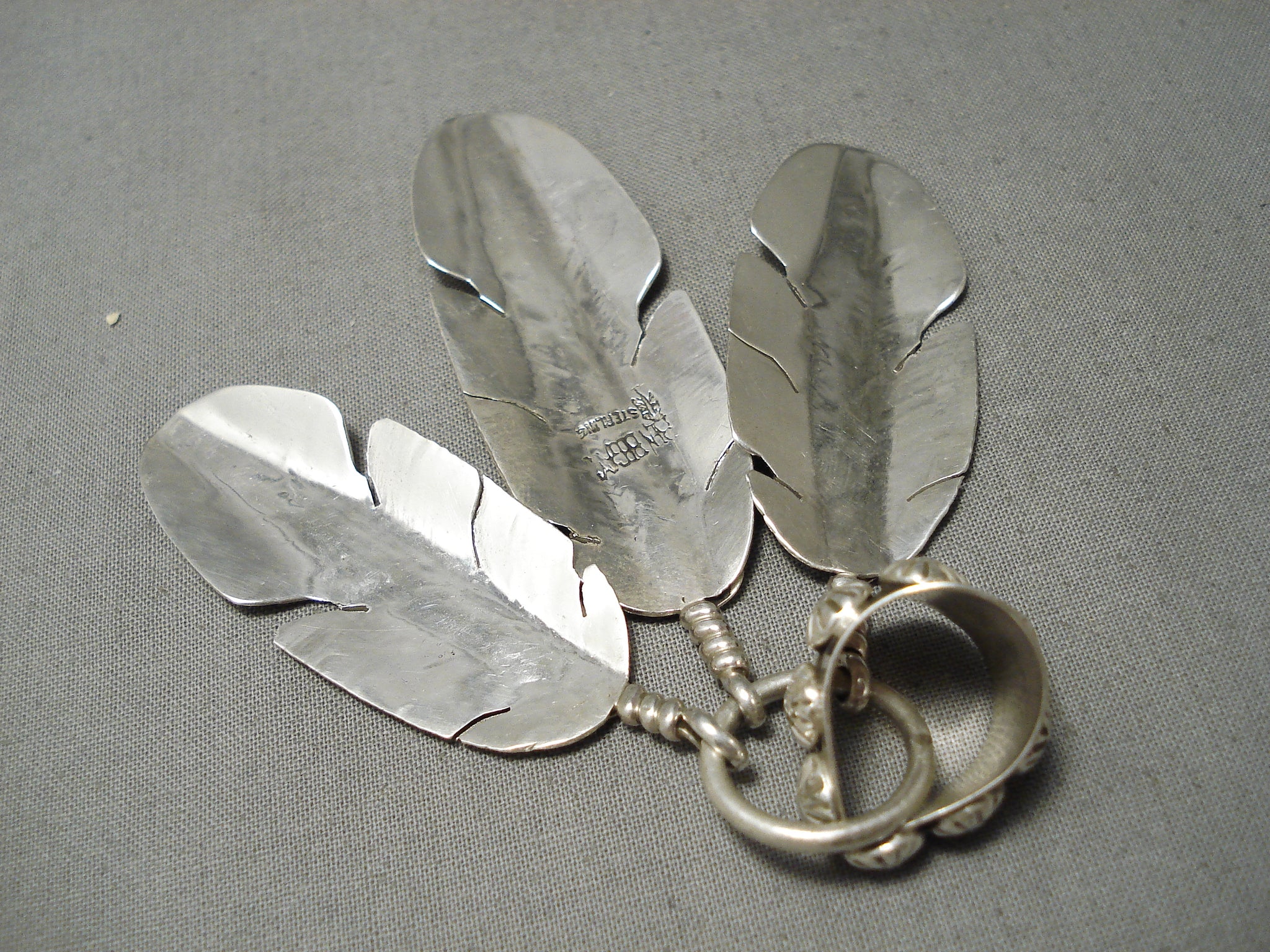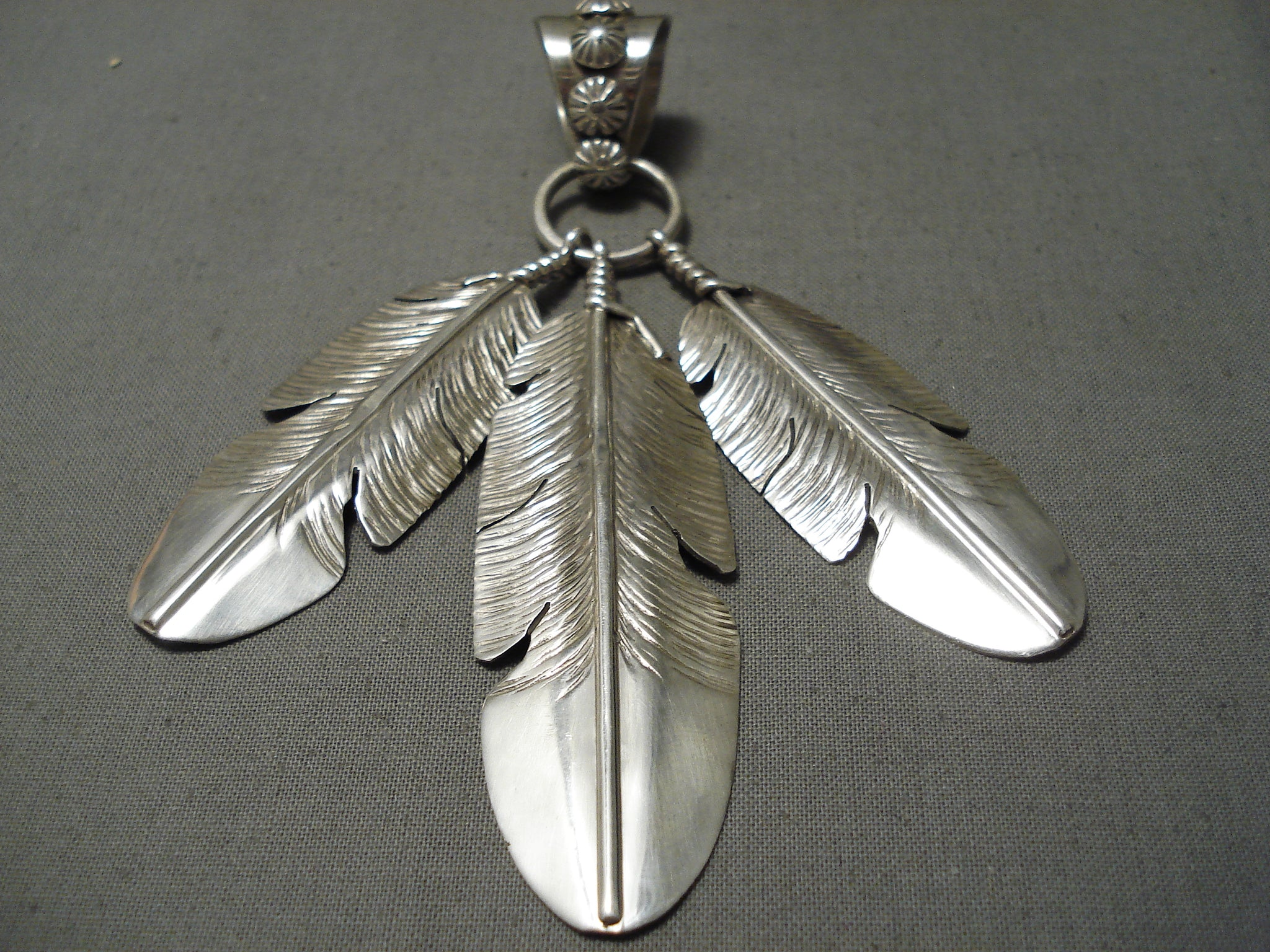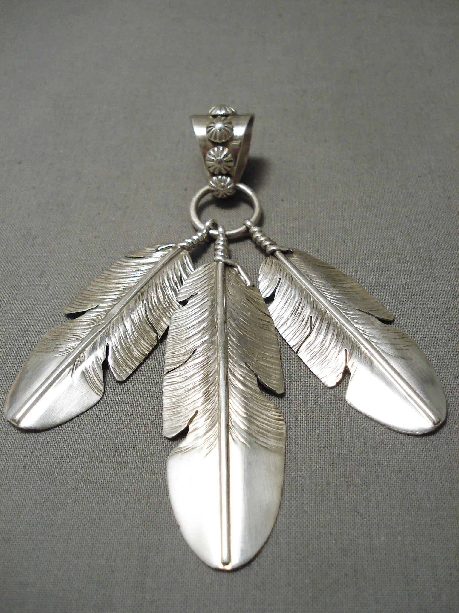 An impressive Navajo silver pendant. These triple detailed silver feathers dangle beautifully from the large ring and its fabulous bail that’s decorated with dimensional silver flowers all around. And it has a generous bail opening of ½’. Sterling silver, marked. Signed by Navajo artist, Ben Begaye. The pendant measures around 4-1/4" x 1-1/2". Sturdy 26 grams.