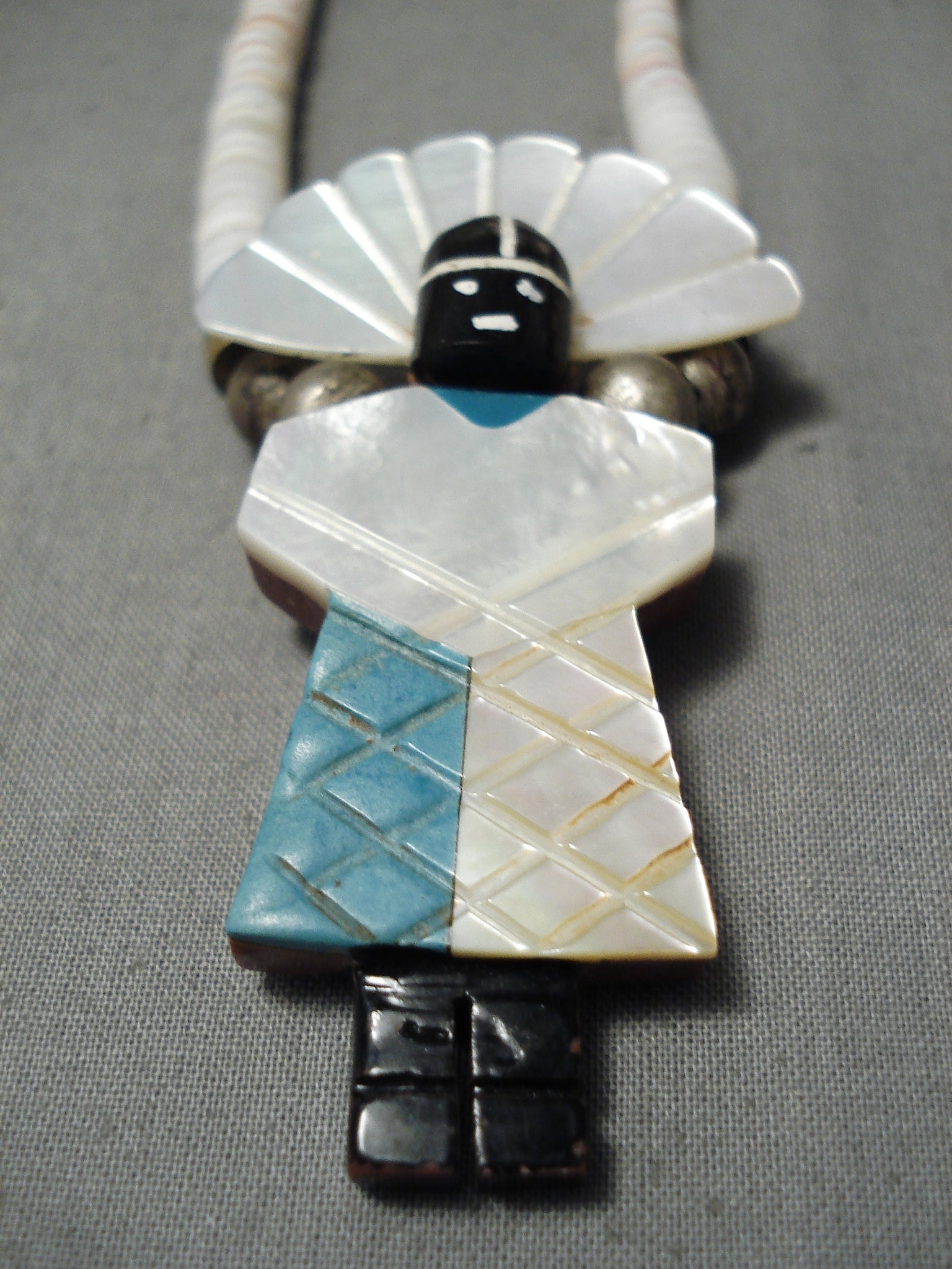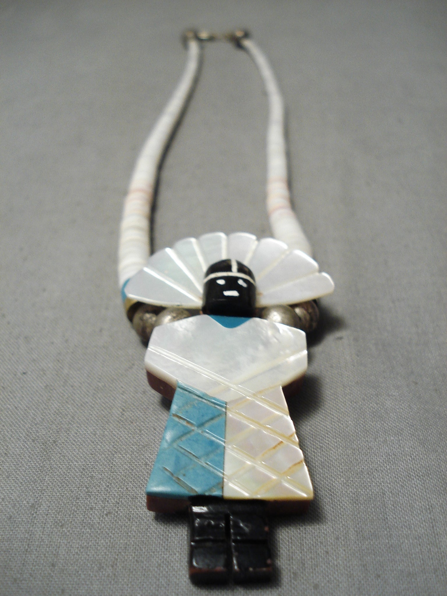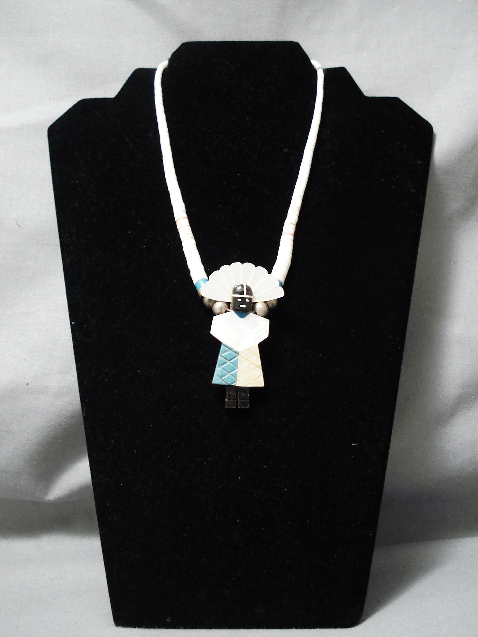 Native American Superior Vintage Santo Domingo Hand Carved Turquoise Sterling Silver Necklace