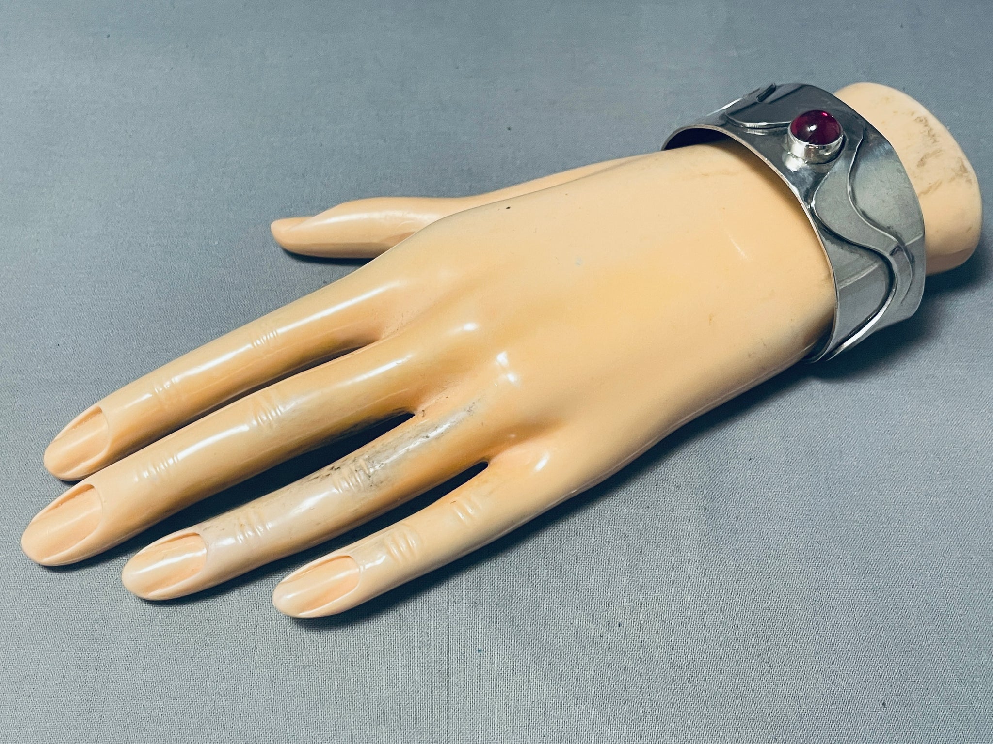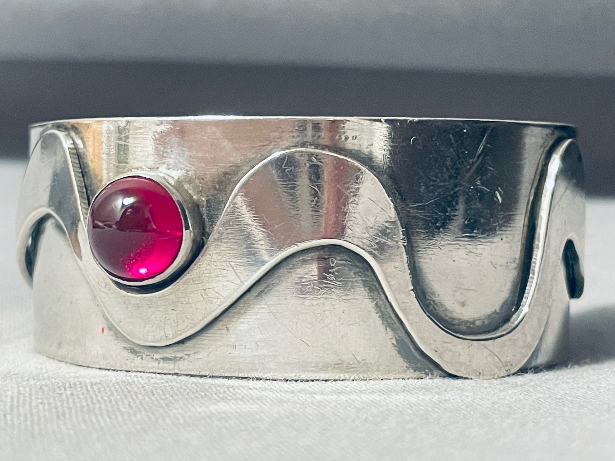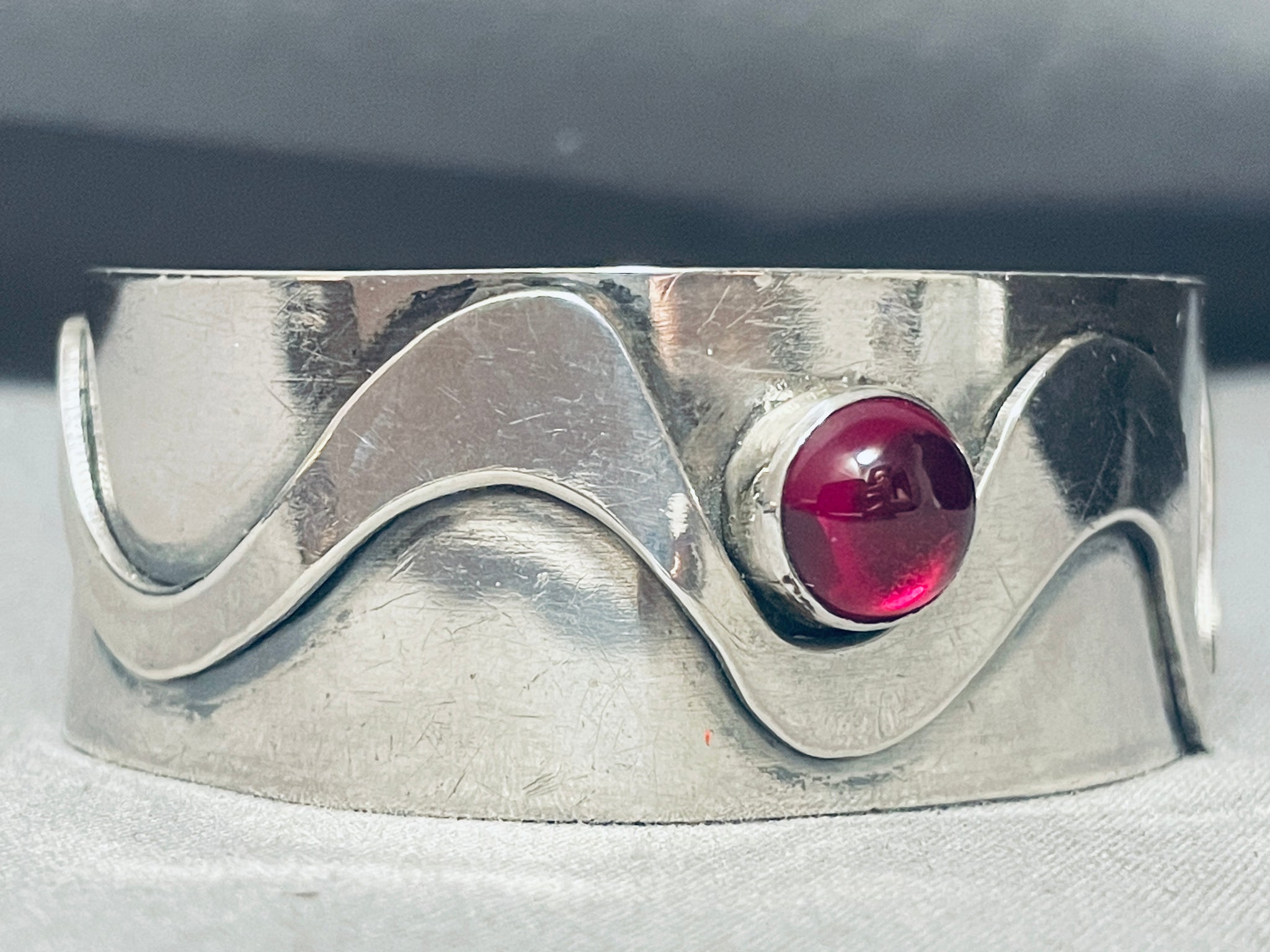 Native American Swirl Ruby Vintage Navajo Singed Sterling Silver Bracelet Jewelry