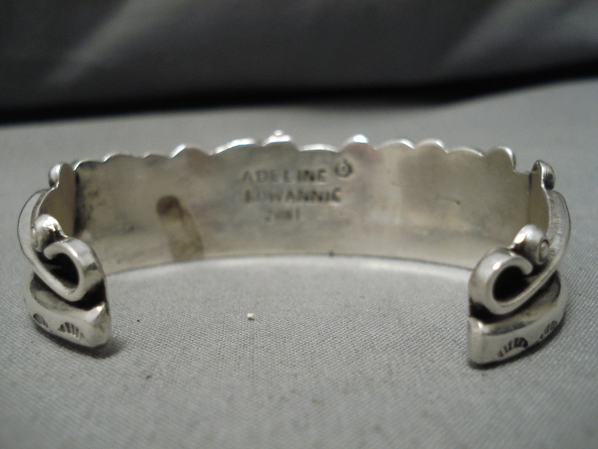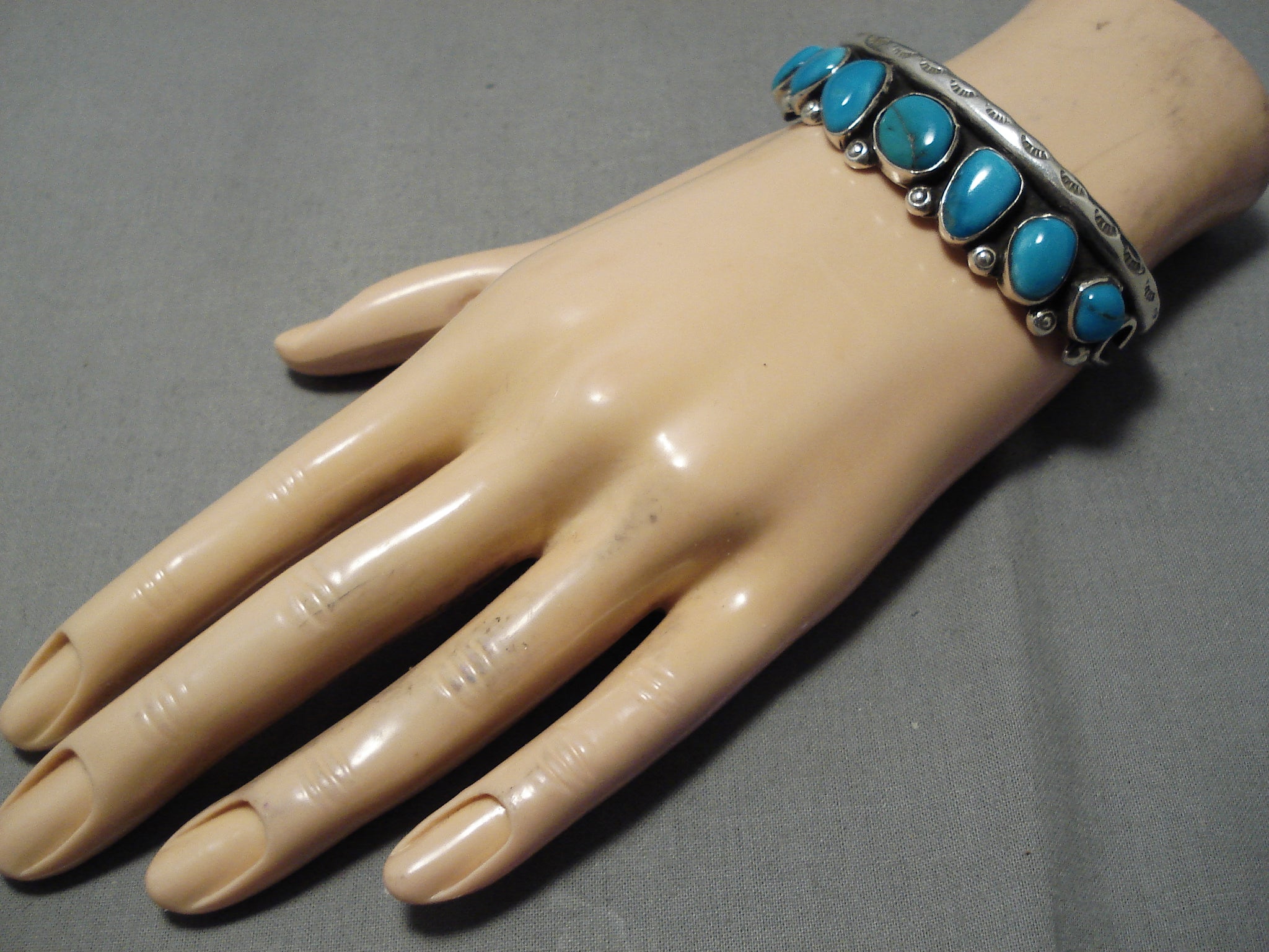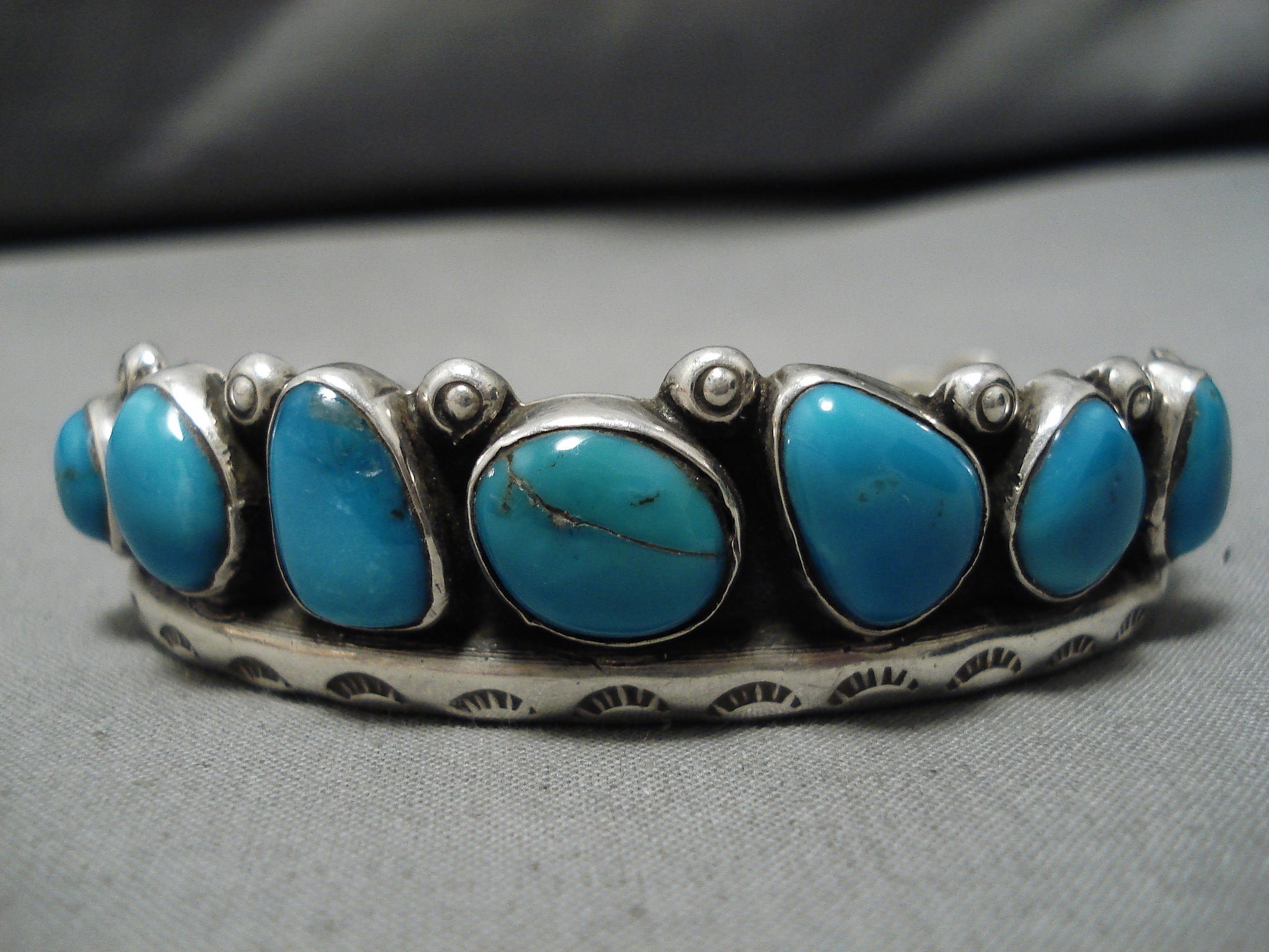 Up for sale is this magnificent vintage Zuni silver bracelet. One more electrifying than the next, these 7 Blue Gem turquoise stones have a single silver bead separating them to make one border of the bracelet, as the other border is a handstamped silver rail. Then neatly completing the look, we have a large silver swirl placed at each terminal. The center stone measures around 1/2" x 3/8". The width of the bracelet measures around 3/4". Signed by Zuni artist, Adeline Bowannie. Sterling silver. The inside end to end measures around 5-5/8" with an additional 1-3/8" gap. Sturdy 38 grams.