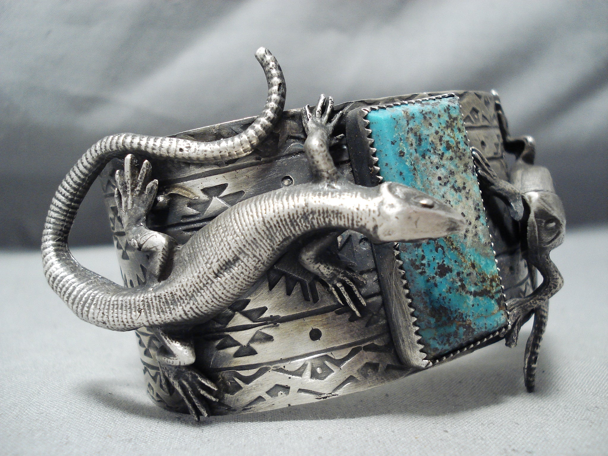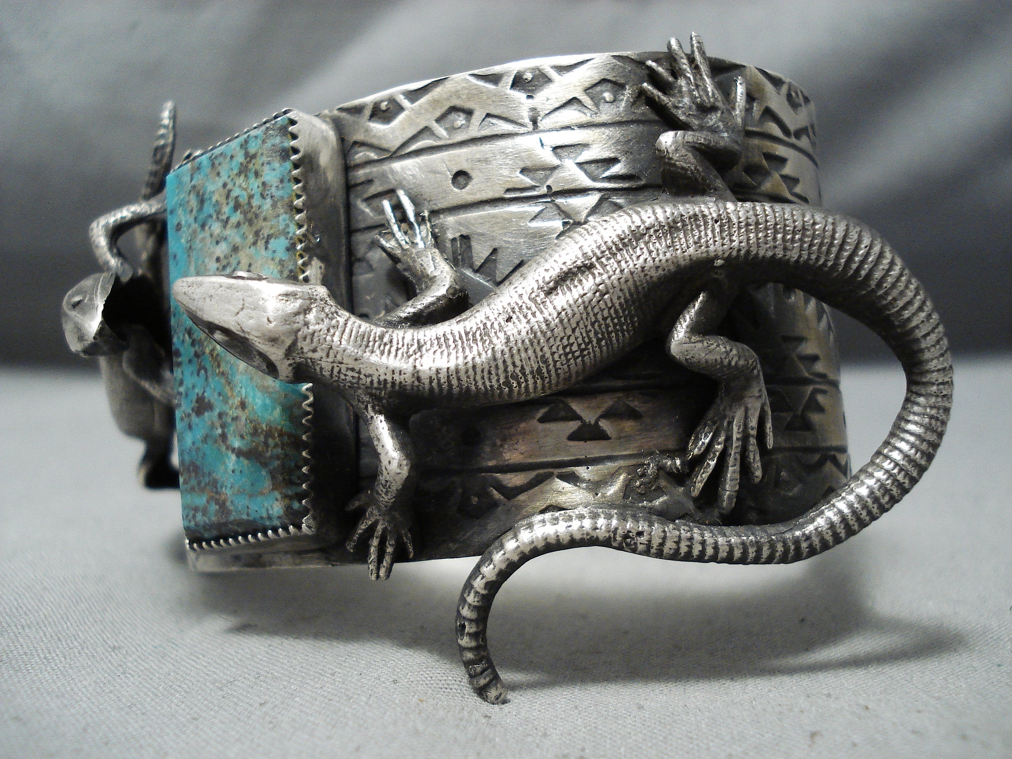 Noteworthy Double Gecko Turquoise Sterling Silver Cuff Bracelet