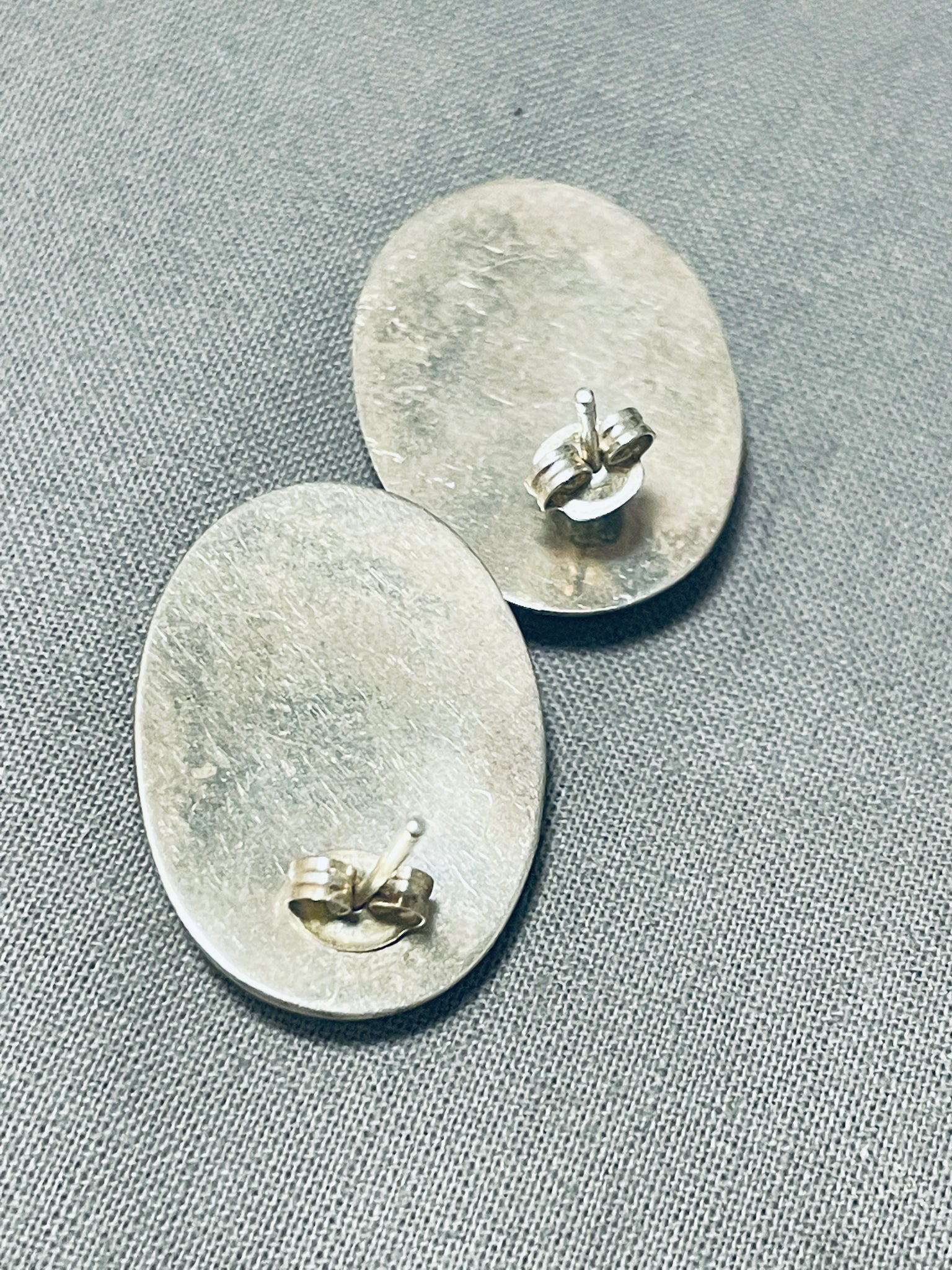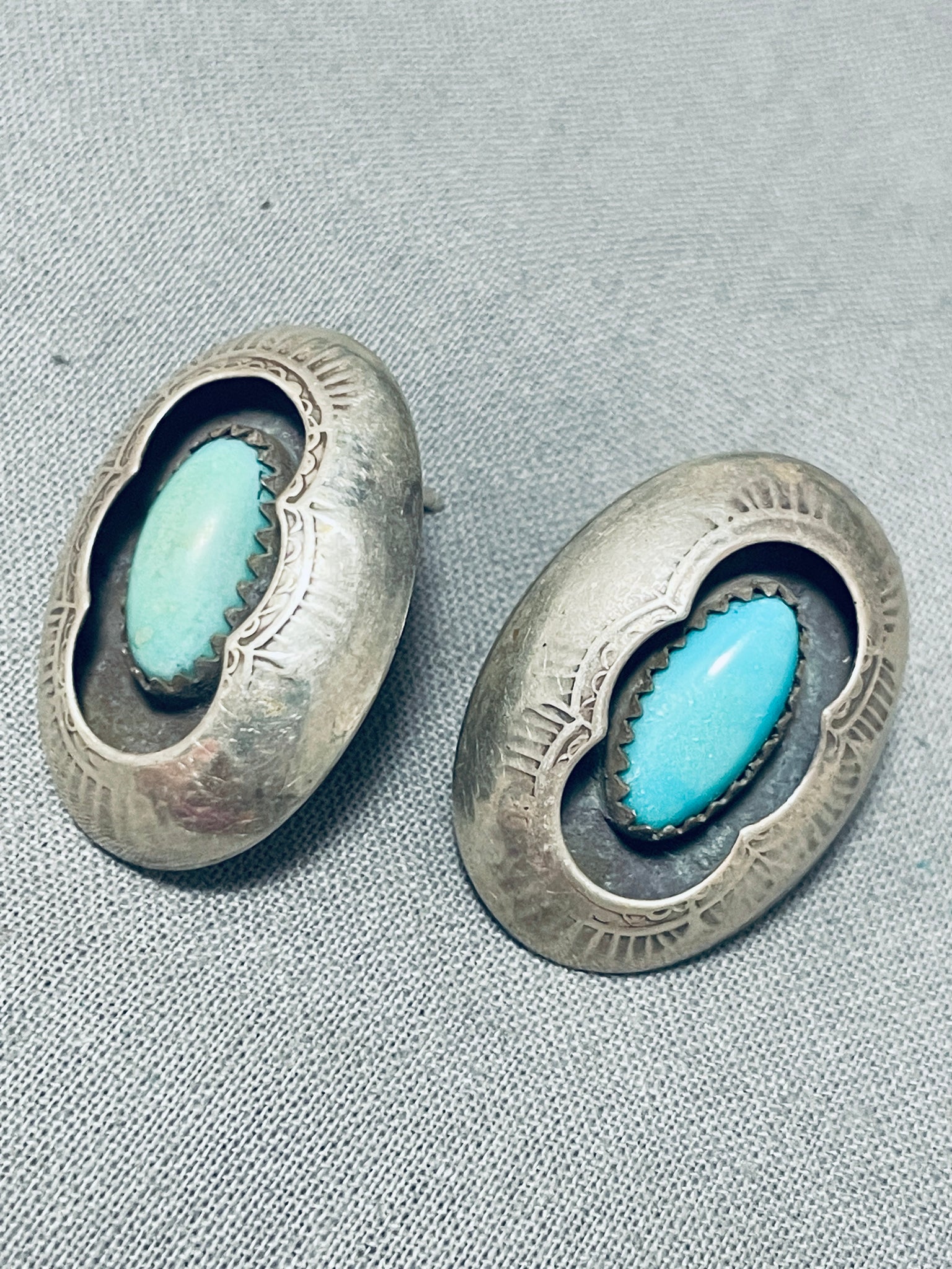 Old Beautiful Vintage Native American Navajo Hand Tooled Sterling Silver Turquoise Earrings