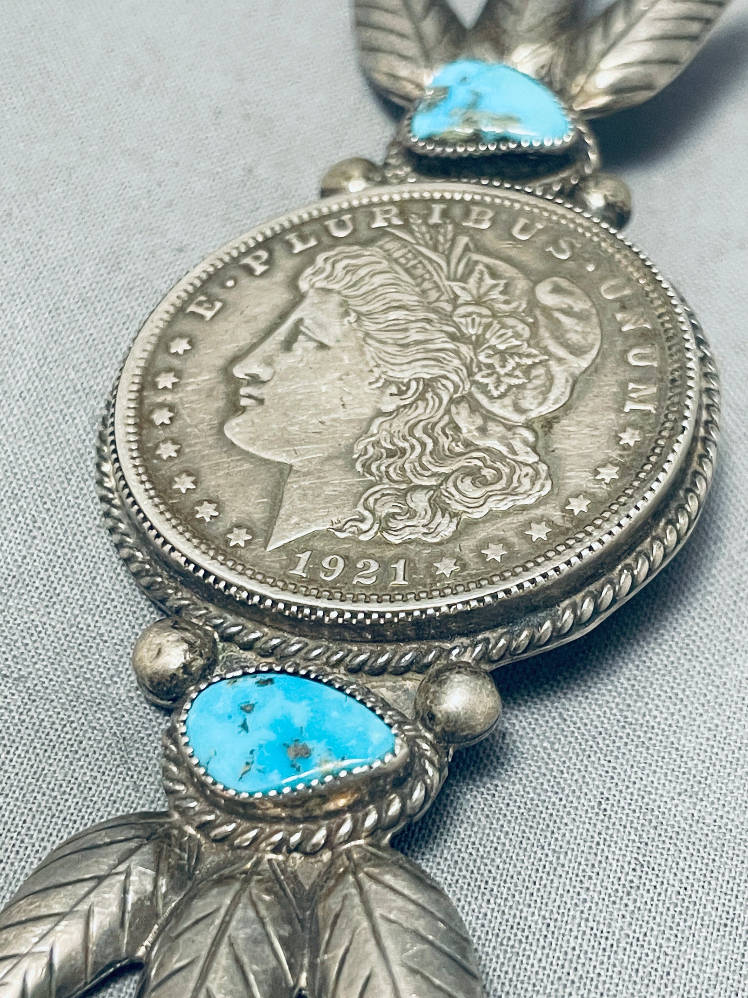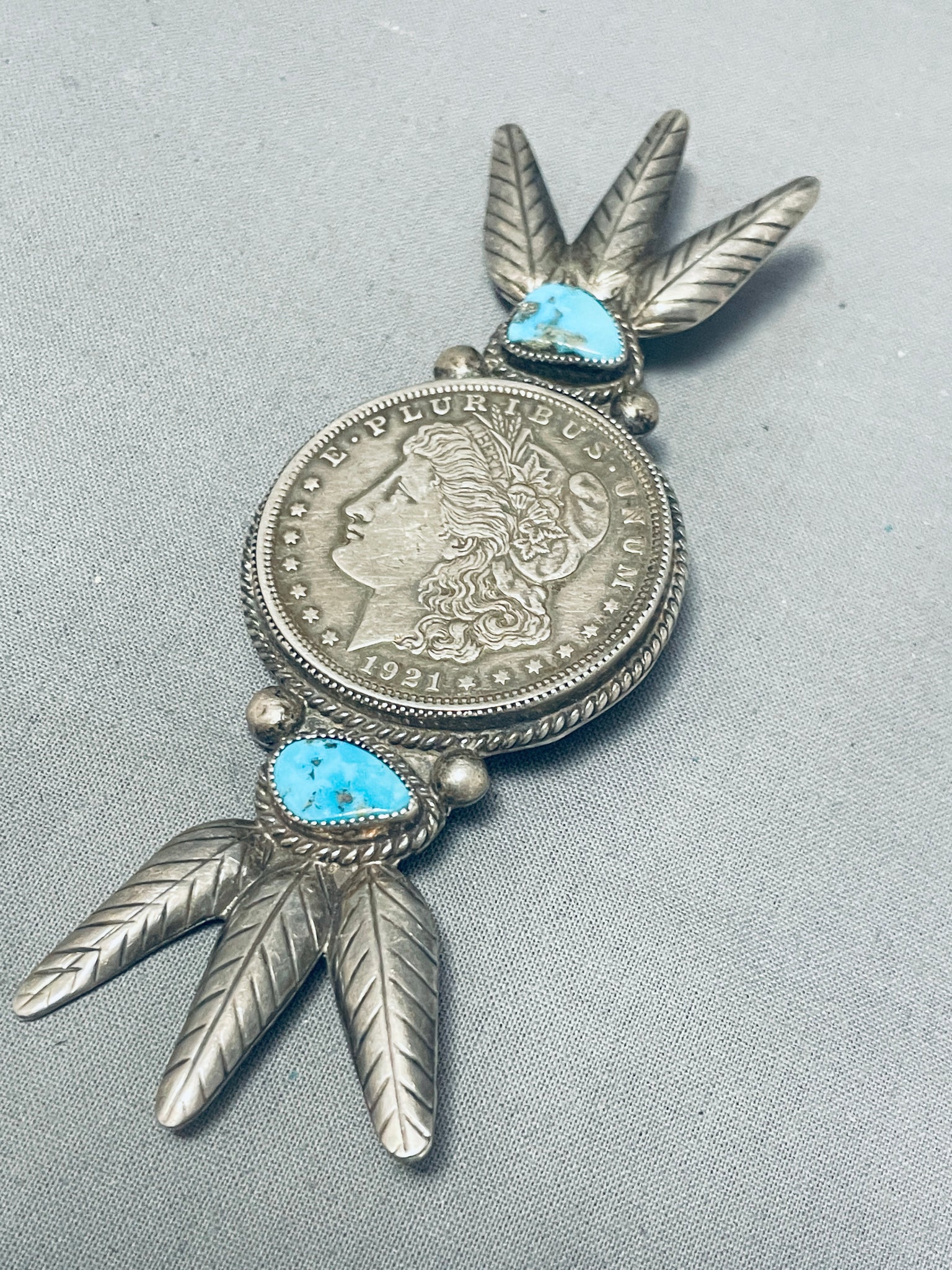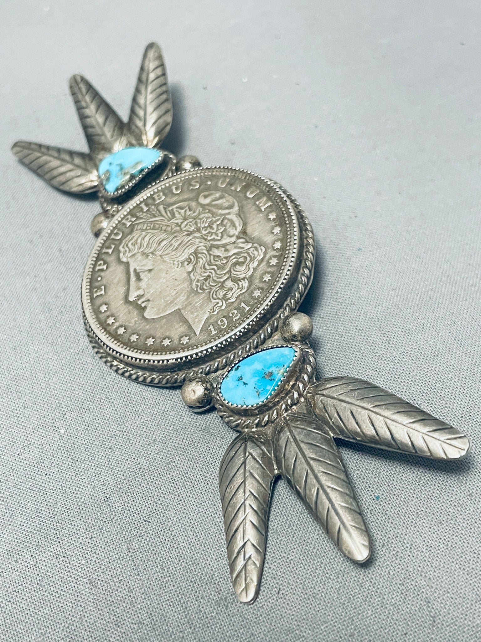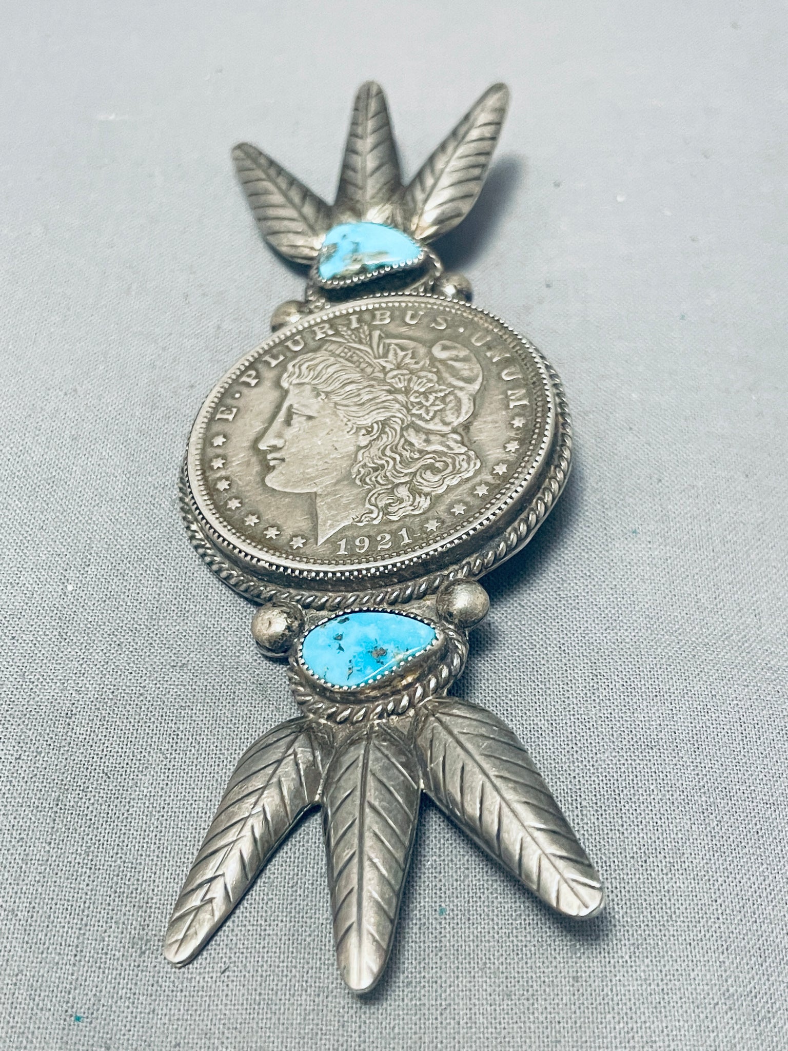 One Of A Kind Vintage Native American Navajo Old Kingman Turquoise Sterling Silver Dollar Pin