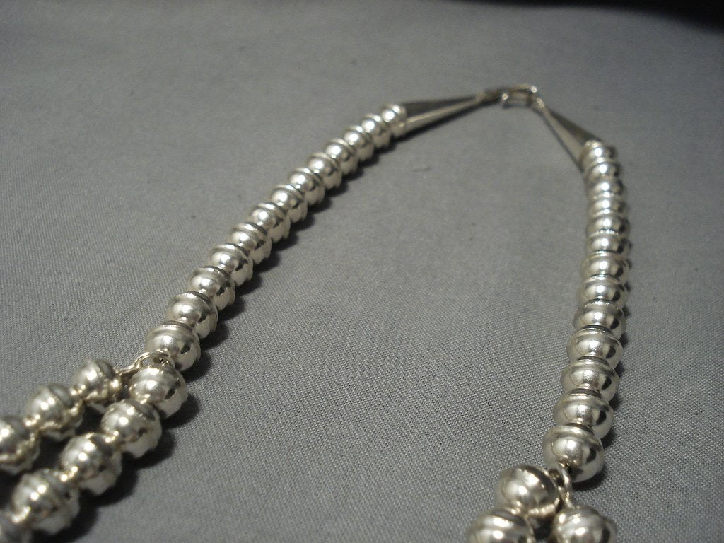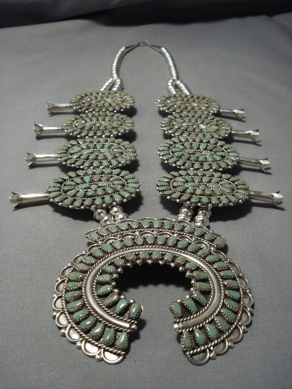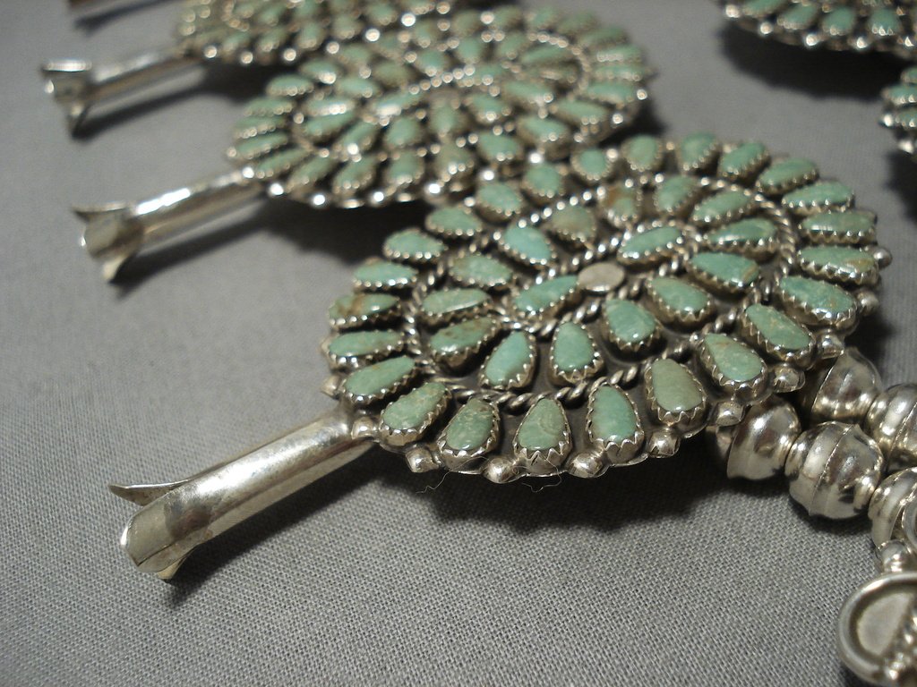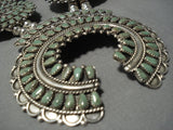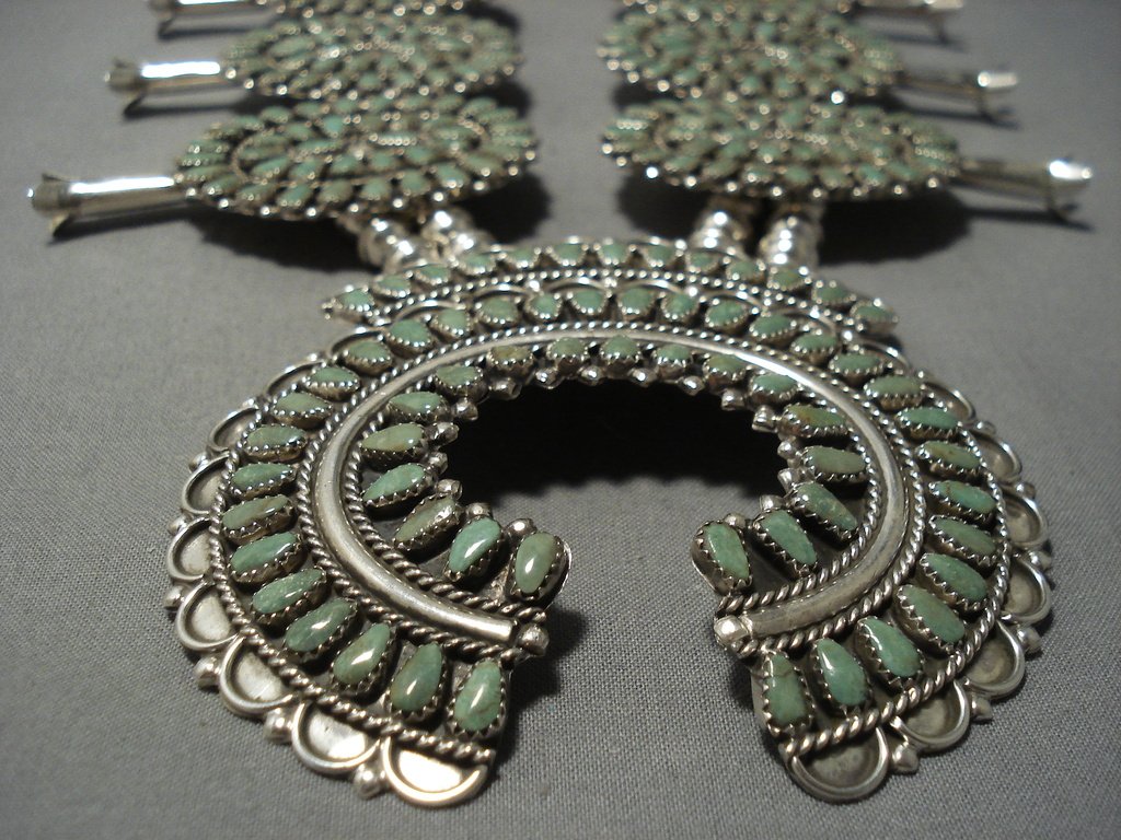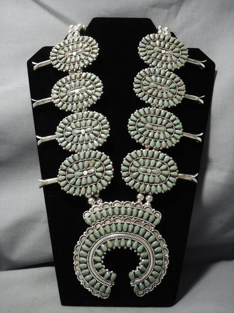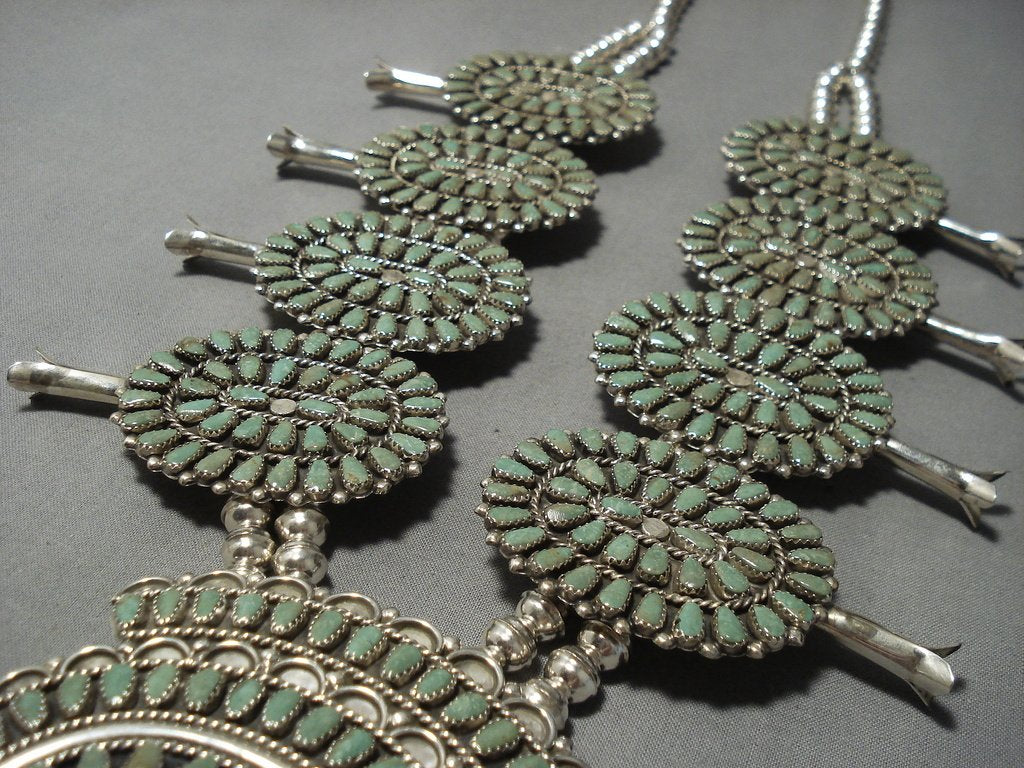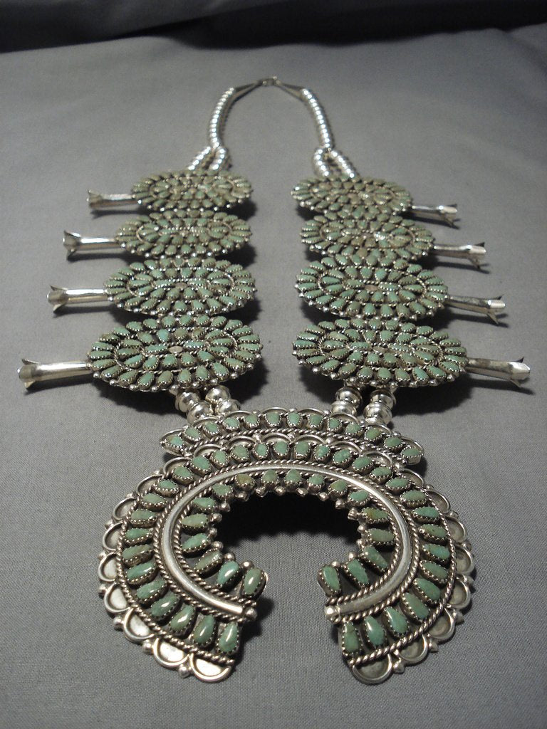 One Of Biggest Native American Jewelry Navajo Green Turquoise Sterling Silver Squash Blossom Necklace