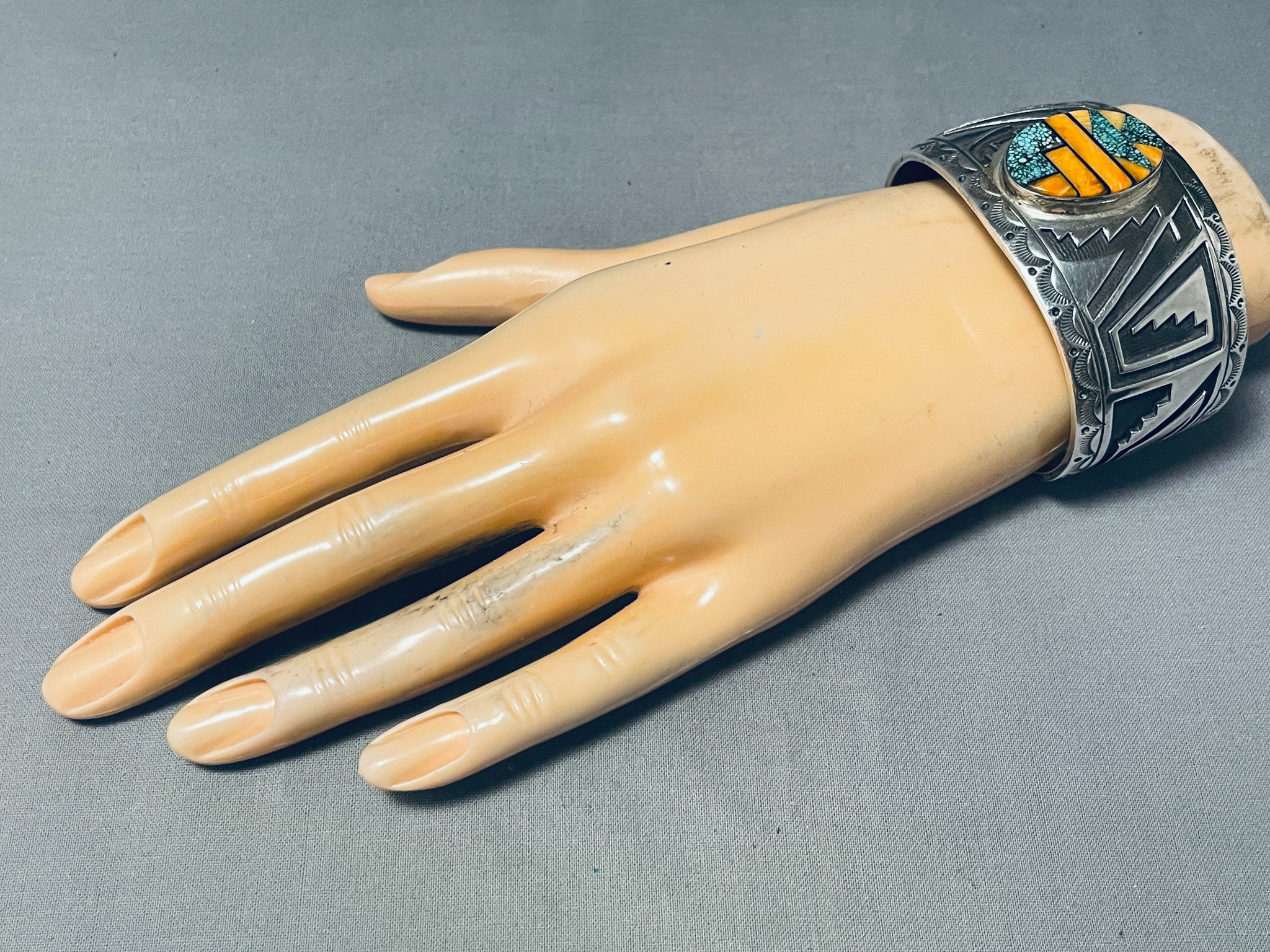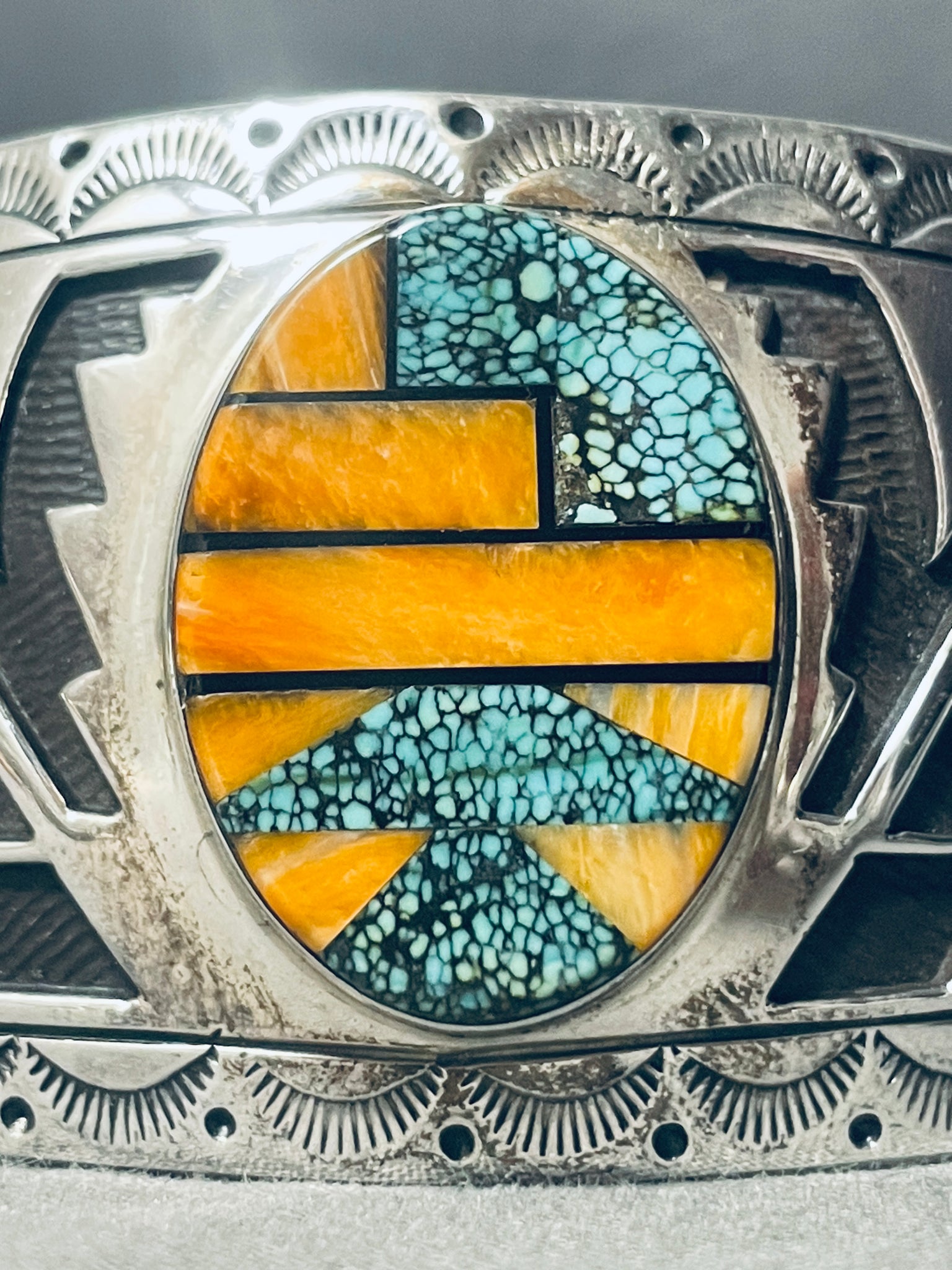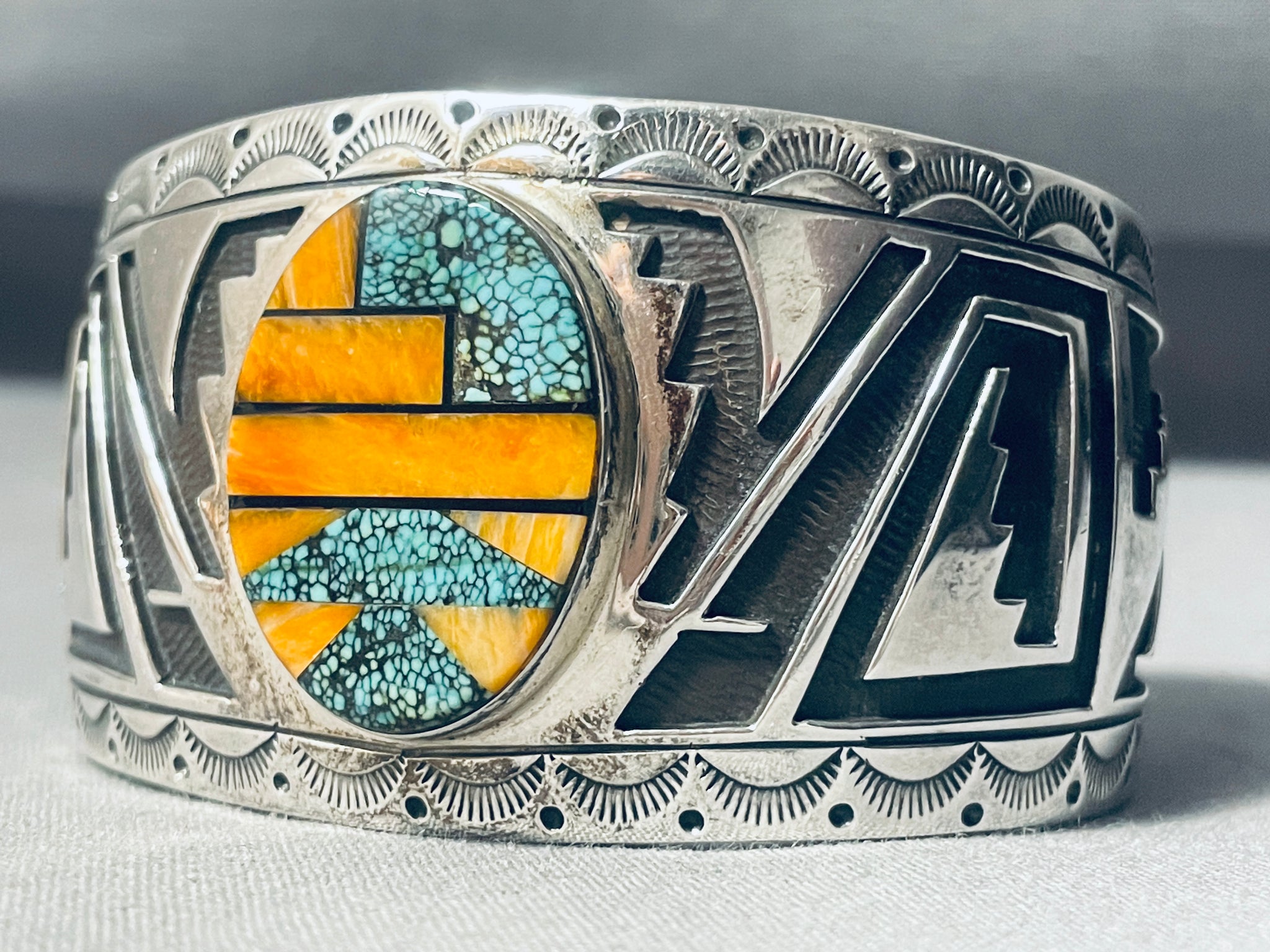 One Of The Best Modernistic Native American Navajo Turquoise Inlay Sterling Silver Bracelet
