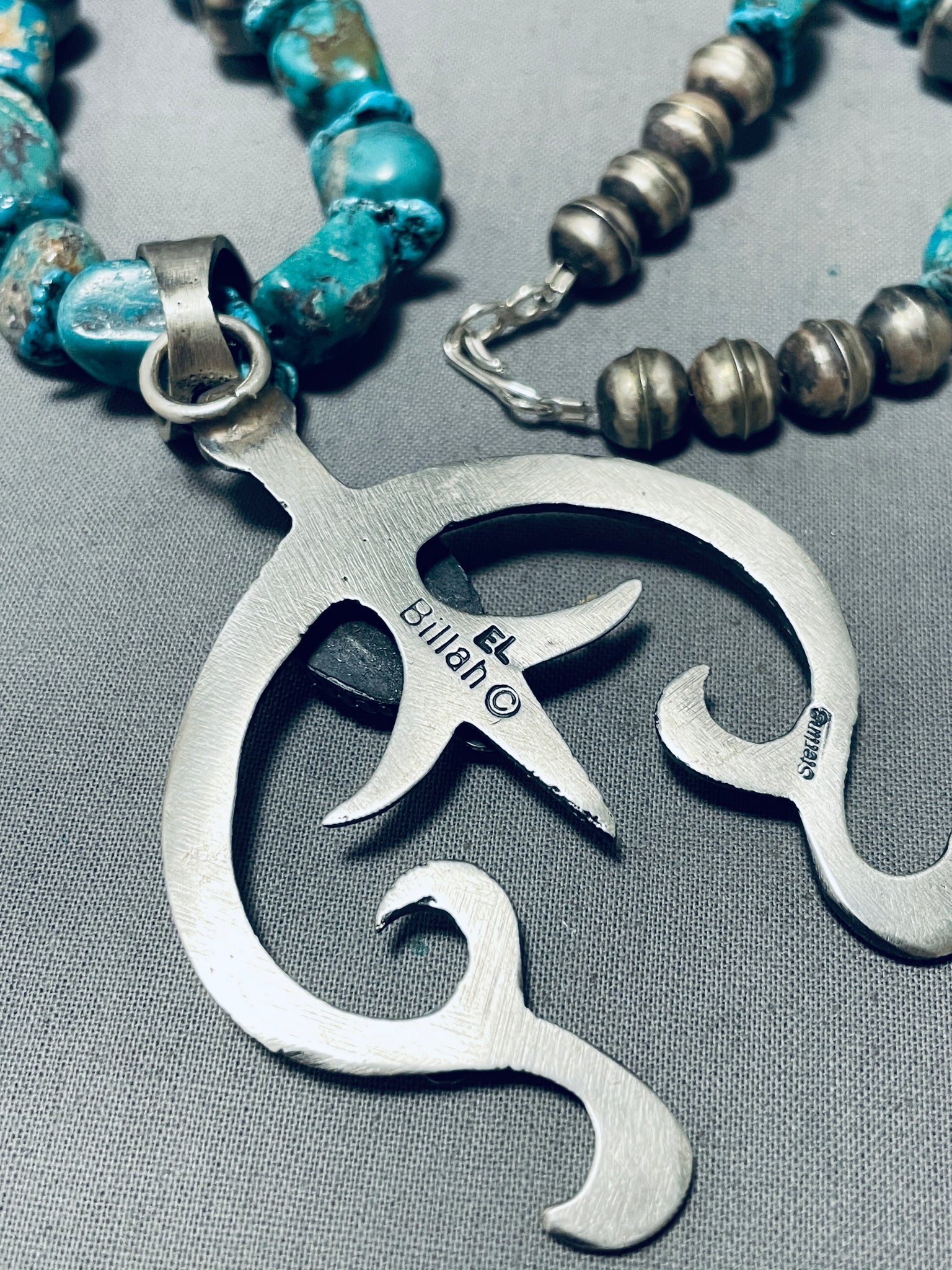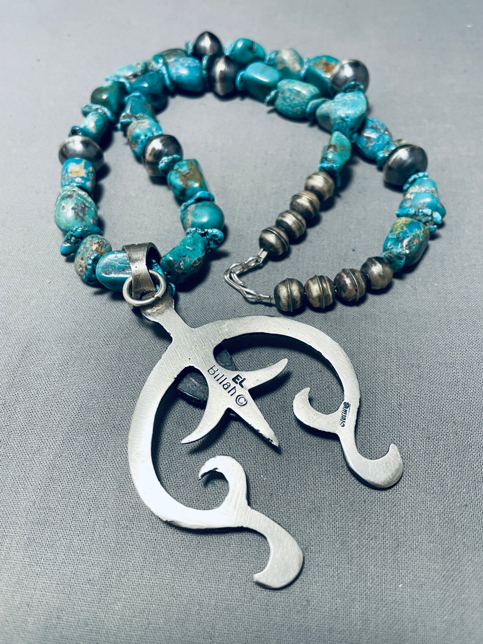 The Kingman Turquoise Mine, nestled amidst the arid landscapes of northwestern Arizona, stands as one of the oldest and most prolific turquoise mines in the United States. With a history dating back over a millennium, the mine has been a wellspring of this coveted gemstone for countless generations. What sets Kingman turquoise apart is its stunning range of blues, from sky-like ceruleans to deeper, more intense hues, often accented by intricate black or golden matrix patterns. This remarkable gem has been revered by Native American artisans for its workability and beauty, and it has found its way into countless masterpieces of Southwestern jewelry and art. Today, the Kingman Turquoise Mine continues to produce some of the most prized specimens in the world, its legacy intertwined with the rich cultural tapestry of the American Southwest. The mine's enduring significance is a testament to the enduring allure and craftsmanship inspired by this extraordinary gemstone. Sterling silver, marked. Signed by Navajo artist, E.L. Billah. The length of the necklace measures around 27". Sturdy 98 grams.