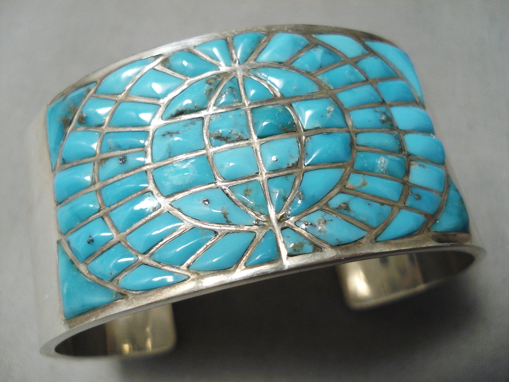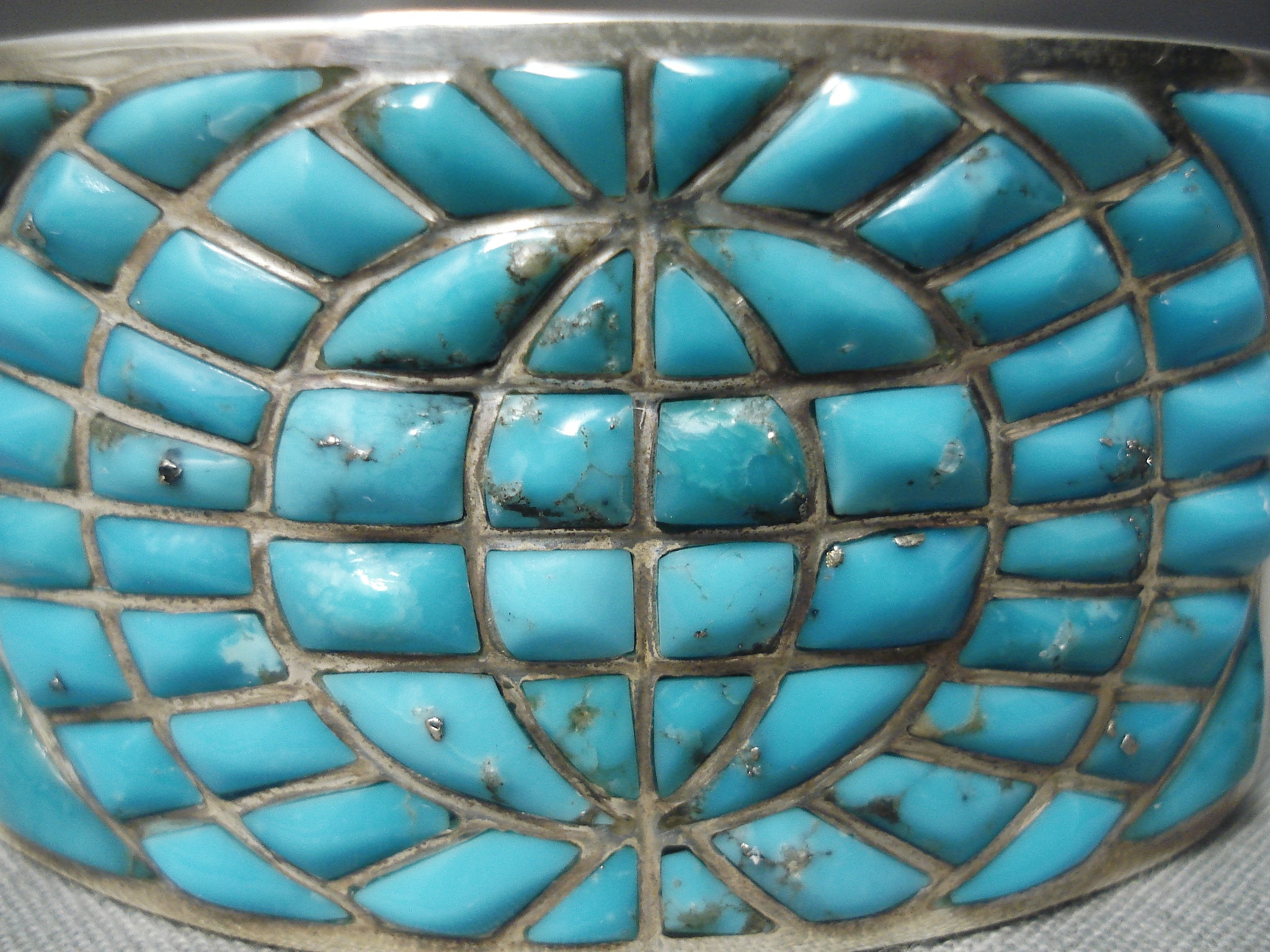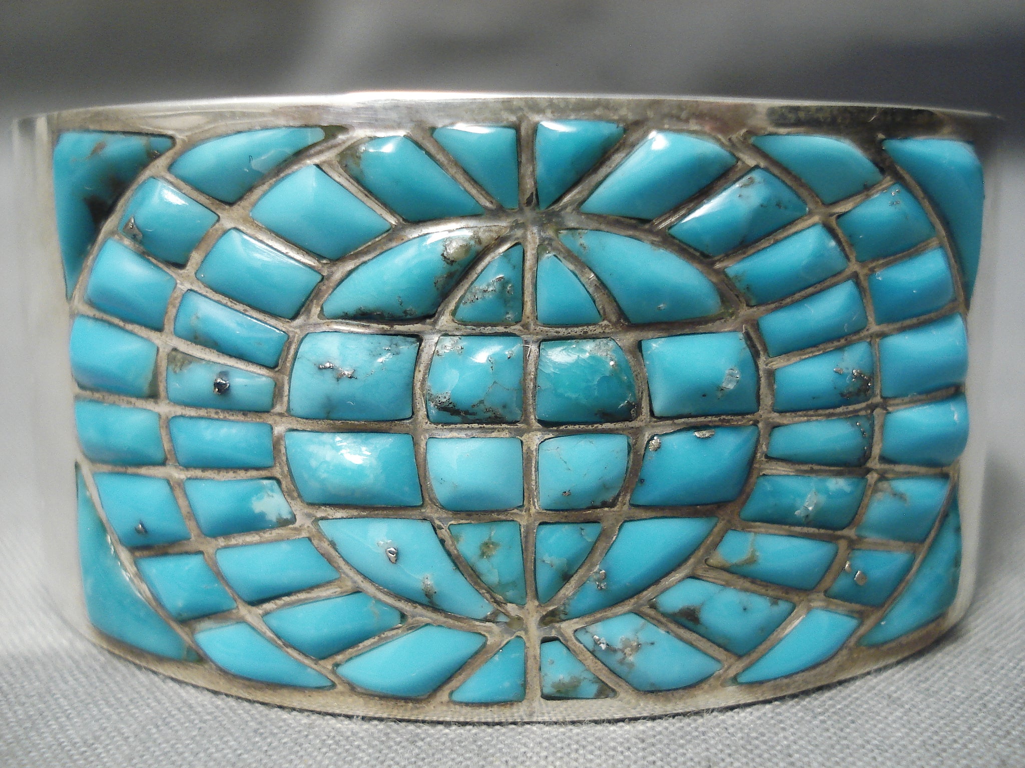 This is a magnificent vintage Zuni/ Navajo inlaid silver bracelet being one of the finest Zuni/ Navajo inlaid bracelets we have collected this year. Look how the artist beautiuflly inlaid the turquoise stones into that thick and wide silver cuff, just phenomenal. The turquoise appears to be from the wonderful old natural Blue Diamond turquoise mine. The width of the bracelet measures around 1-1/8". Sterling silver, marked. Cir. Mid century . The inside end to end measures around 5-1/4" with an additional 1-1/4" gap. Sturdy 78 grams.