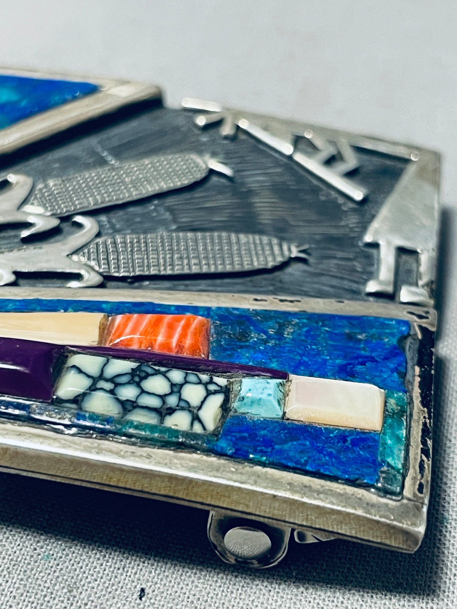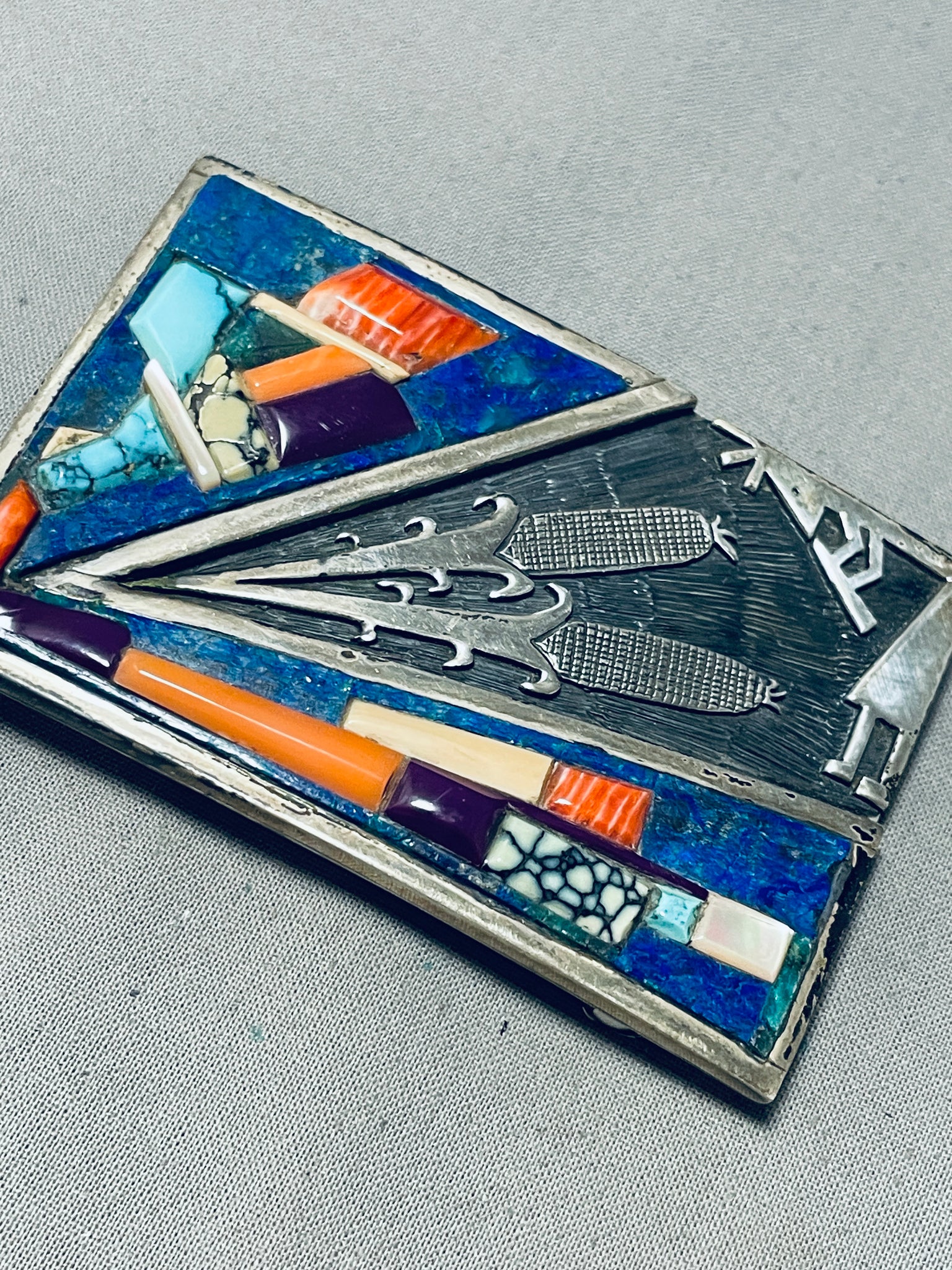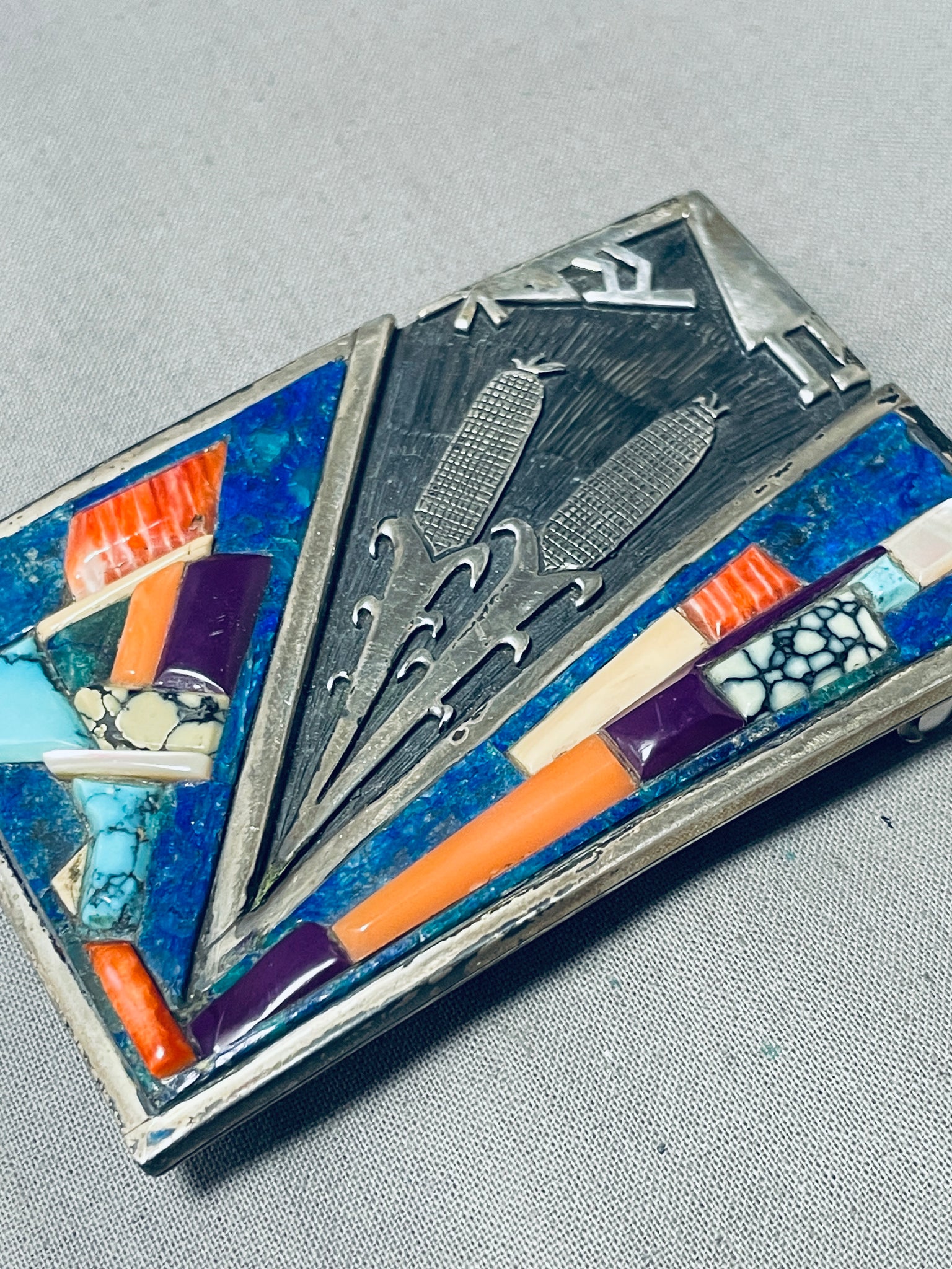 This is an impressive vintage Navajo inlaid thick and sturdy silver buckle. This wonderful buckle consists of inlaid stones and shells that include spiderweb turquoise, sugulite, spiny osyter shell, lapis, mother of pearl and pink coral. Located in one corner of the buckle are beautiful silver carvings that consist of hand carved corn plants, kokopelli and a textured chisel background. The buckle measures around 3" X 2" and can fit a belt width of about 1-1/2" or less. Sterling silver, marked. Signed by Navajo artist, V. Cir. 1970's+. Sturdy 75 grams.