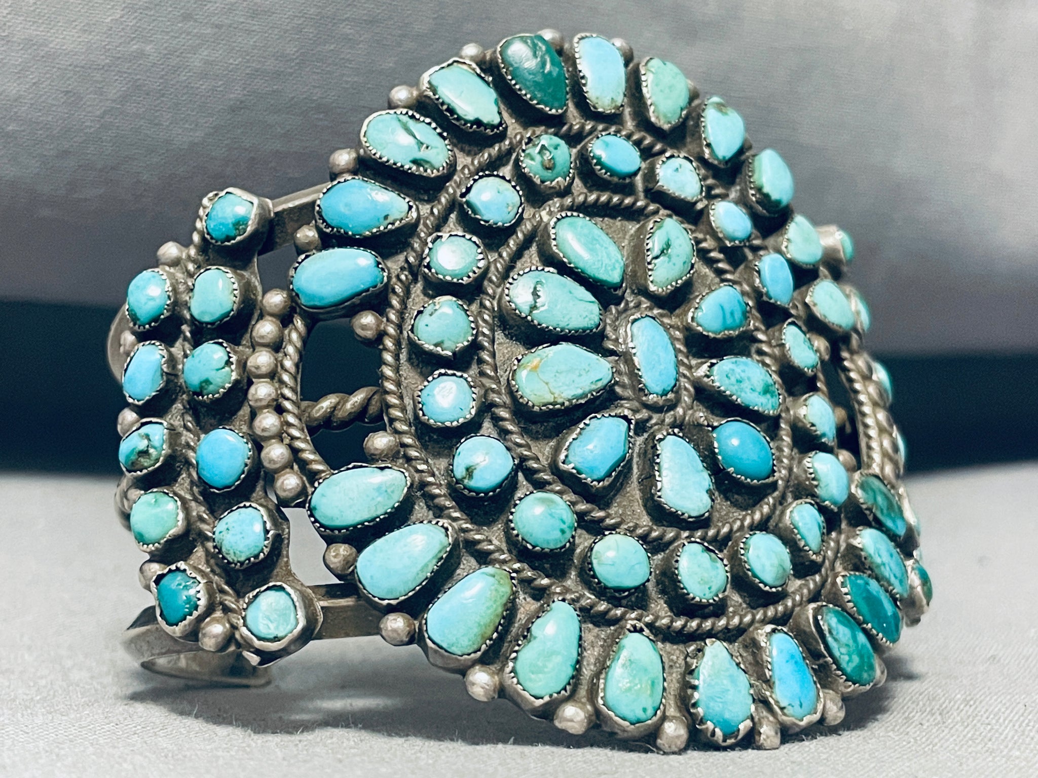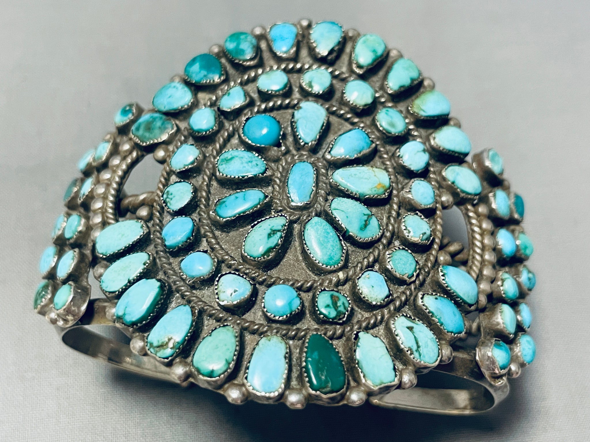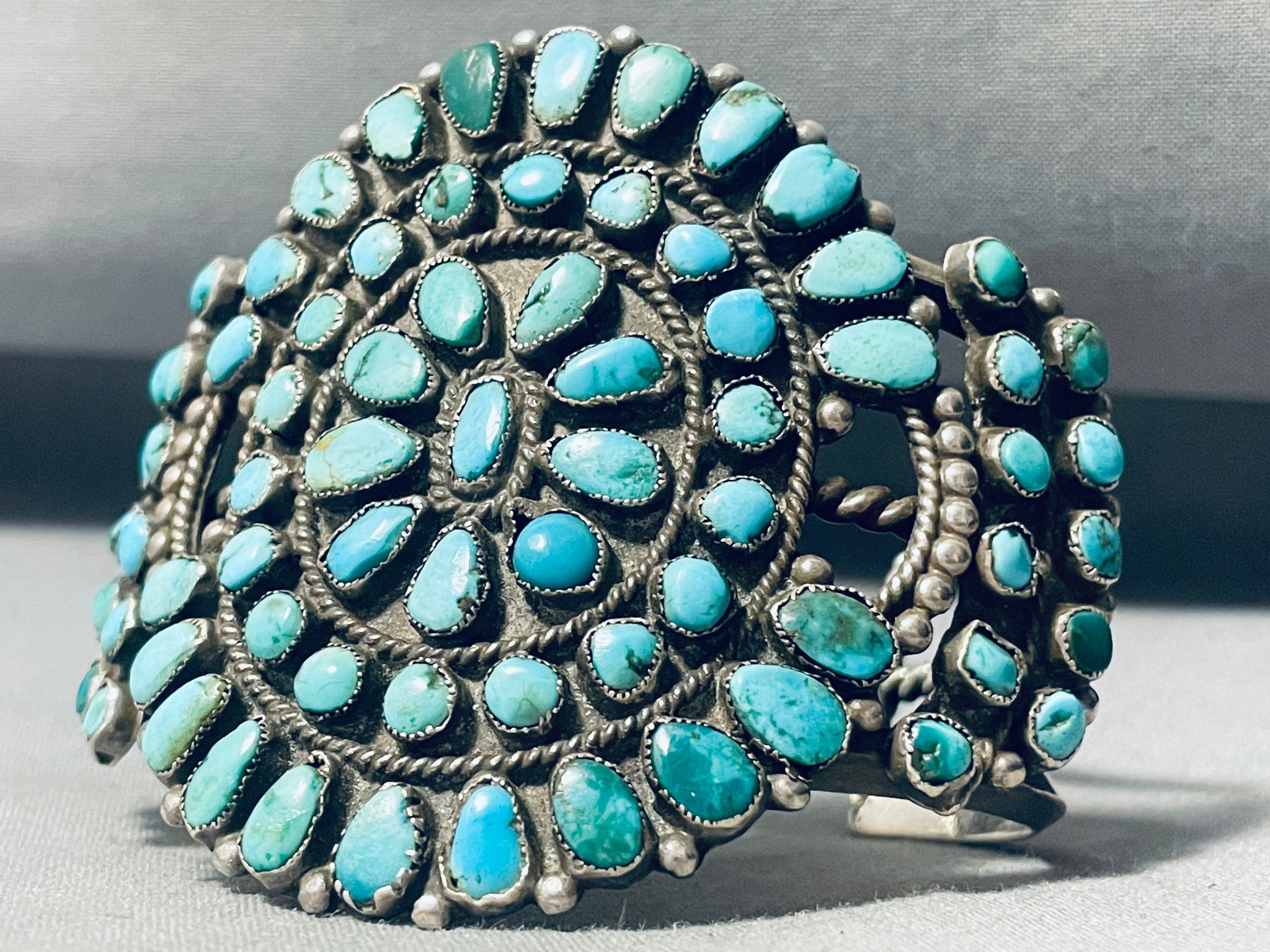 This is an astonishing vintage Navajo turquoise cluster silver bracelet. This outstanding bracelet contains a mind blowing snake eye, teardrop and oval shaped turquoise stones. The turquoise stones appear to be from the impeccable Royston and Cerrillos turquoise mines, both of which being very rare mines. The Royston Turquoise Mine is a famous turquoise mine located in Nevada, USA. It is known for producing high-quality turquoise with a distinctive color and matrix pattern. The mine has been in operation since the early 1900s and has produced some of the most valuable and sought-after turquoise in the world. The Royston Turquoise Mine is actually a collection of mines located in the Royston Hills in central Nevada. The area has been mined for turquoise by both Native Americans and non-Native Americans for centuries. The turquoise from the Royston mine is known for its unique color and matrix pattern. The turquoise can range in color from a bright blue-green to a dark green, with a brown or golden matrix running throughout the stone. The matrix is what gives Royston turquoise its distinctive look, and each stone is unique. The Cerrillos Turquoise Mine is a historic turquoise mine located in the Cerrillos Hills near Santa Fe, New Mexico, United States. It is one of the oldest and largest turquoise mines in North America, and has been a source of turquoise for over a thousand years. The turquoise from the Cerrillos Mine is known for its unique green and blue colors, as well as its distinctive matrix patterns. It was highly valued by indigenous peoples of the region, who used it for jewelry, pottery, and other decorative items. In the late 1800s, the mine became a commercial operation, and was worked by a number of different mining companies over the years. Located throughout the amazing cluster of stones are wonderful silver works that consist of raindrops and ropes. This is an absolutely beautiful turquoise silver cluster bracelet with a sturdy and thick triple silver shank cuff. The center shank is a wonderful silver rope. The width at the center of the bracelet measures around 2-1/2" while the width at the center of the triple silver shank cuff measures around 1-3/4". The stones measure around 1/4" x 3/16". Sterling silver. Cir. Mid century . The inside end to end measures around 5-1/2" with an additional 1-1/4" gap. Sturdy 66 grams.