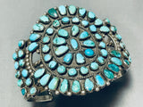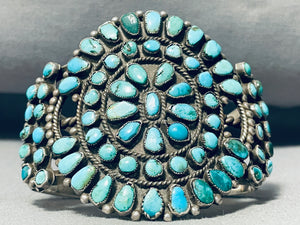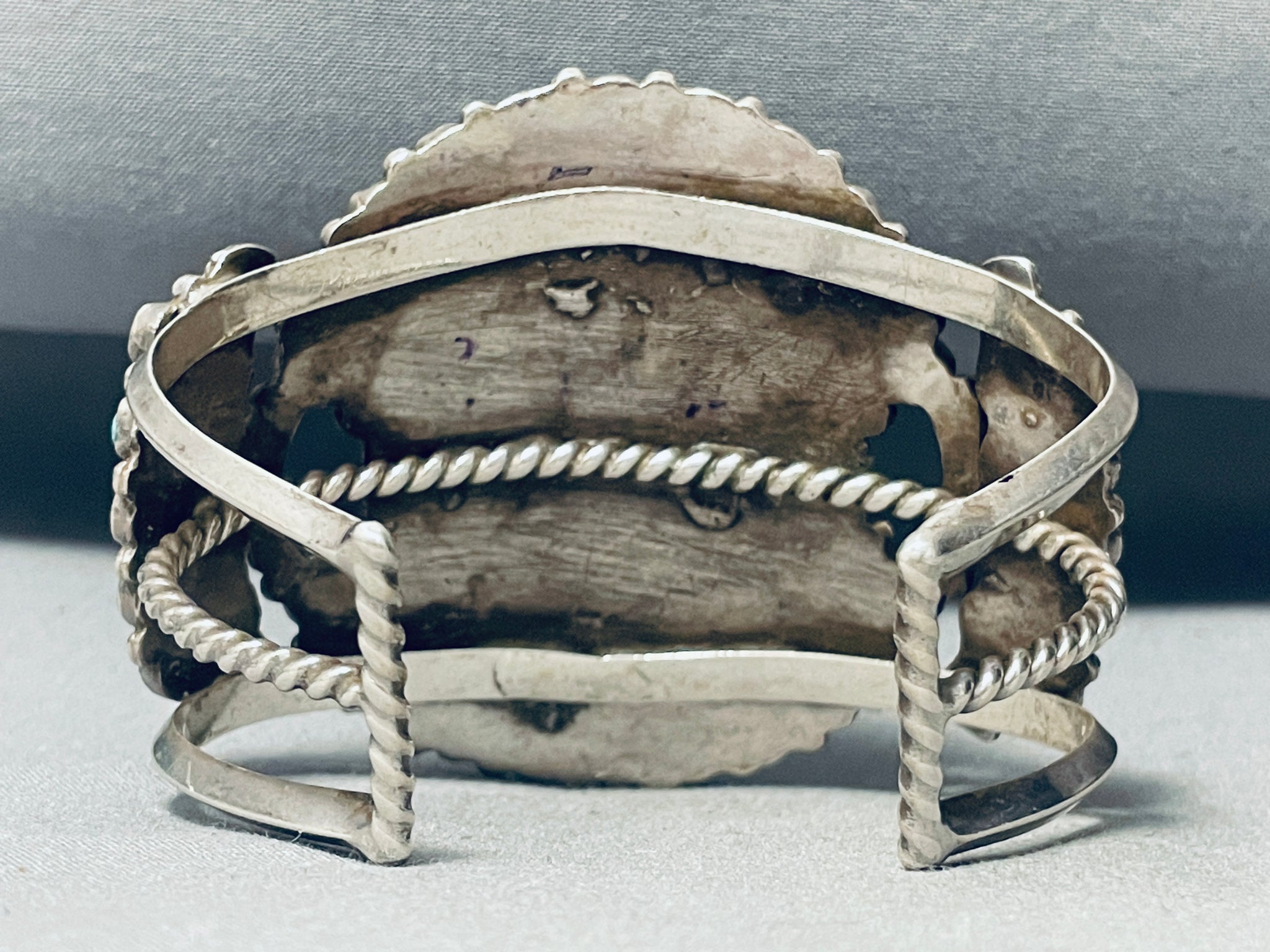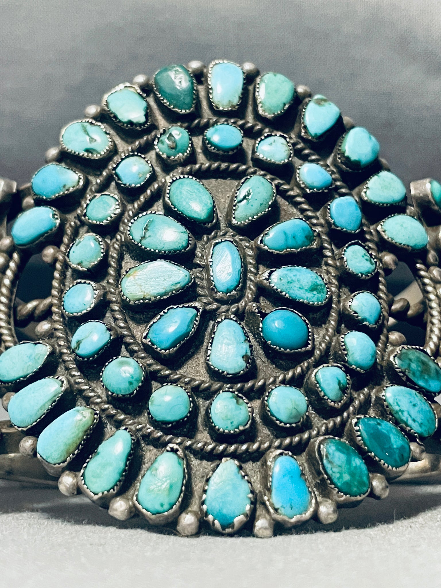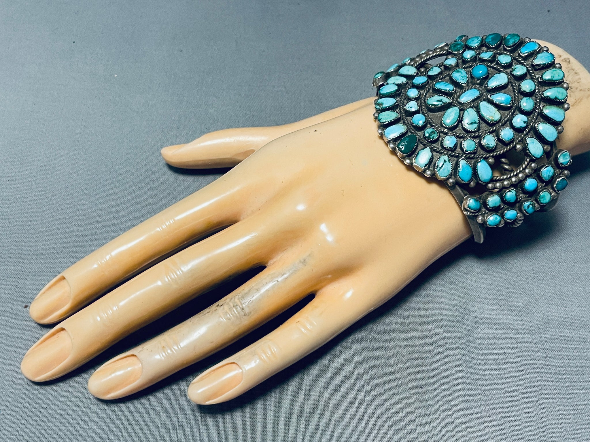 This is an astonishing vintage Navajo turquoise cluster silver bracelet. This outstanding bracelet contains a mind blowing snake eye, teardrop and oval shaped turquoise stones. The turquoise stones appear to be from the impeccable Royston and Cerrillos turquoise mines, both of which being very rare mines. The Royston Turquoise Mine is a famous turquoise mine located in Nevada, USA. It is known for producing high-quality turquoise with a distinctive color and matrix pattern. The mine has been in operation since the early 1900s and has produced some of the most valuable and sought-after turquoise in the world. The Royston Turquoise Mine is actually a collection of mines located in the Royston Hills in central Nevada. The area has been mined for turquoise by both Native Americans and non-Native Americans for centuries. The turquoise from the Royston mine is known for its unique color and matrix pattern. The turquoise can range in color from a bright blue-green to a dark green, with a brown or golden matrix running throughout the stone. The matrix is what gives Royston turquoise its distinctive look, and each stone is unique. The Cerrillos Turquoise Mine is a historic turquoise mine located in the Cerrillos Hills near Santa Fe, New Mexico, United States. It is one of the oldest and largest turquoise mines in North America, and has been a source of turquoise for over a thousand years. The turquoise from the Cerrillos Mine is known for its unique green and blue colors, as well as its distinctive matrix patterns. It was highly valued by indigenous peoples of the region, who used it for jewelry, pottery, and other decorative items. In the late 1800s, the mine became a commercial operation, and was worked by a number of different mining companies over the years. Located throughout the amazing cluster of stones are wonderful silver works that consist of raindrops and ropes. This is an absolutely beautiful turquoise silver cluster bracelet with a sturdy and thick triple silver shank cuff. The center shank is a wonderful silver rope. The width at the center of the bracelet measures around 2-1/2" while the width at the center of the triple silver shank cuff measures around 1-3/4". The stones measure around 1/4" x 3/16". Sterling silver. Cir. Mid century . The inside end to end measures around 5-1/2" with an additional 1-1/4" gap. Sturdy 66 grams.