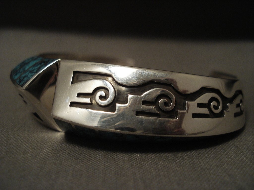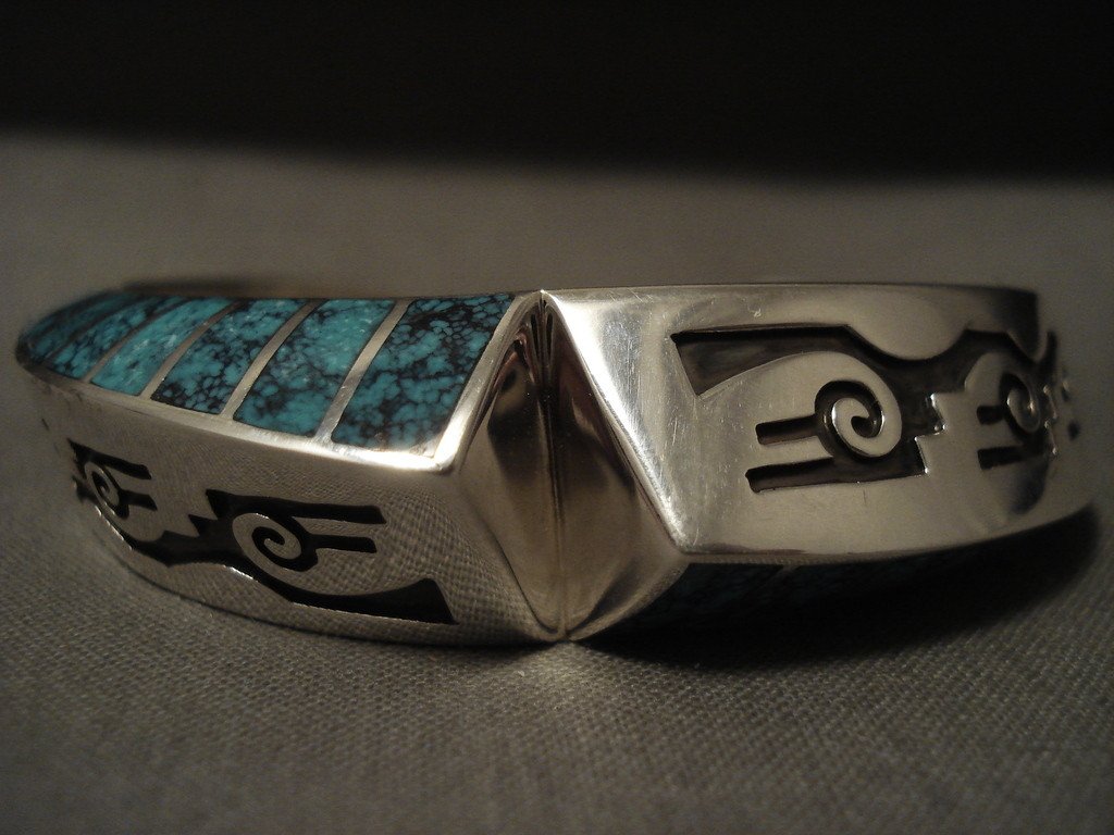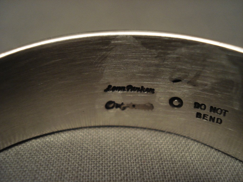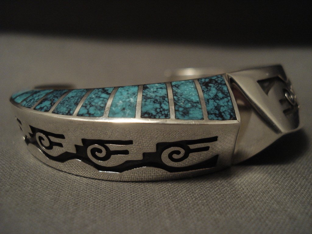 This is a wonderful Navajo Native American jewelry Native American jewelry inlay silver bracelet handmade by the famous artist Lonn Parker. This piece is one of the finest Lonn Parker bracelets we have ever seen. This piece contains both inlay and overlay sterling works. What makes this piece very special is the turquoise which is just amazing and really looks like Lone Mountain turquoise which is one of the most rare turquoise in the world. Located on the uniquely shaped silver cuff are outstanding geometric silver works. The width of the bracelet measures around 5/8". Signed by Navajo Native American jewelry Native American jewelry artist, Lonn Parker . Sterling silver, marked. The inside end to end measures around 5" with an additional 1" gap. Sturdy 30 grams. LAYAWAYS- We are happy to work with you and are more flexible than anyone on the net. Simply send us an email for more information.